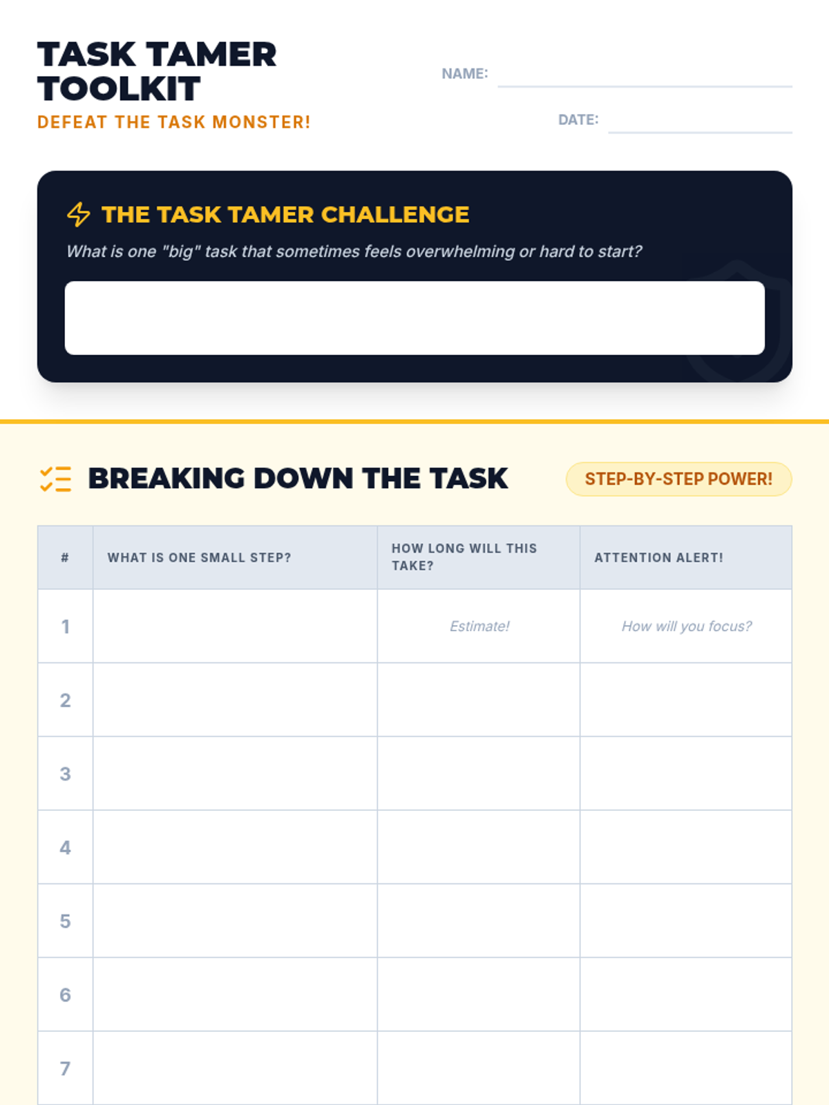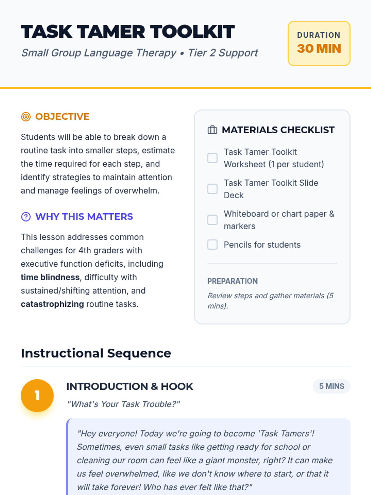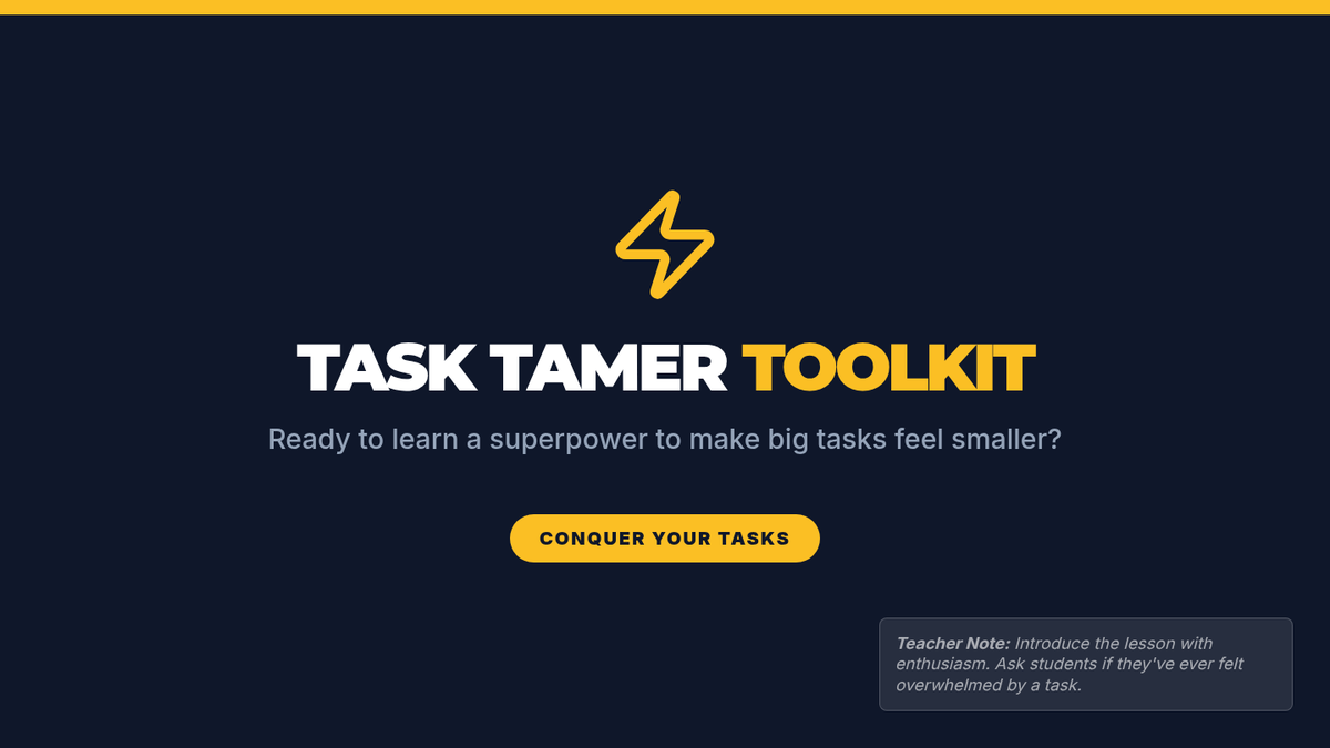 A 30-minute small-group lesson for 4th graders with executive function challenges. Students learn to 'tame' overwhelming tasks by breaking them into manageable steps, estimating time, and using coping strategies for focus and regulation.