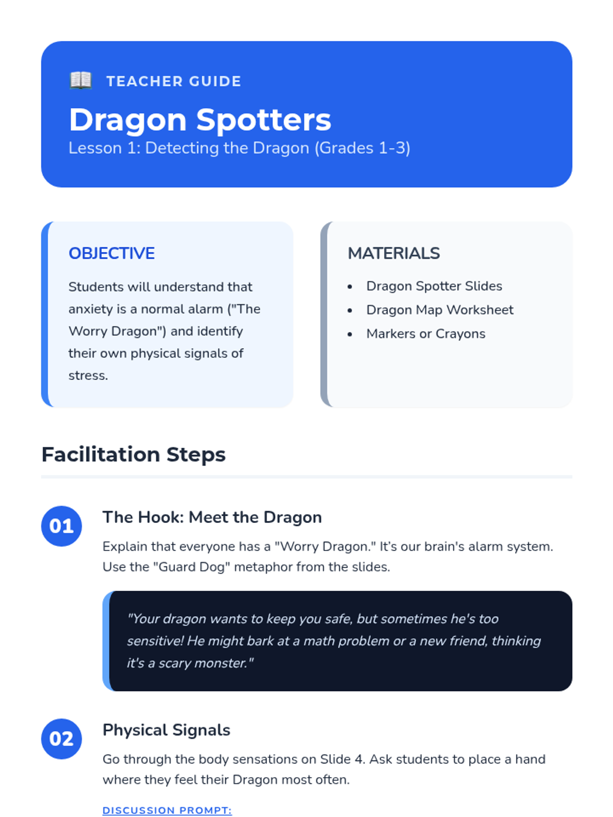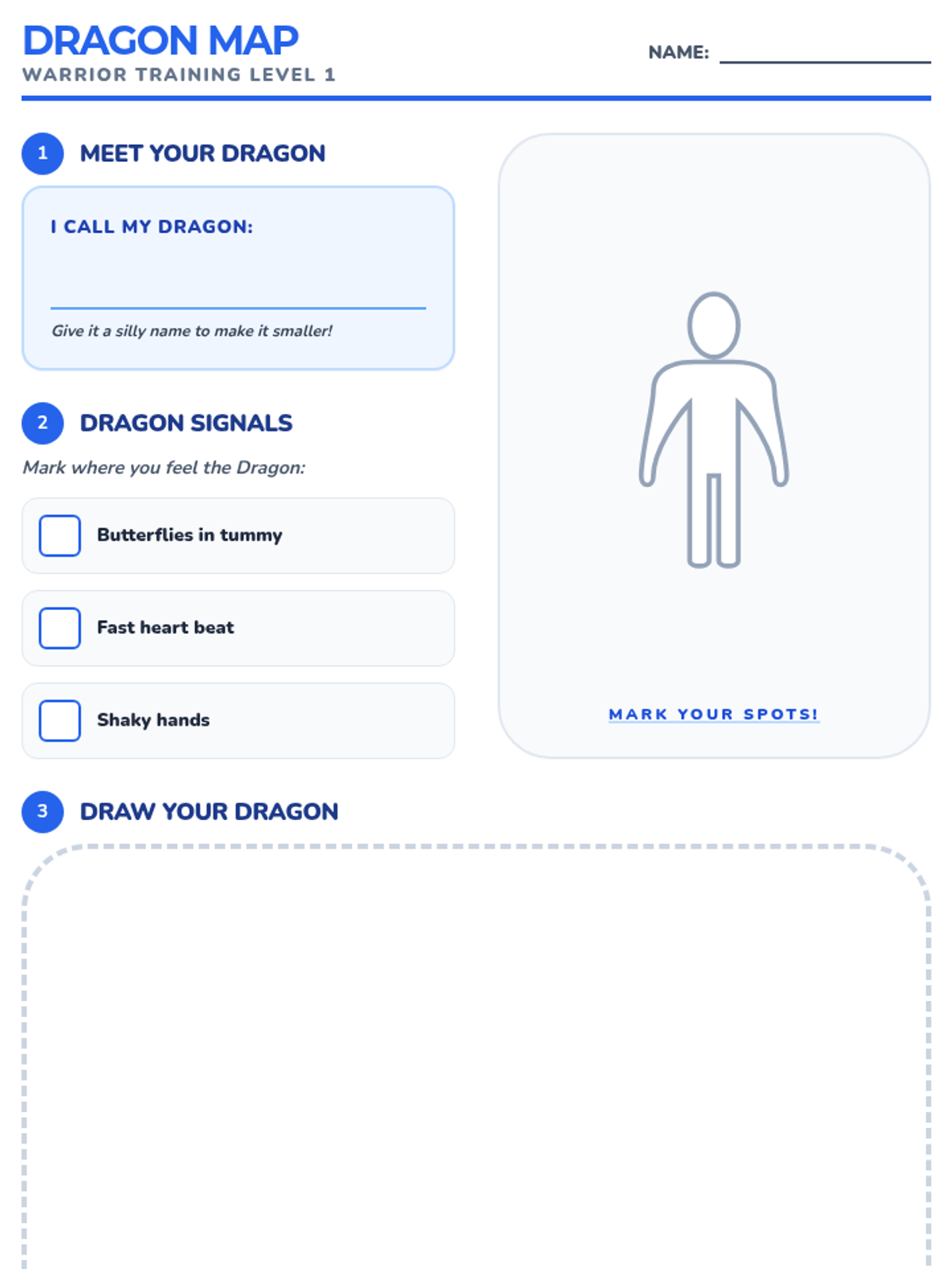 Students learn to identify where they feel anxiety in their bodies and name their 'Worry Dragon' to make feelings feel less scary.