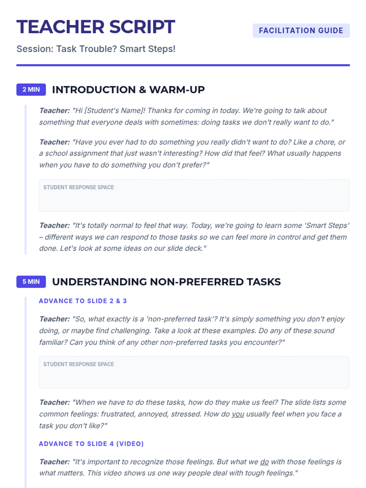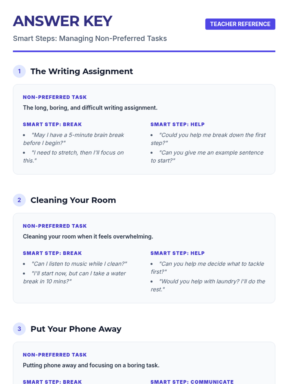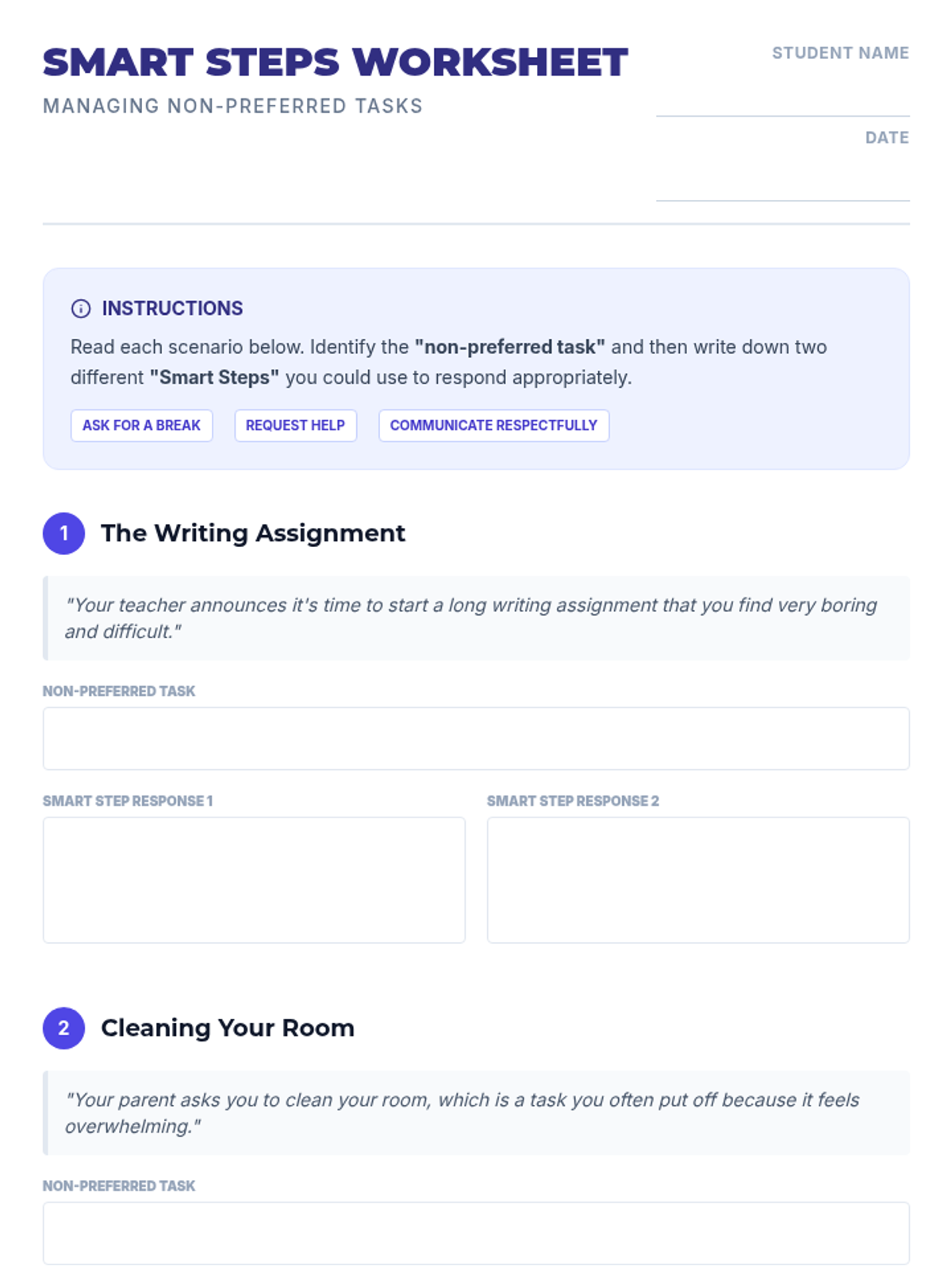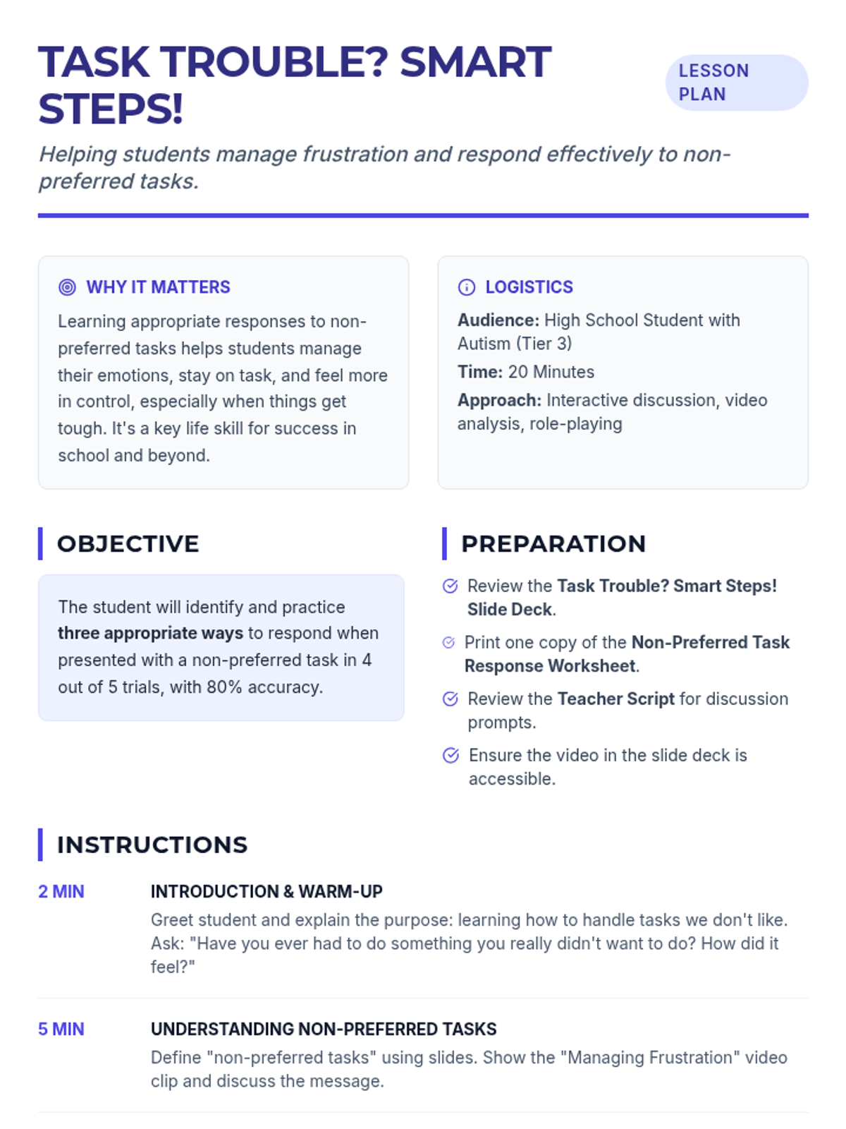 A 20-minute individual counseling session for high school students with autism to develop appropriate responses to non-preferred tasks using 'Smart Steps'.