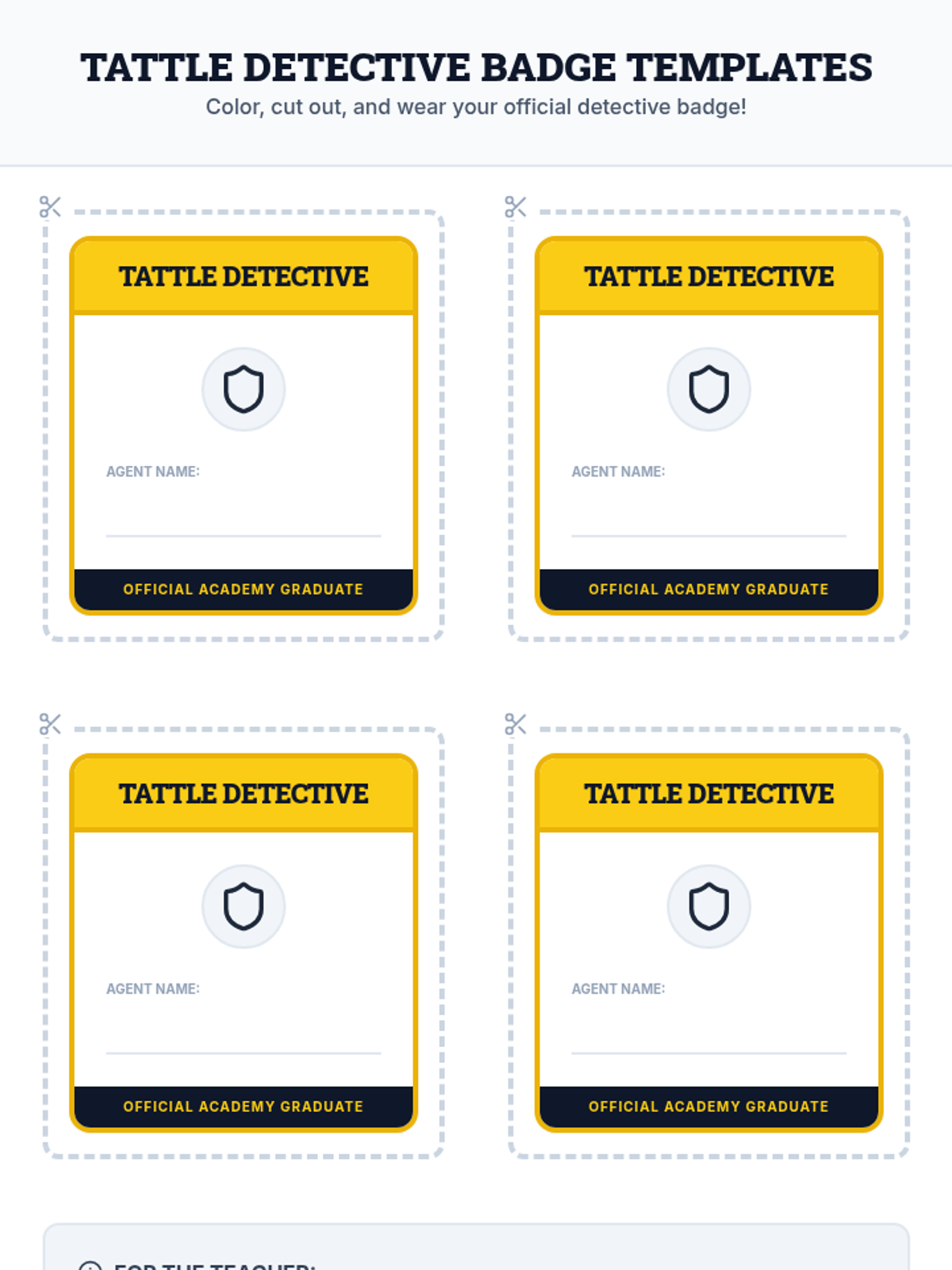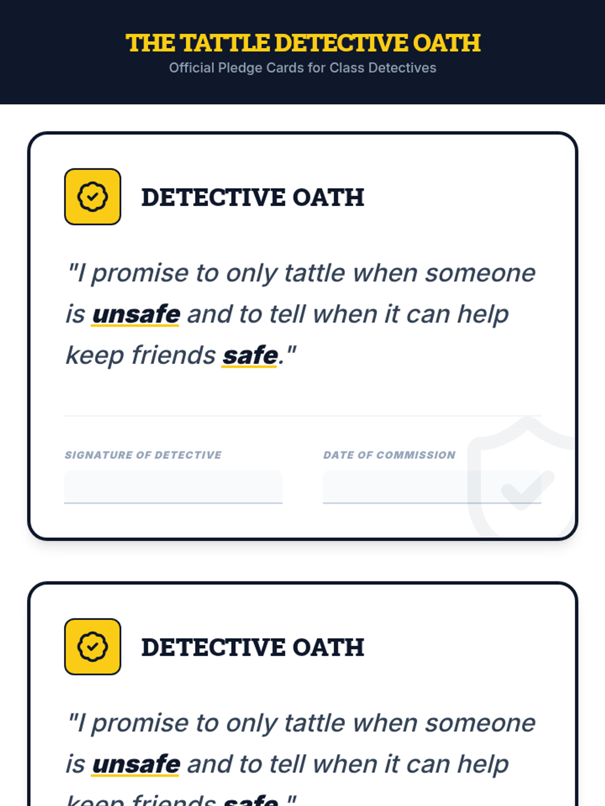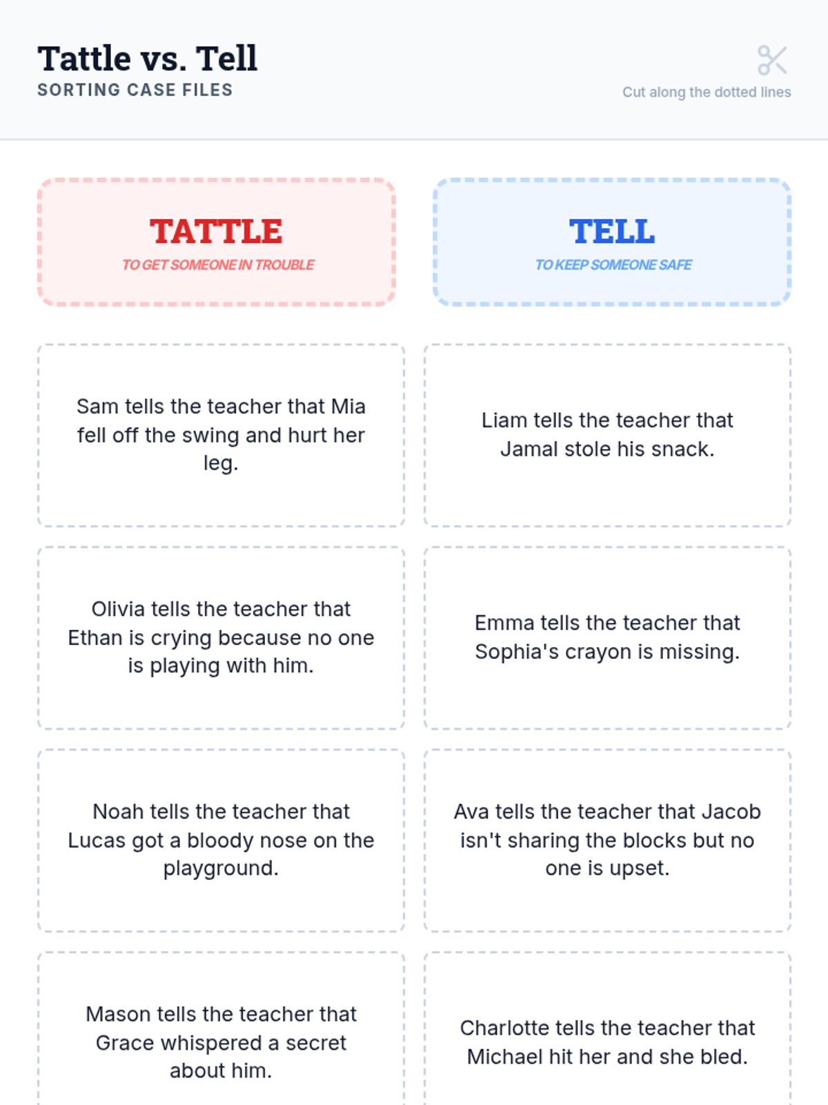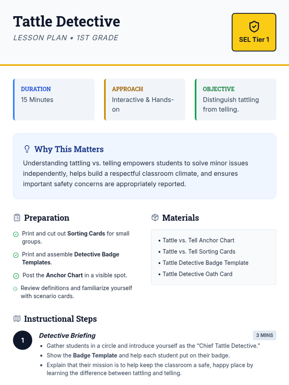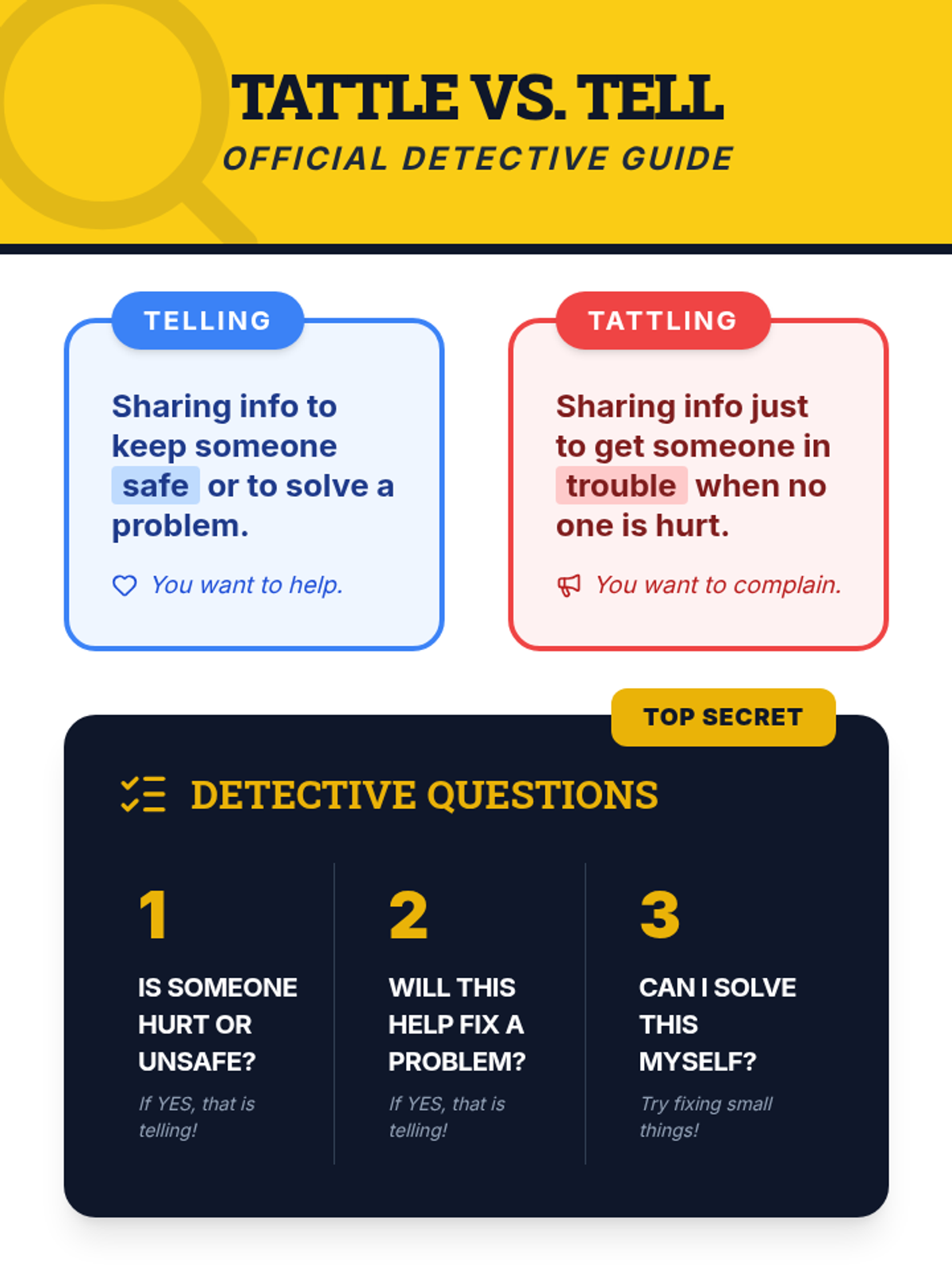 A social-emotional learning lesson for 1st graders to distinguish between 'tattling' (reporting to get someone in trouble) and 'telling' (reporting to keep someone safe). Students earn their 'Tattle Detective' badges by practicing with real-world scenarios.