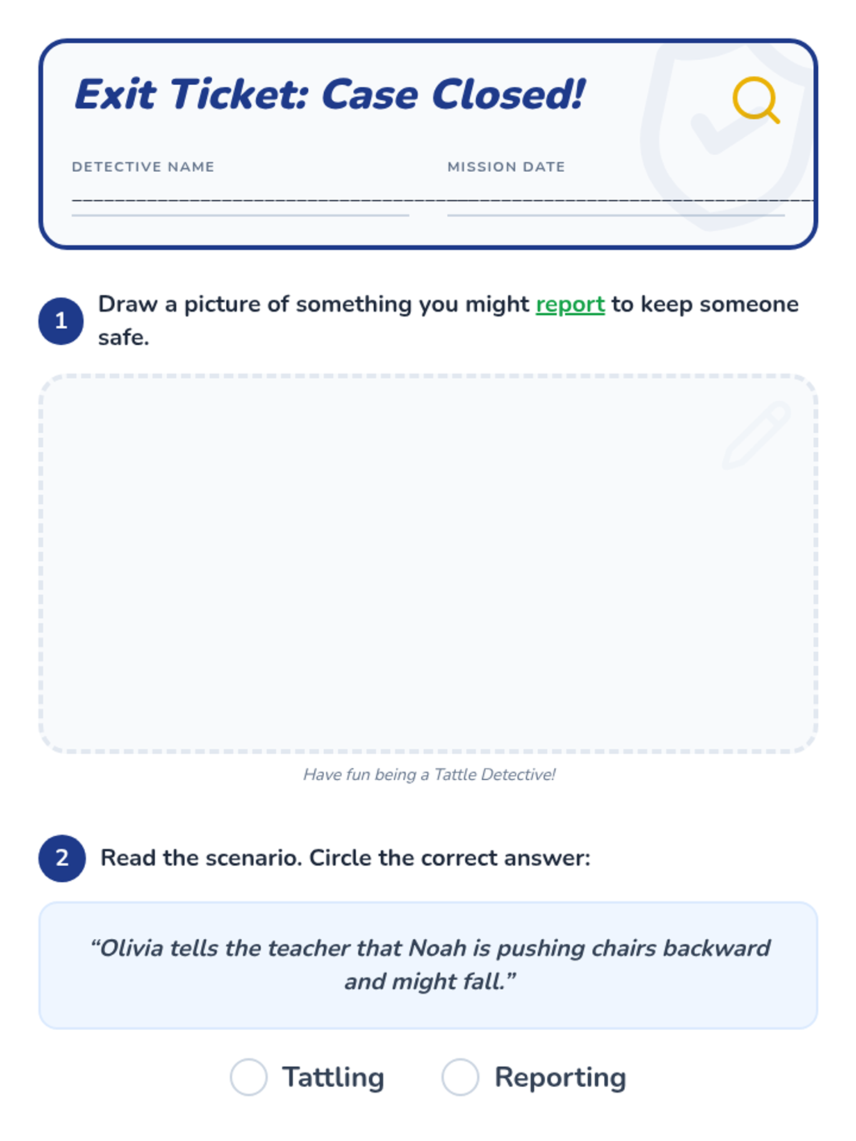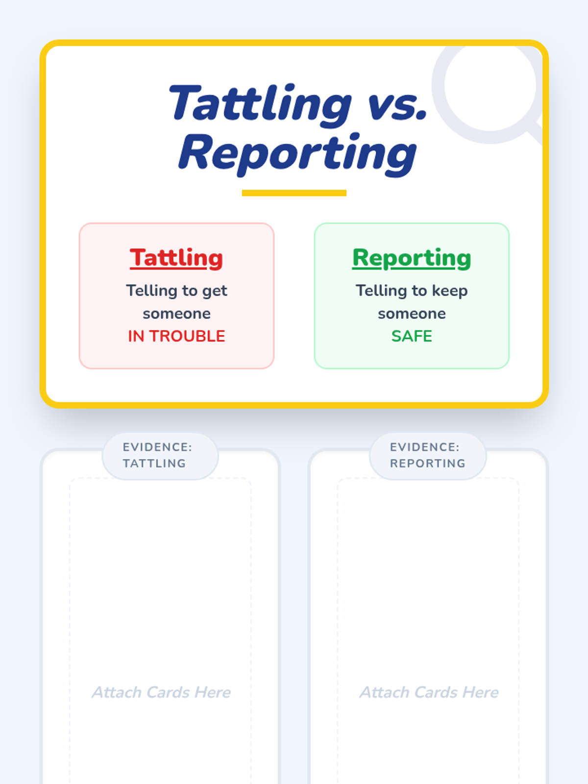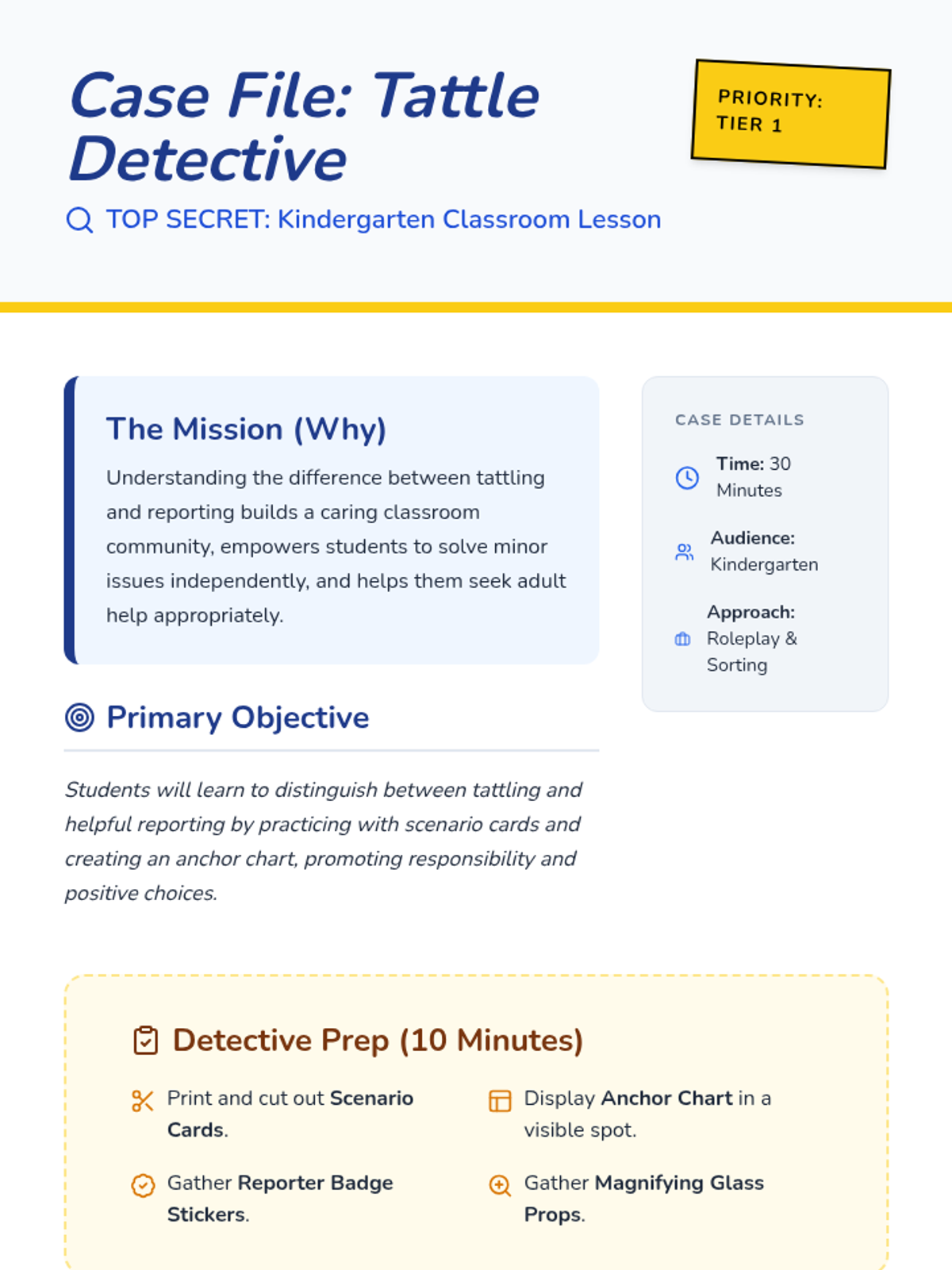 In this engaging 30-minute lesson, kindergartners learn the difference between tattling and reporting helpfully. Through interactive activities and a fun detective theme, students practice making positive choices. This Tier 1 classroom lesson builds community and encourages responsibility.