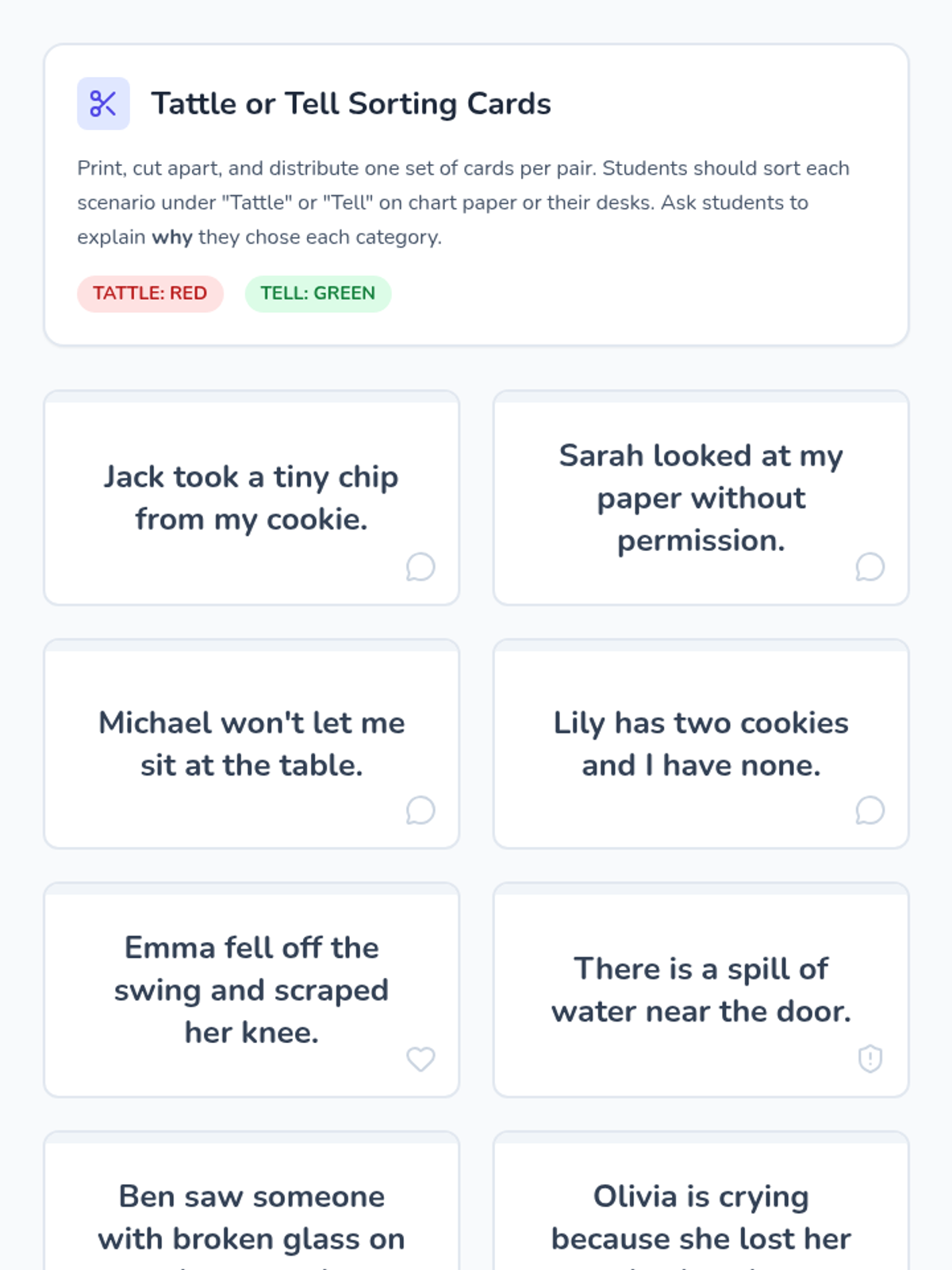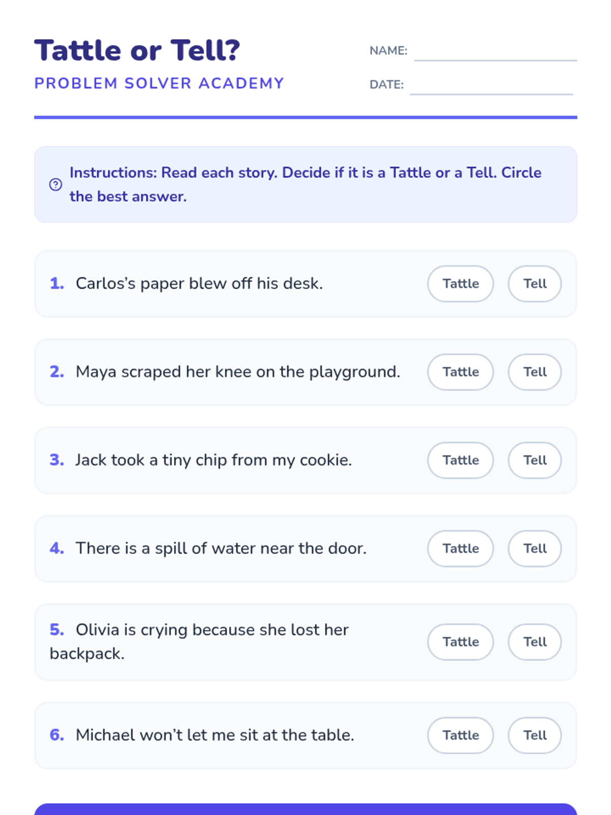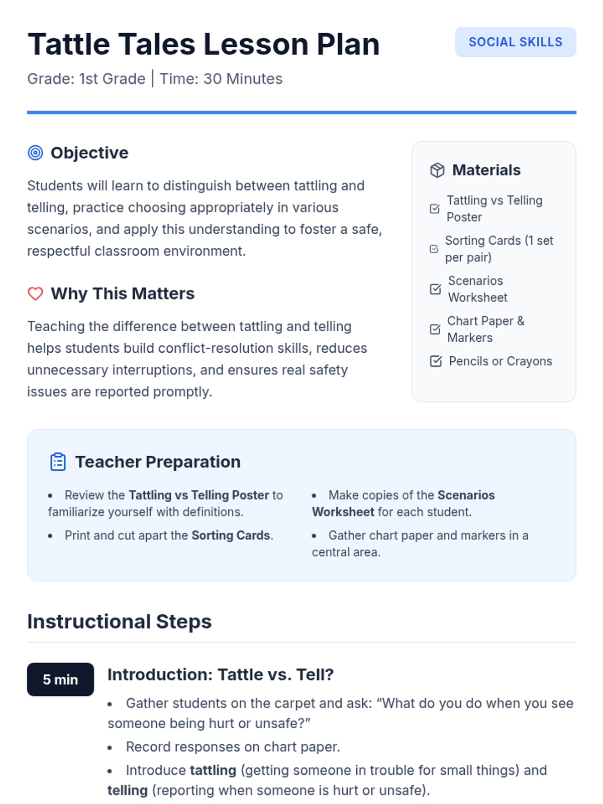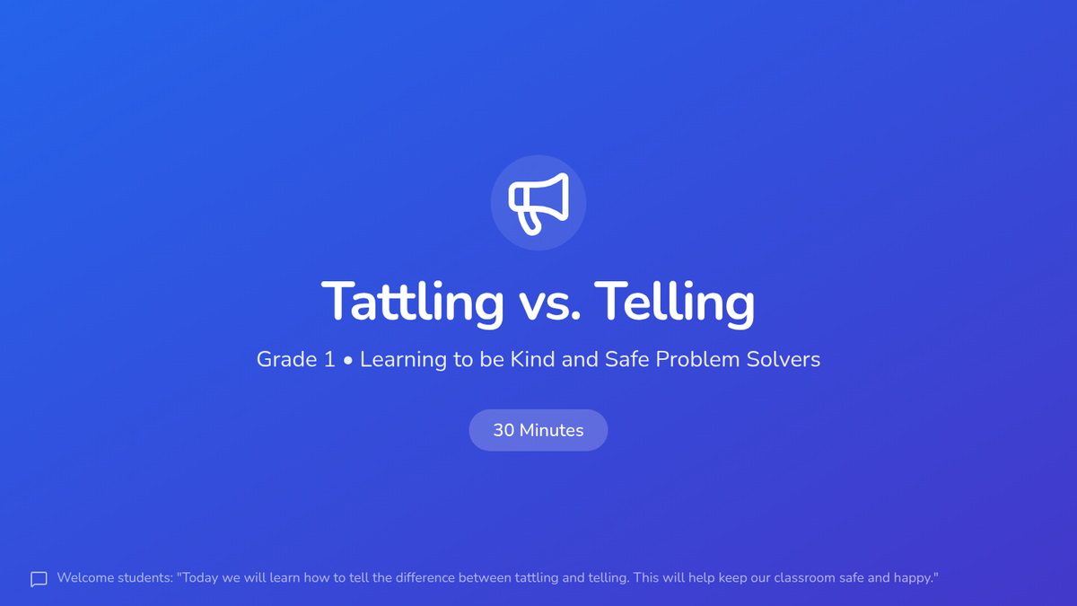 A 1st-grade lesson designed to help students distinguish between tattling and telling, empowering them to solve minor conflicts independently while knowing when to seek help for safety.