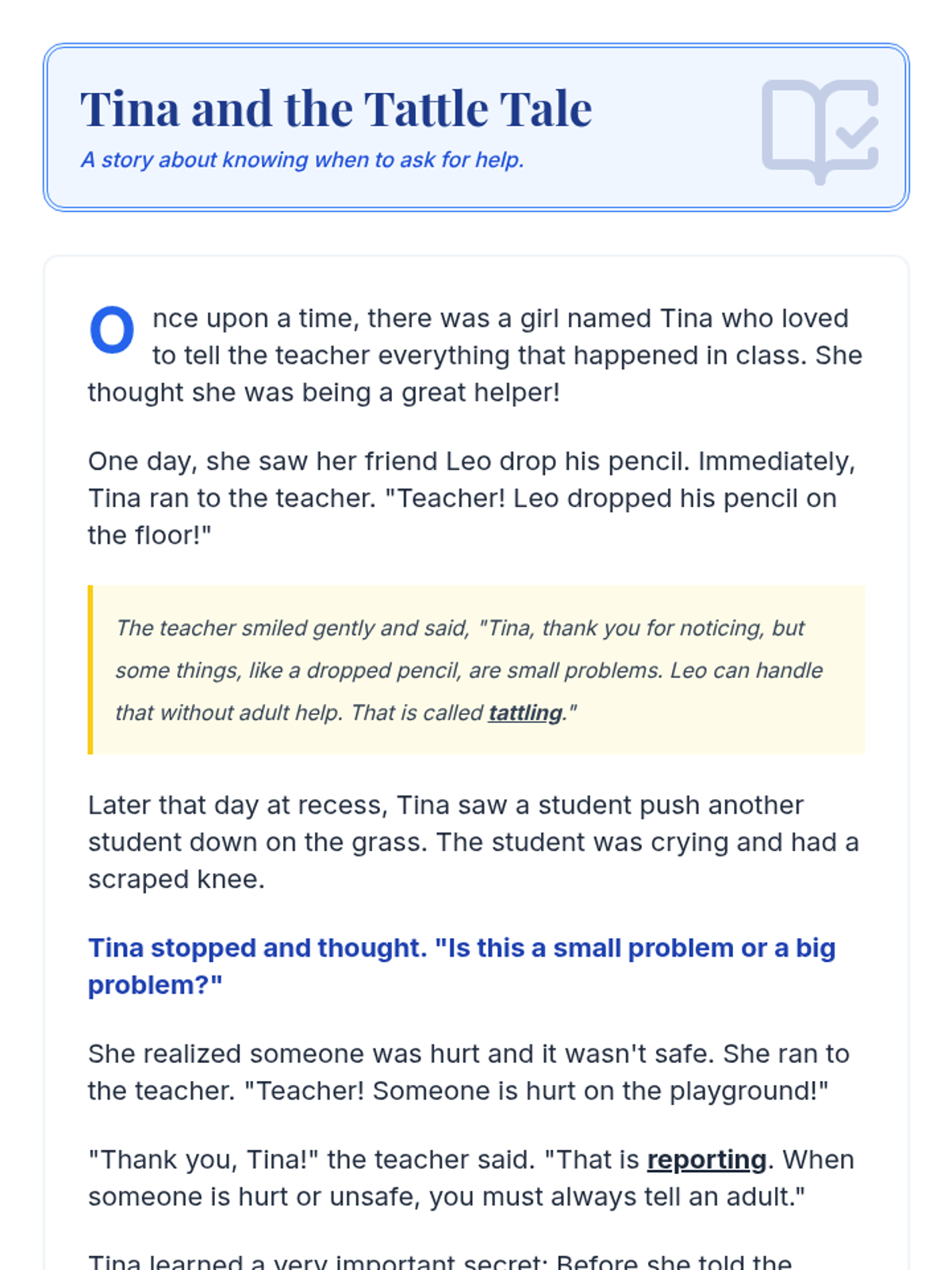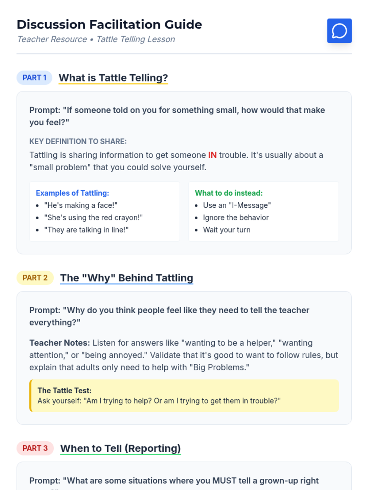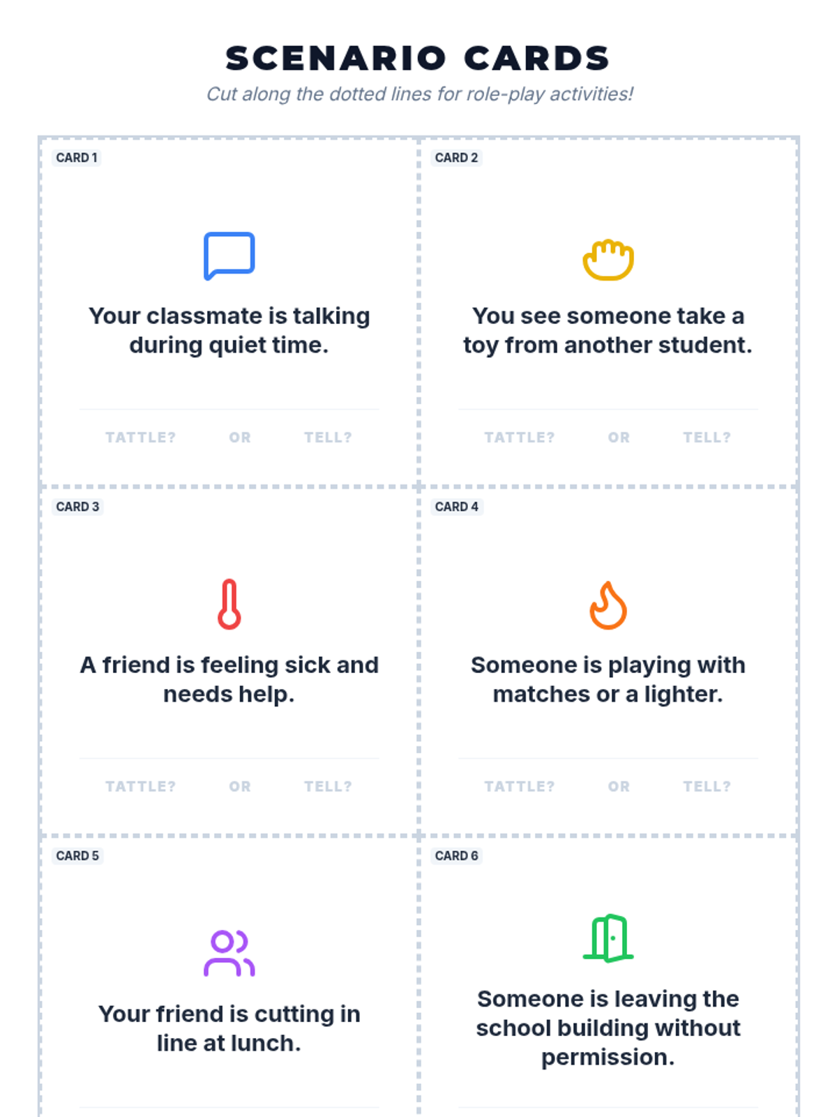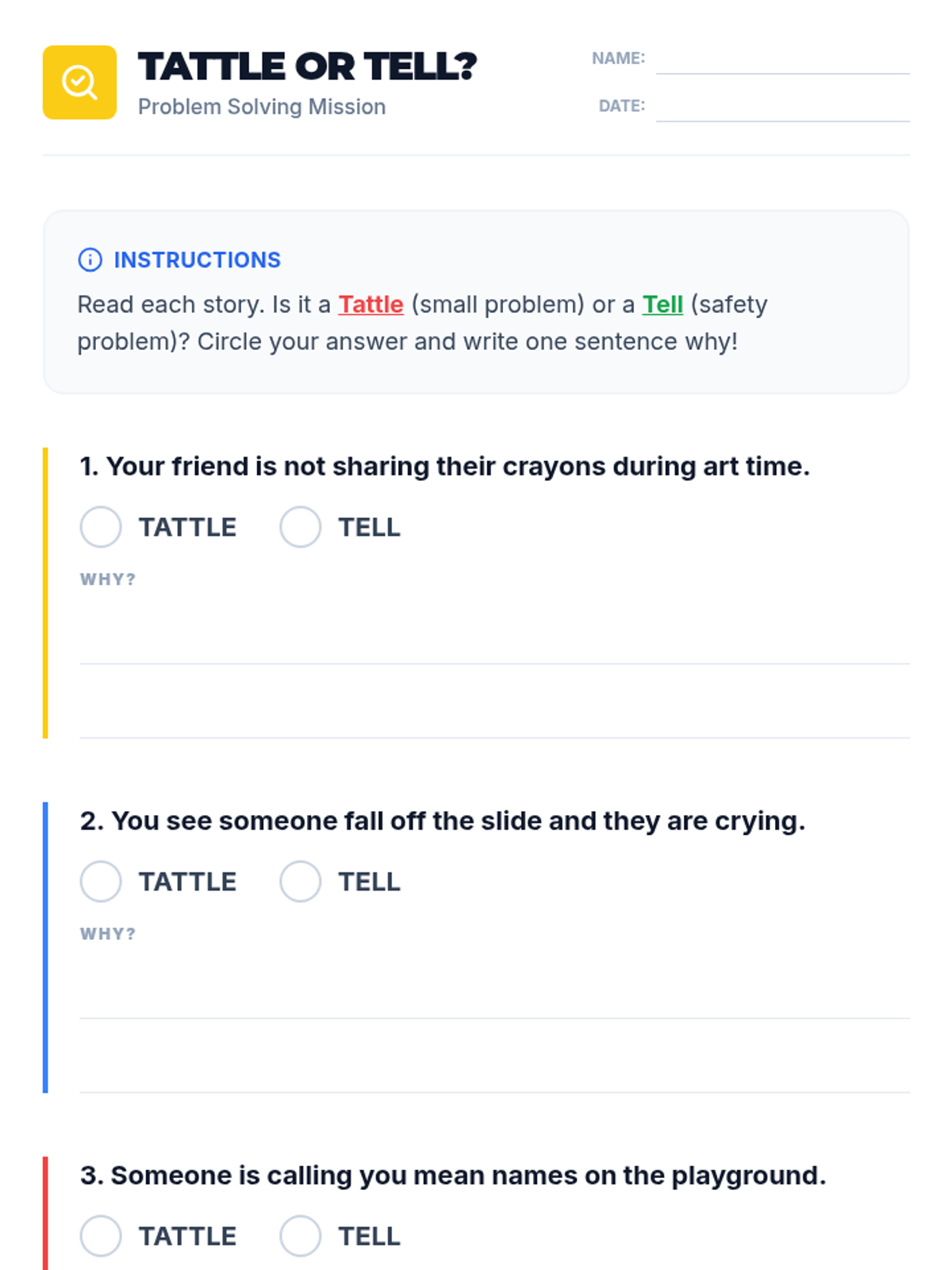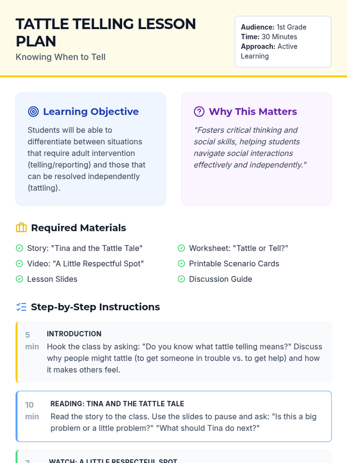A social-emotional learning lesson for 1st graders to distinguish between tattling and reporting (telling). Students explore scenarios to determine when to solve problems independently and when to seek adult help for safety.