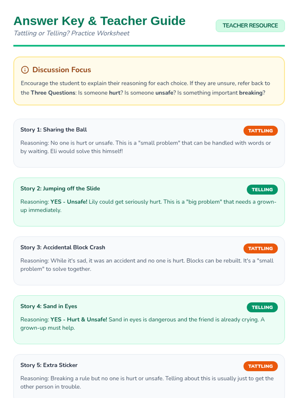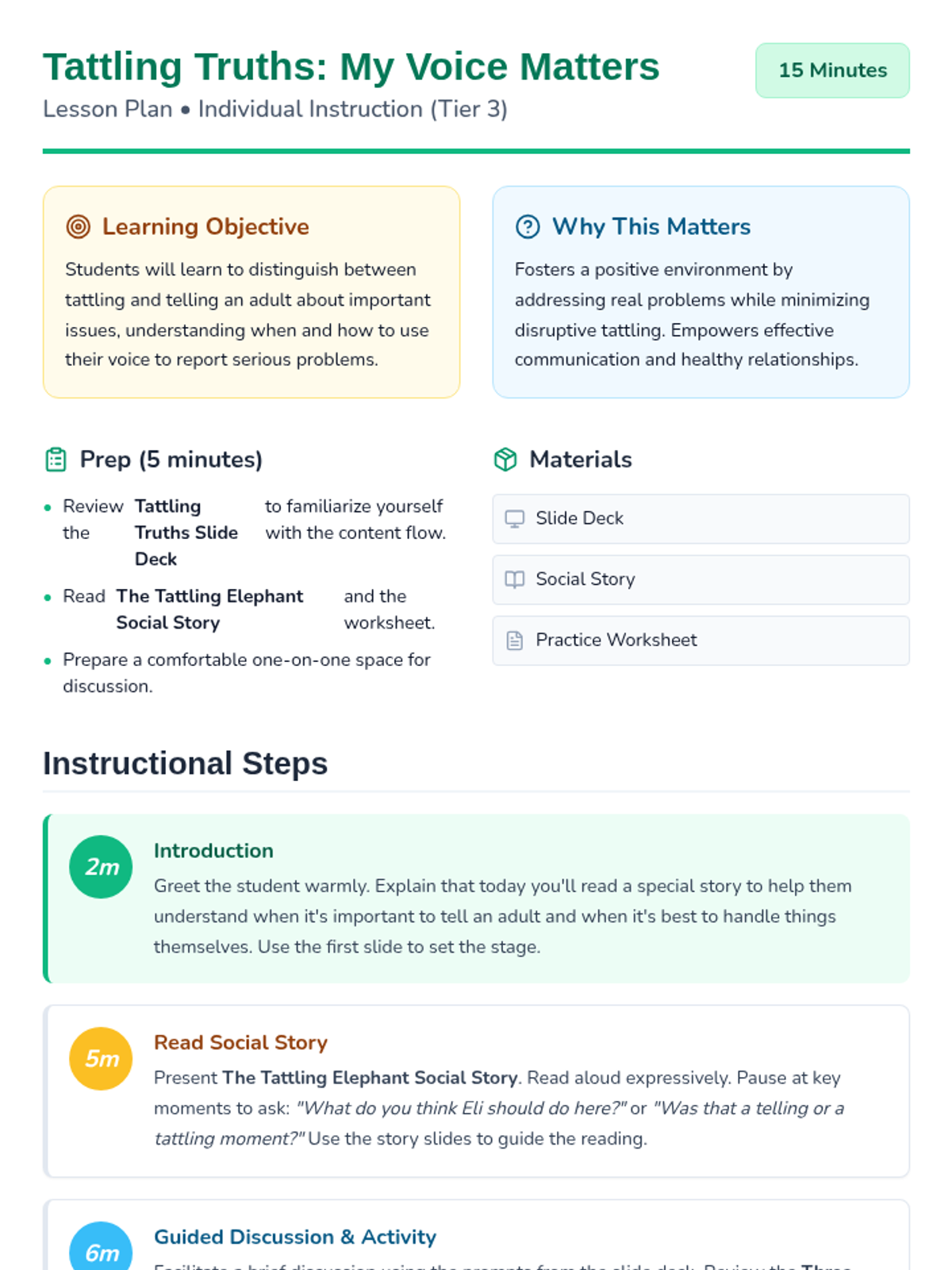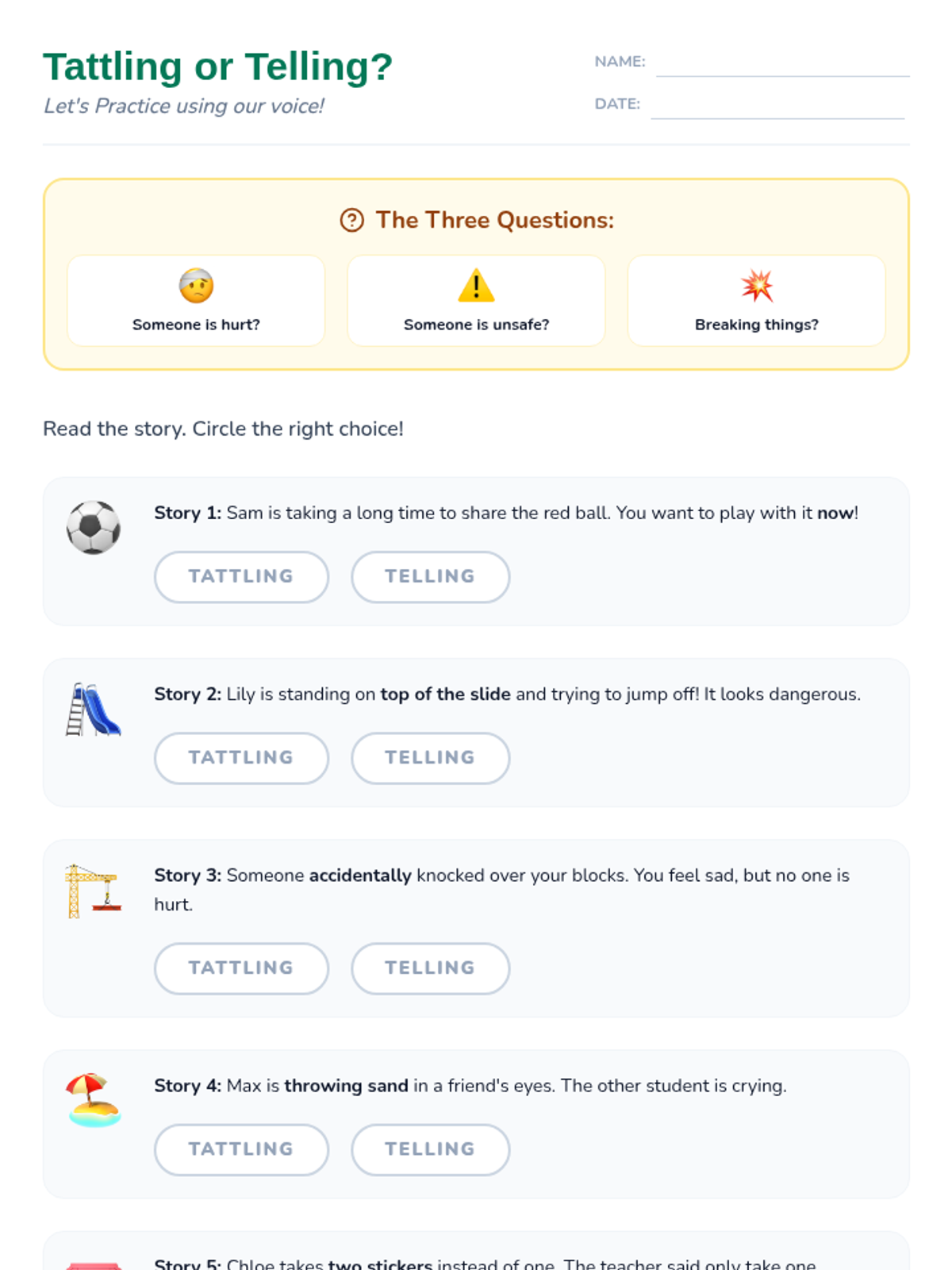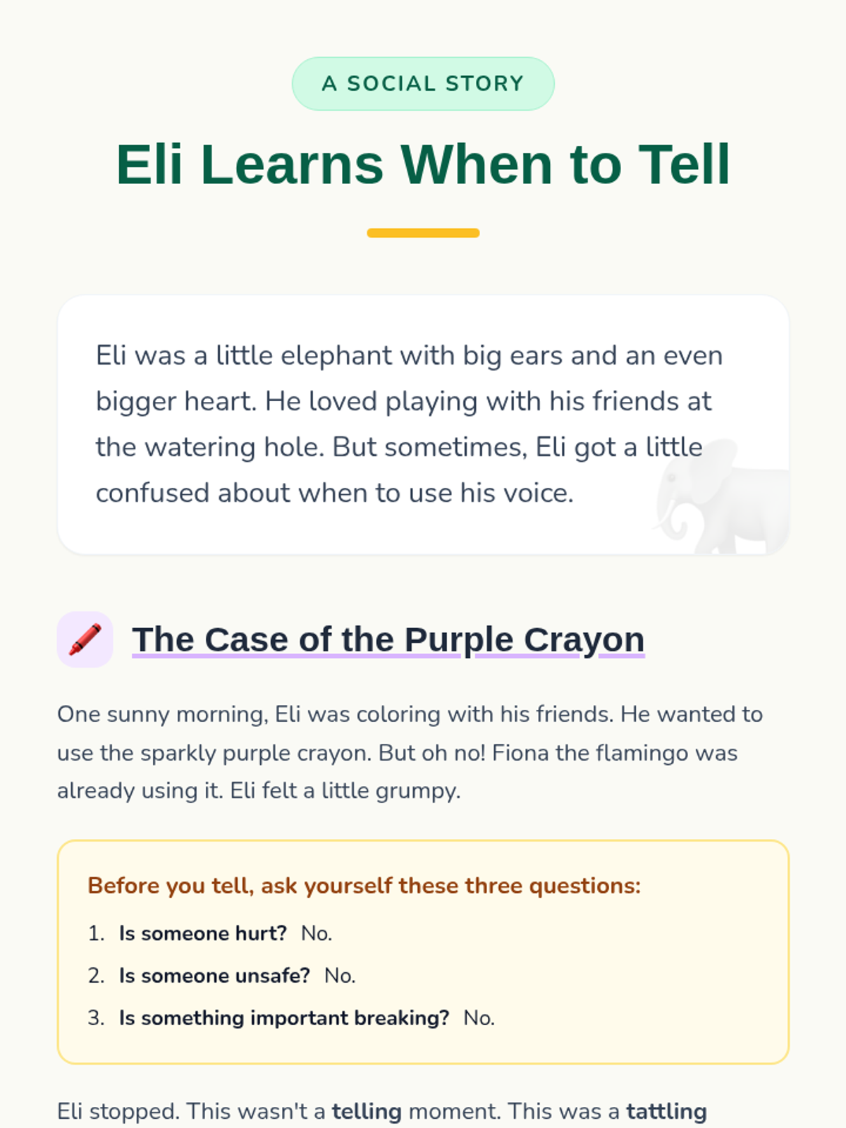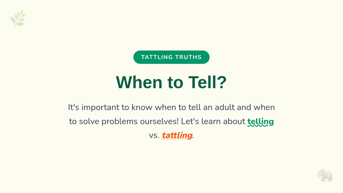 A short, interactive social story designed to help Kindergarten students understand the difference between tattling and telling an adult about a serious problem. This individual lesson focuses on empowering students to use their voice appropriately.