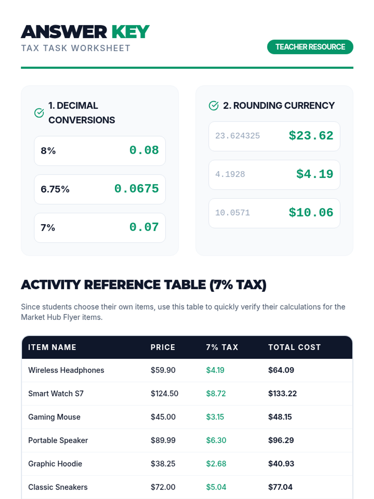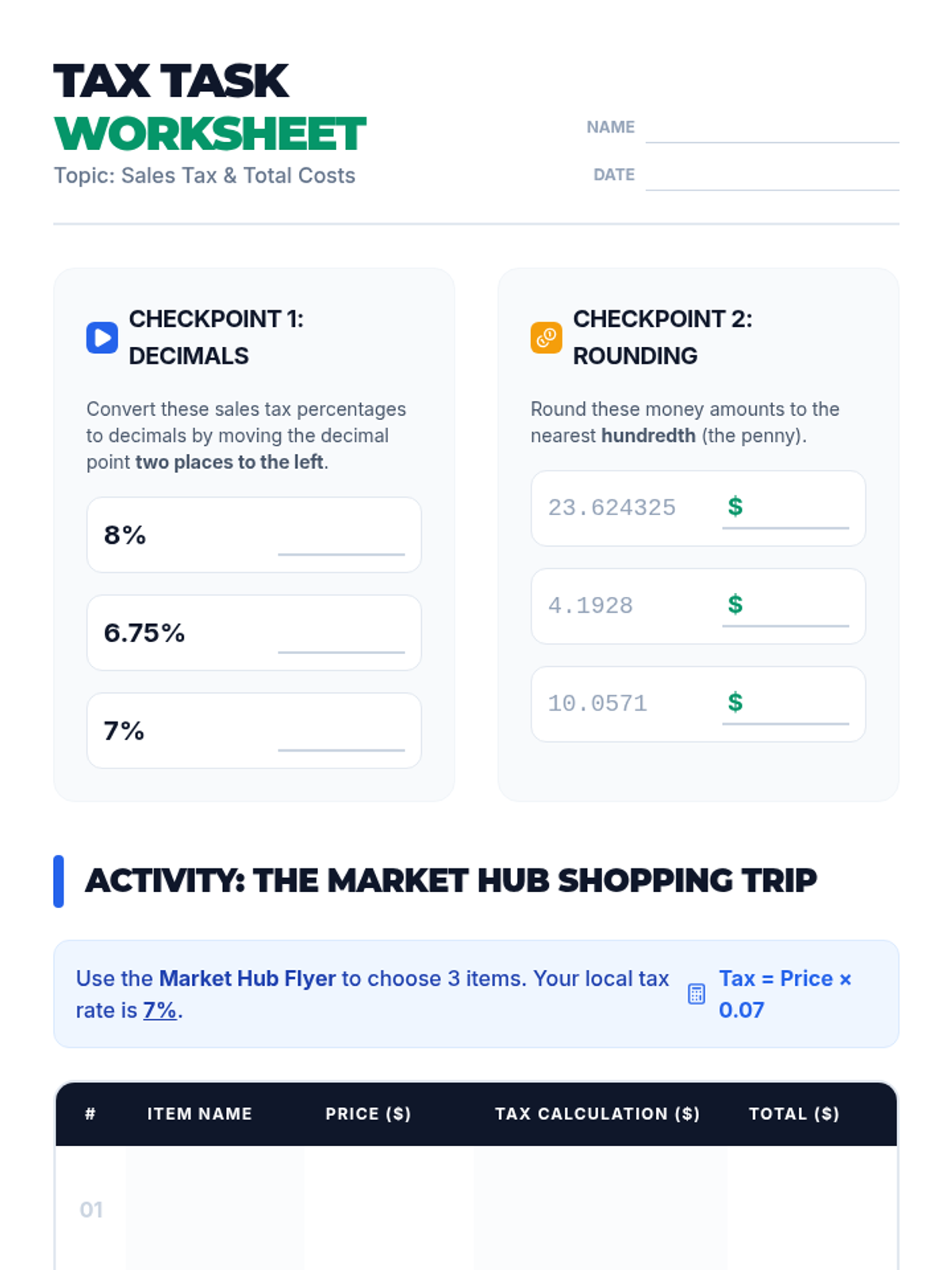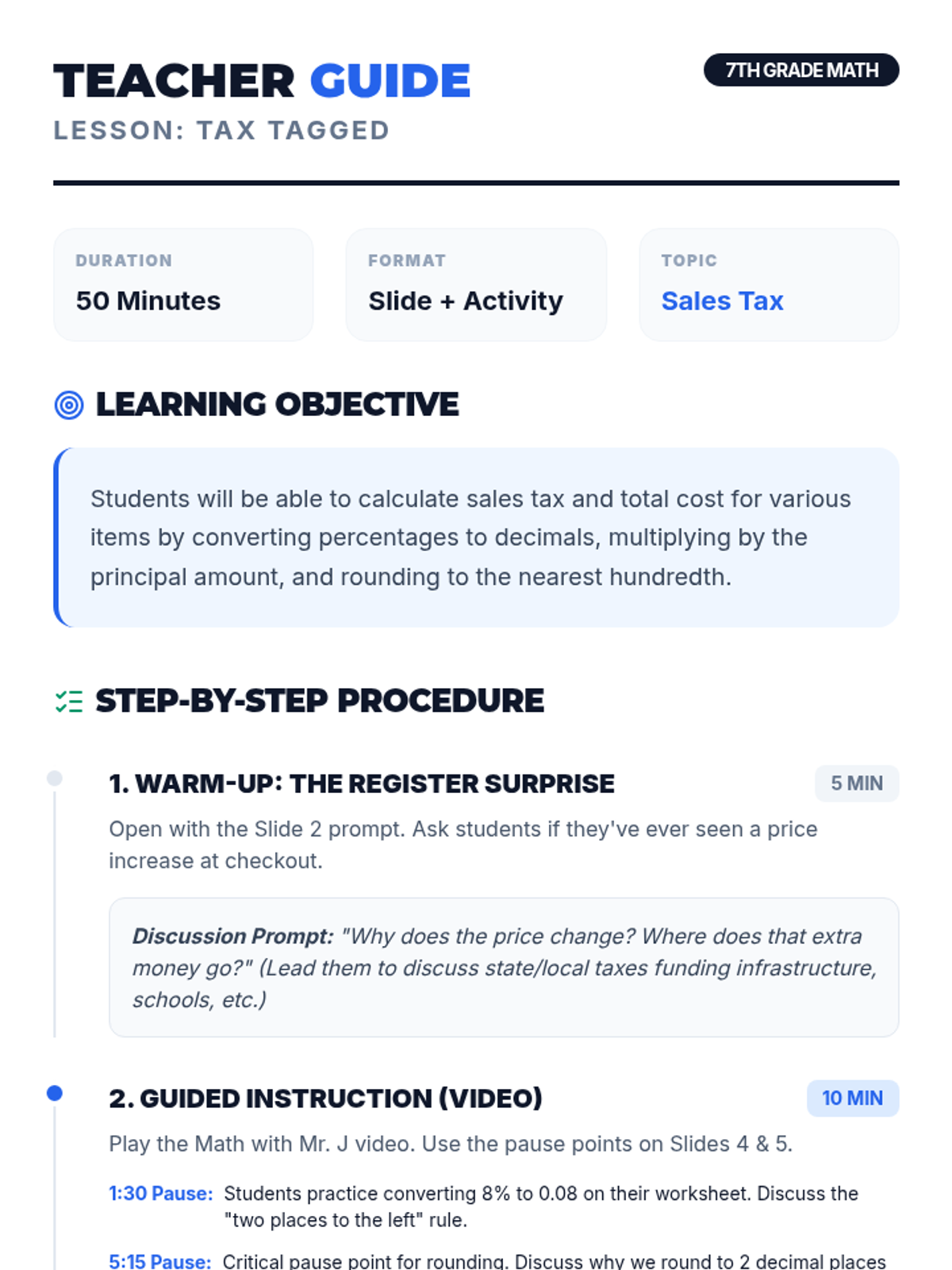 Students learn to calculate sales tax and total costs using real-world scenarios, featuring a video by Math with Mr. J and a hands-on 'Class Store' shopping activity.