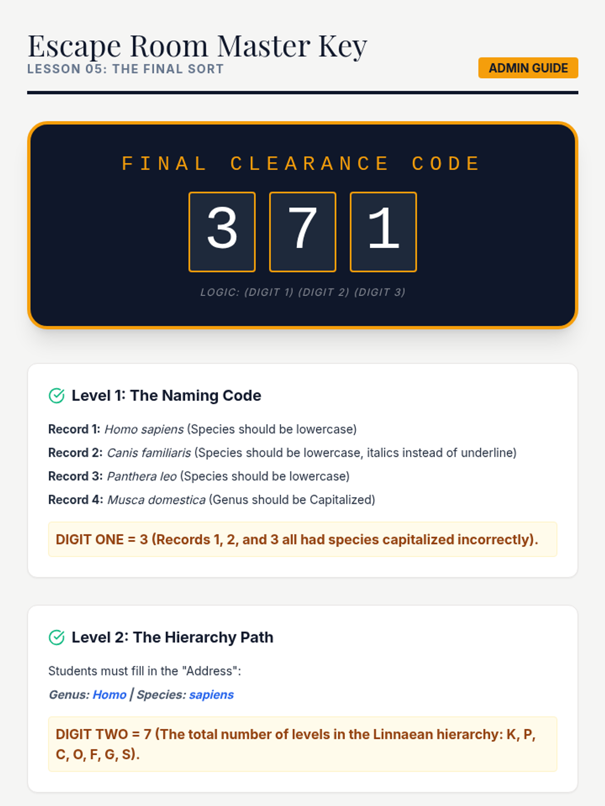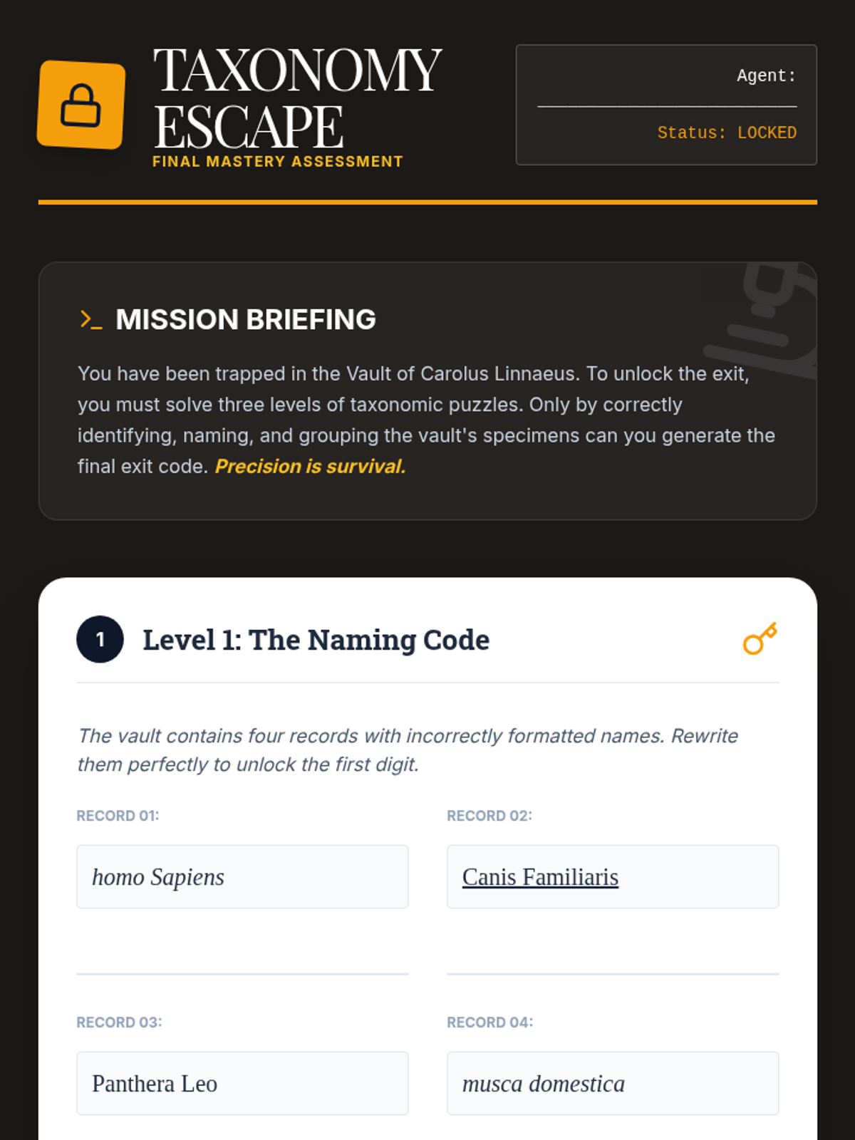 A culminating assessment where students demonstrate mastery of classification, naming rules, and key usage through a themed 'Taxonomy Escape' challenge.