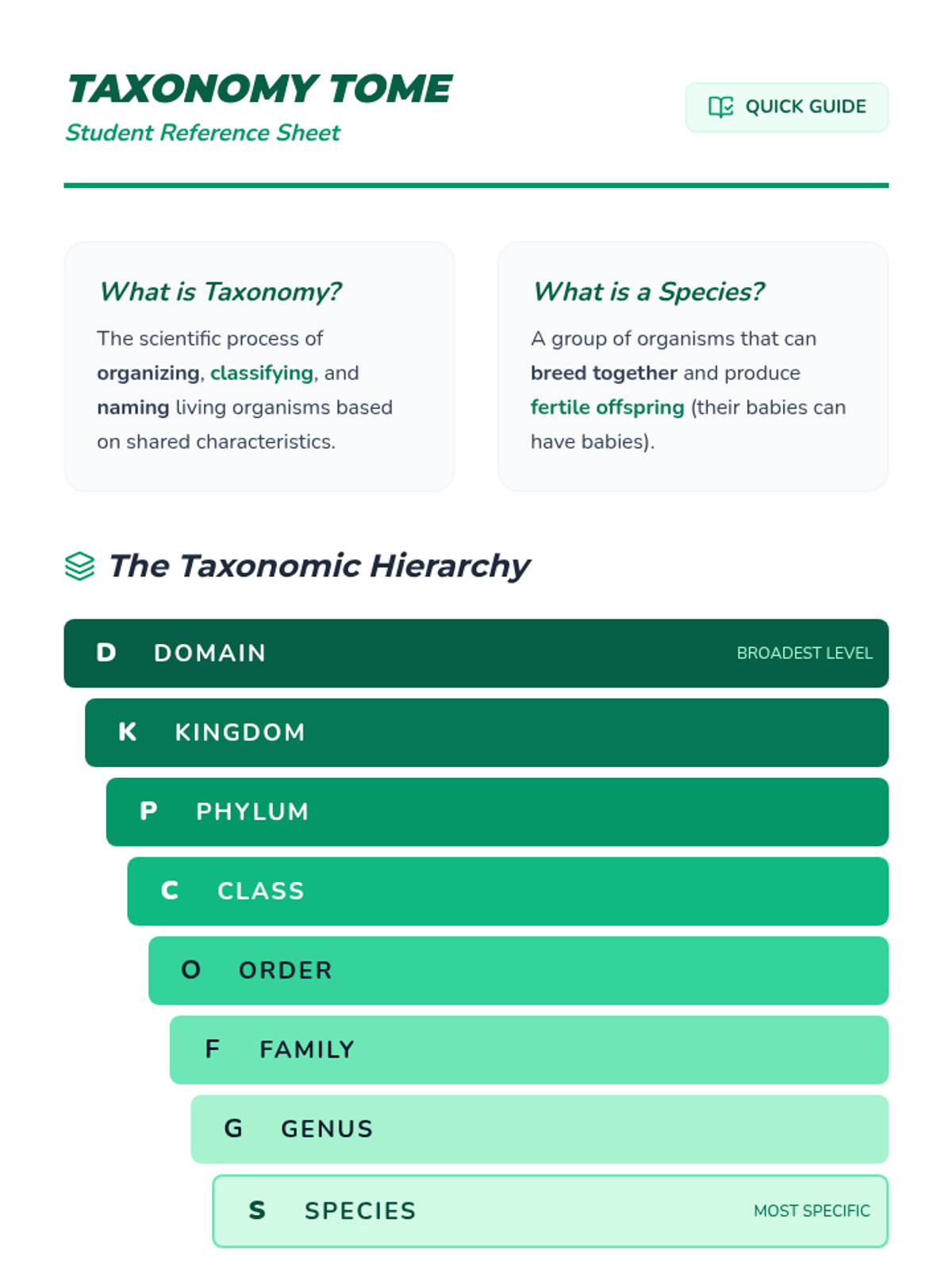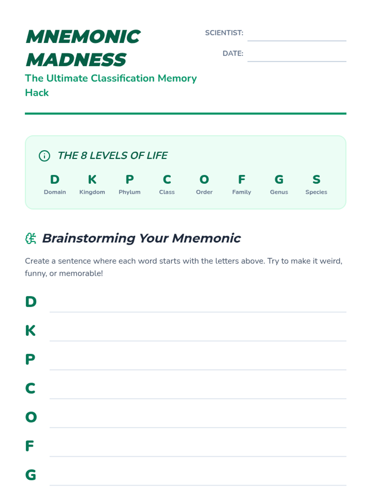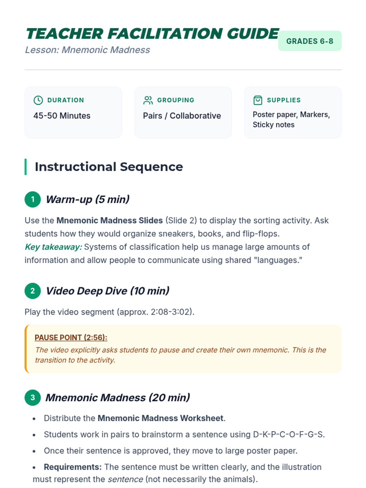 A lesson where students master the eight levels of taxonomic classification by creating and illustrating their own creative mnemonic devices. Includes a video-guided lecture, a hands-on poster project, and a gallery walk assessment.
