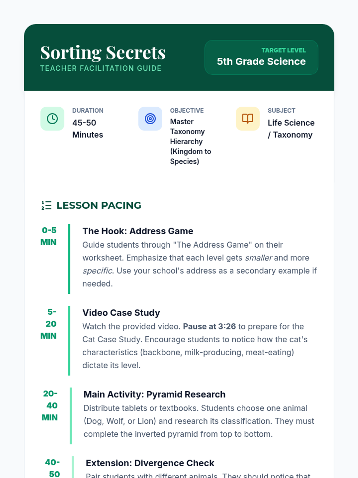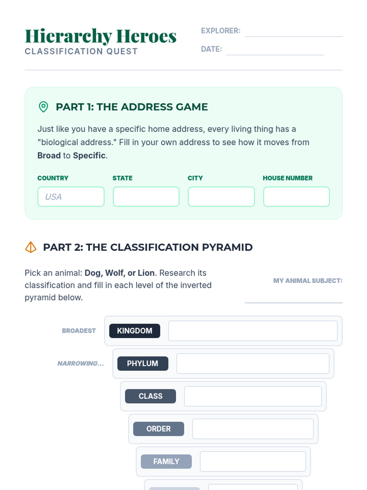 Students explore the hierarchical structure of biological taxonomy through the 'Address Game' analogy, a case study of cat classification, and a hands-on research project creating inverted classification pyramids for specific animals.