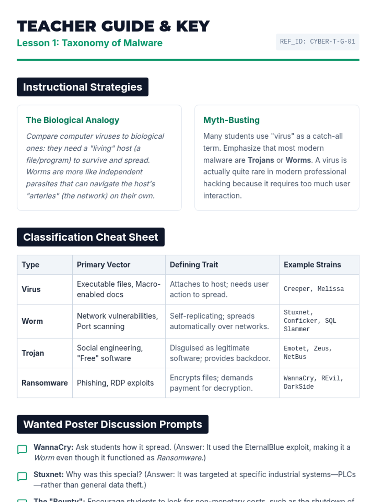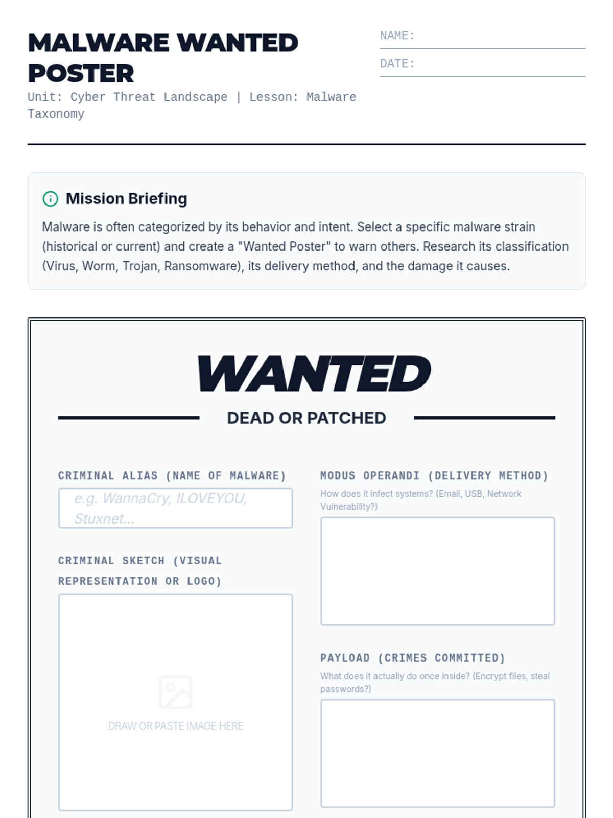 Students categorize different types of malware including viruses, worms, trojans, and ransomware, and create a 'Wanted Poster' for a specific threat.