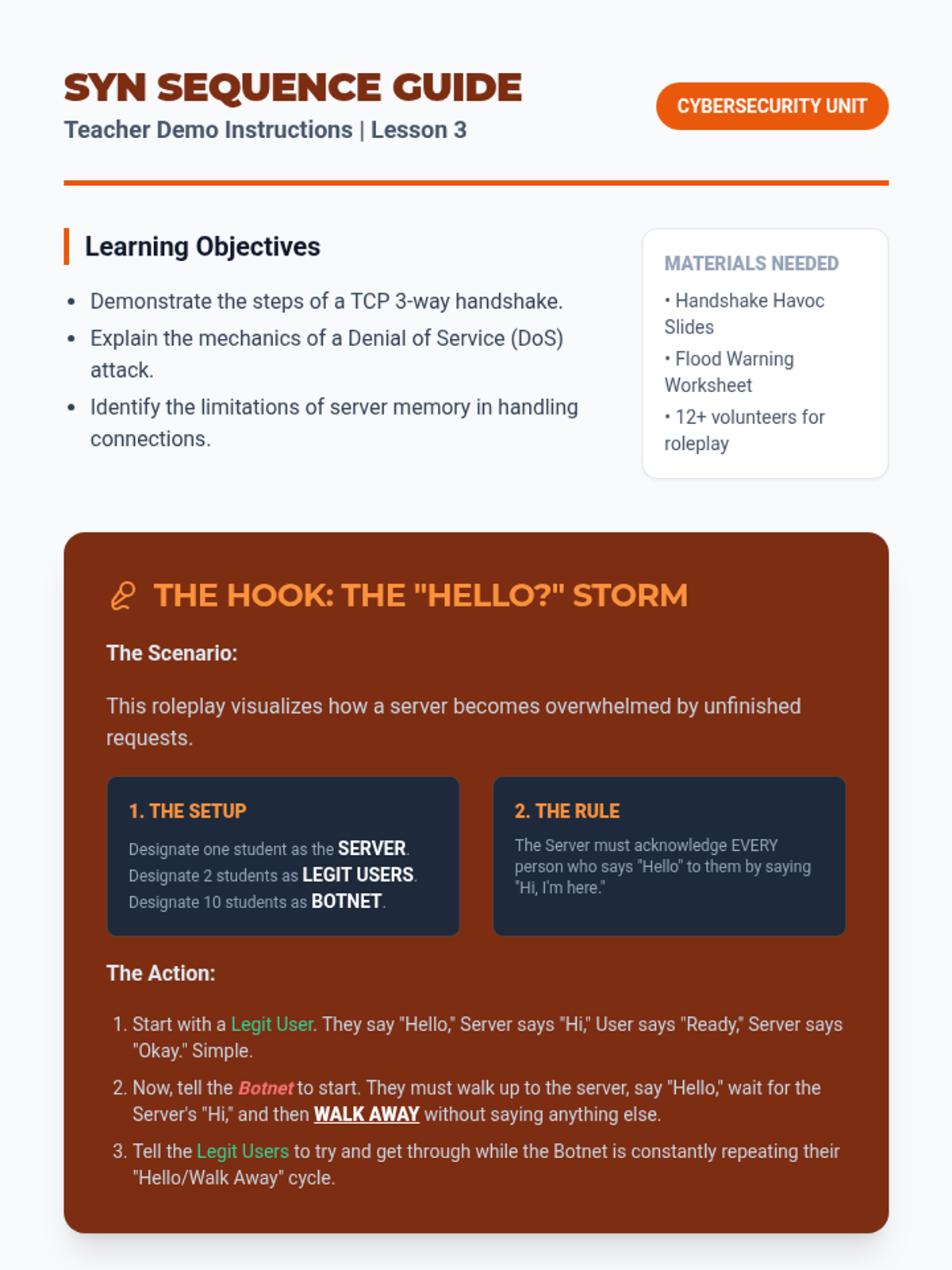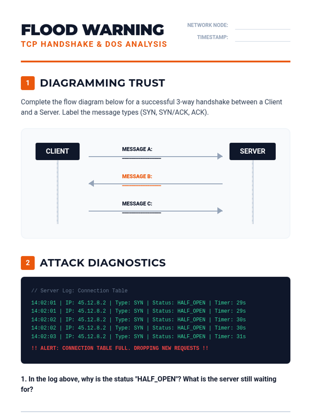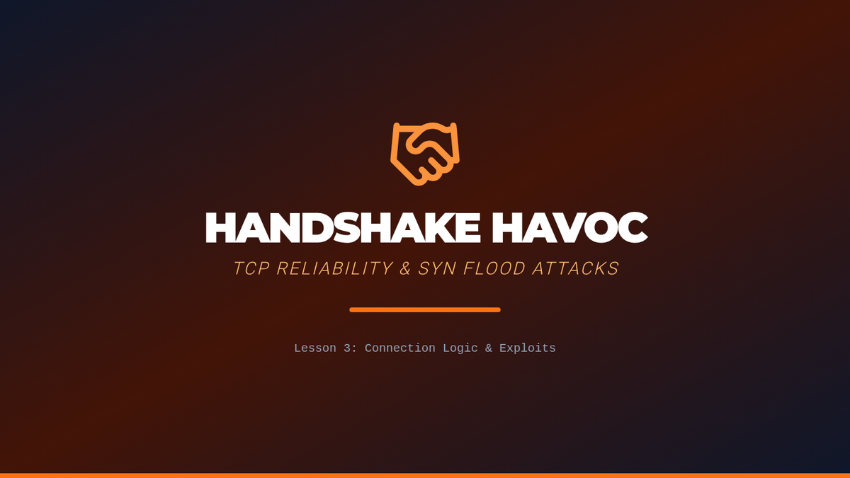 Students analyze the SYN-SYN/ACK-ACK handshake process that establishes reliable connections. They then explore how this mechanism can be exploited in SYN Flood attacks to create Denial of Service (DoS) conditions.