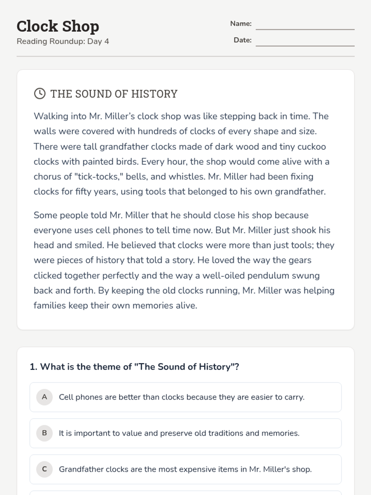 Students read about an old clock shop to identify the theme of preserving traditions and history.