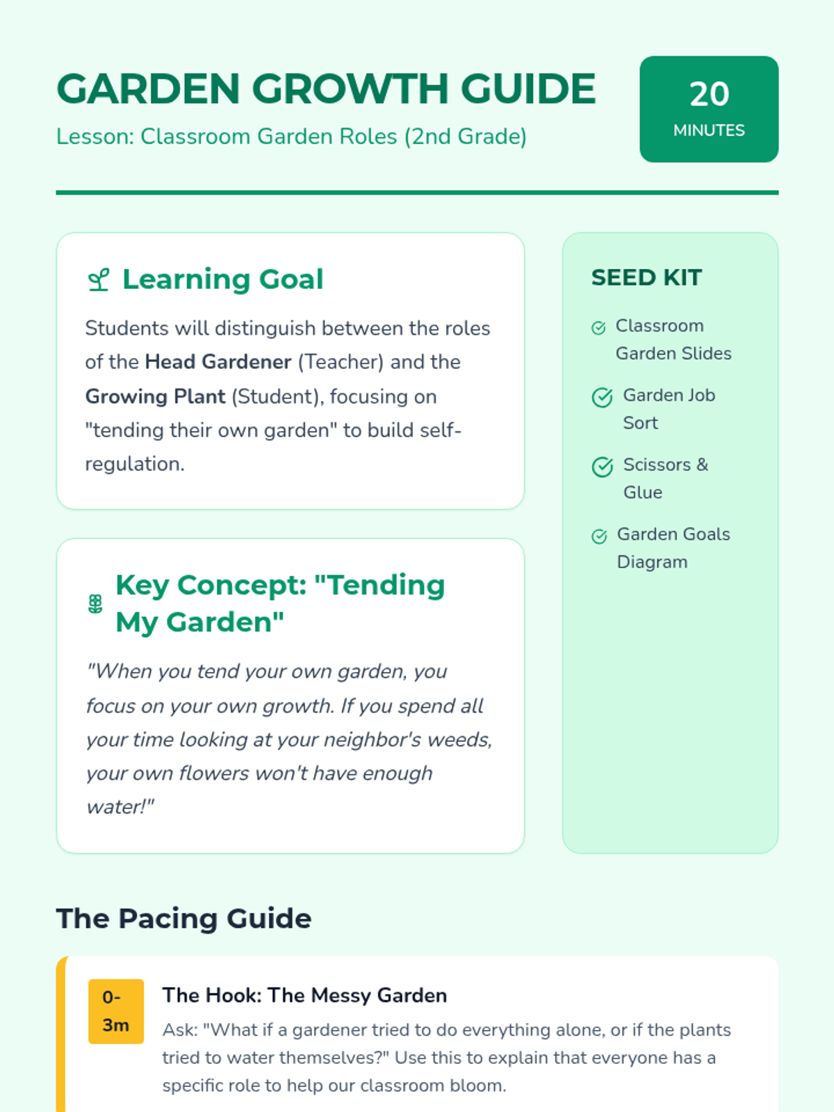 A 20-minute lesson using a garden metaphor to help 2nd graders understand the roles of teachers as 'Head Gardeners' and students as 'Growing Plants', with a focus on 'tending your own garden' for self-regulation.