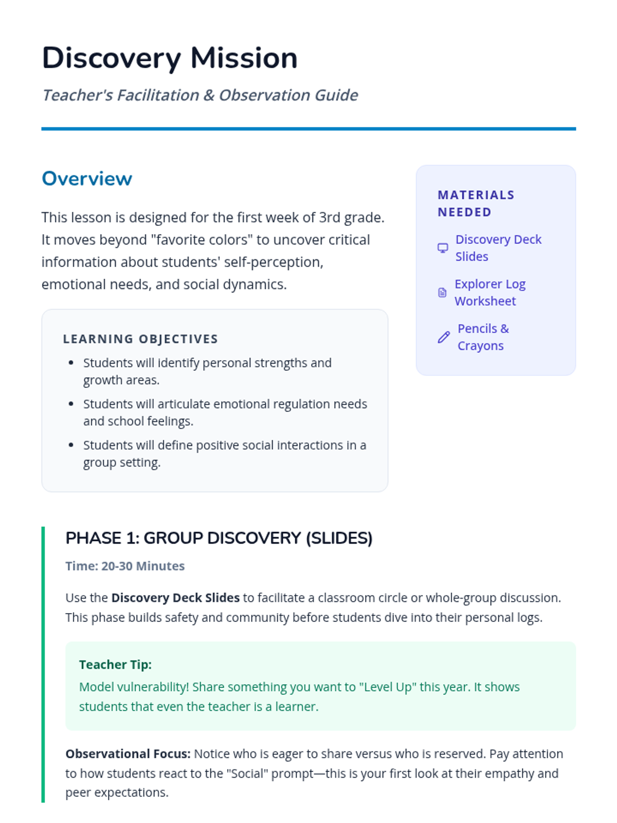 A comprehensive back-to-school lesson designed to help teachers get to know their 3rd-grade students' strengths, emotional needs, and social preferences through interactive discussion and personal reflection.