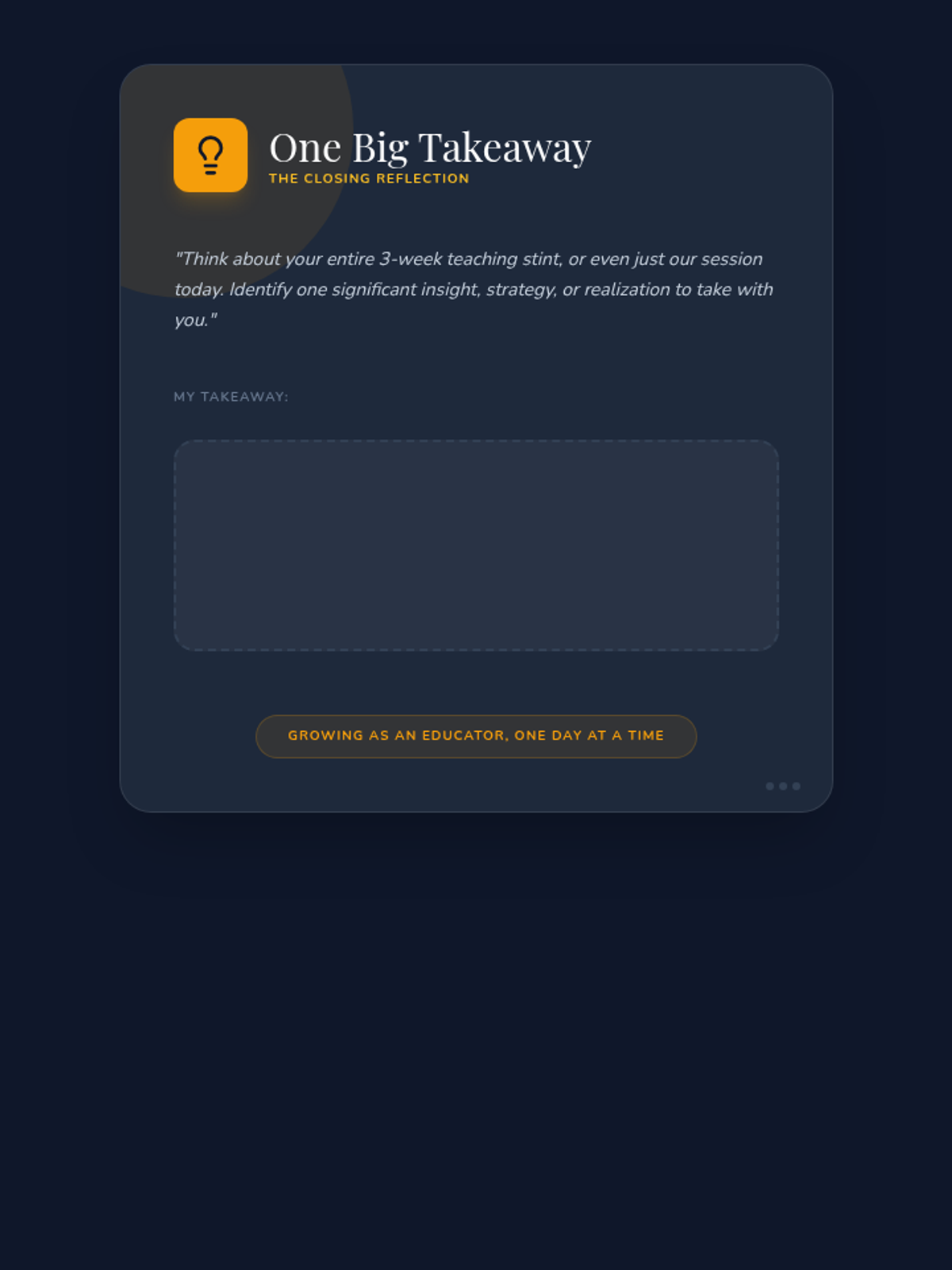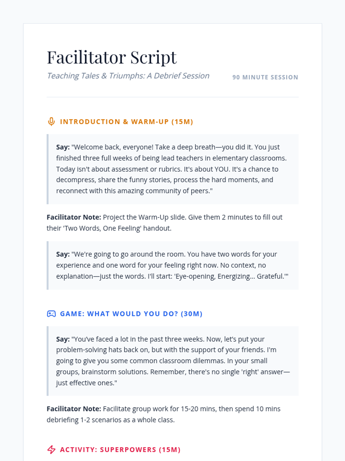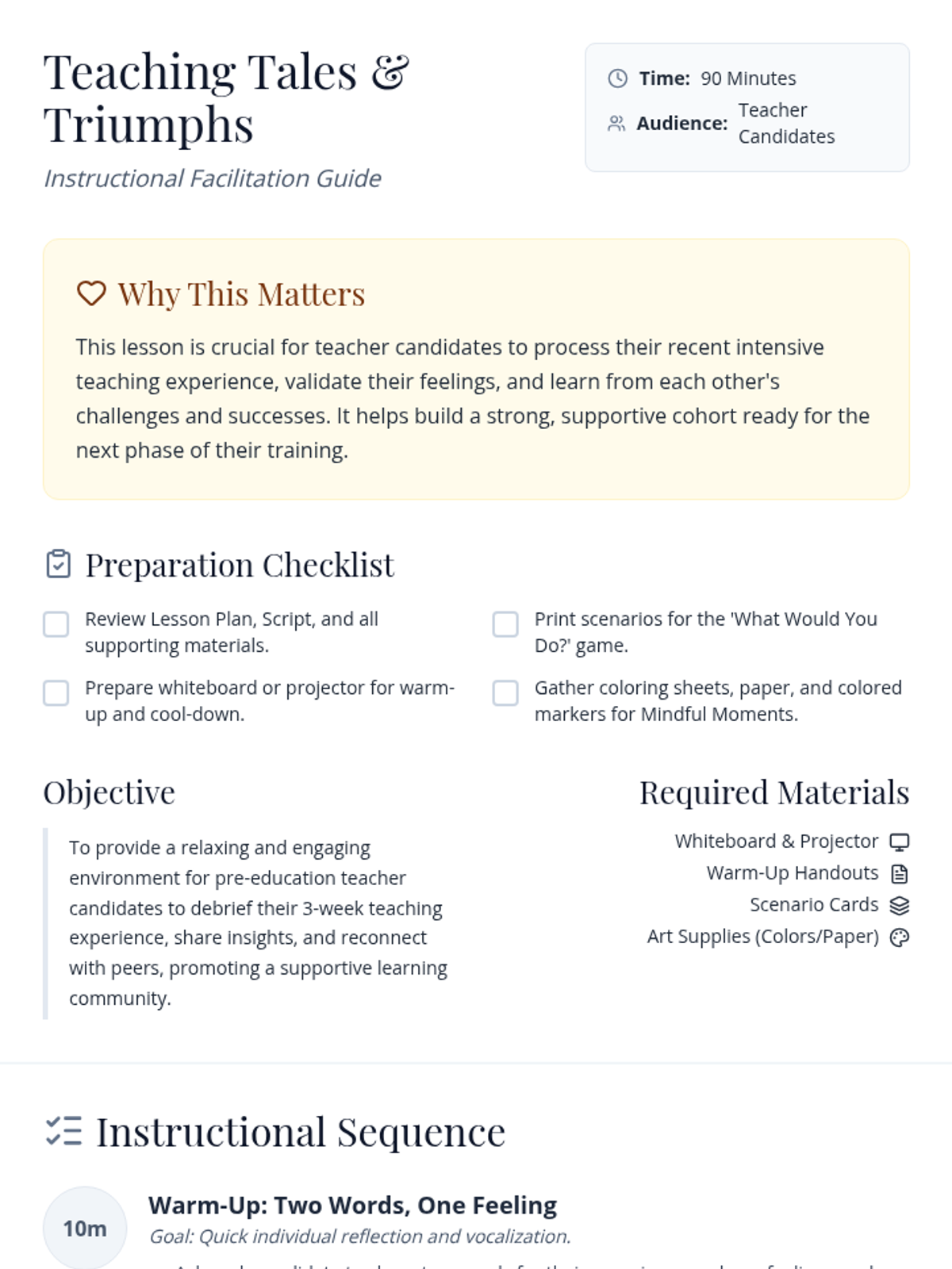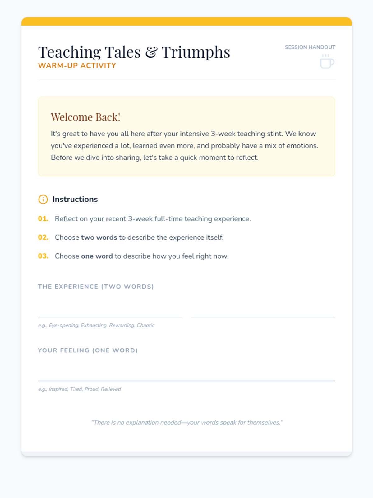 A 90-minute debrief and reflection session designed for pre-education teacher candidates to process their 3-week full-time teaching experience through sharing, games, and creative activities.