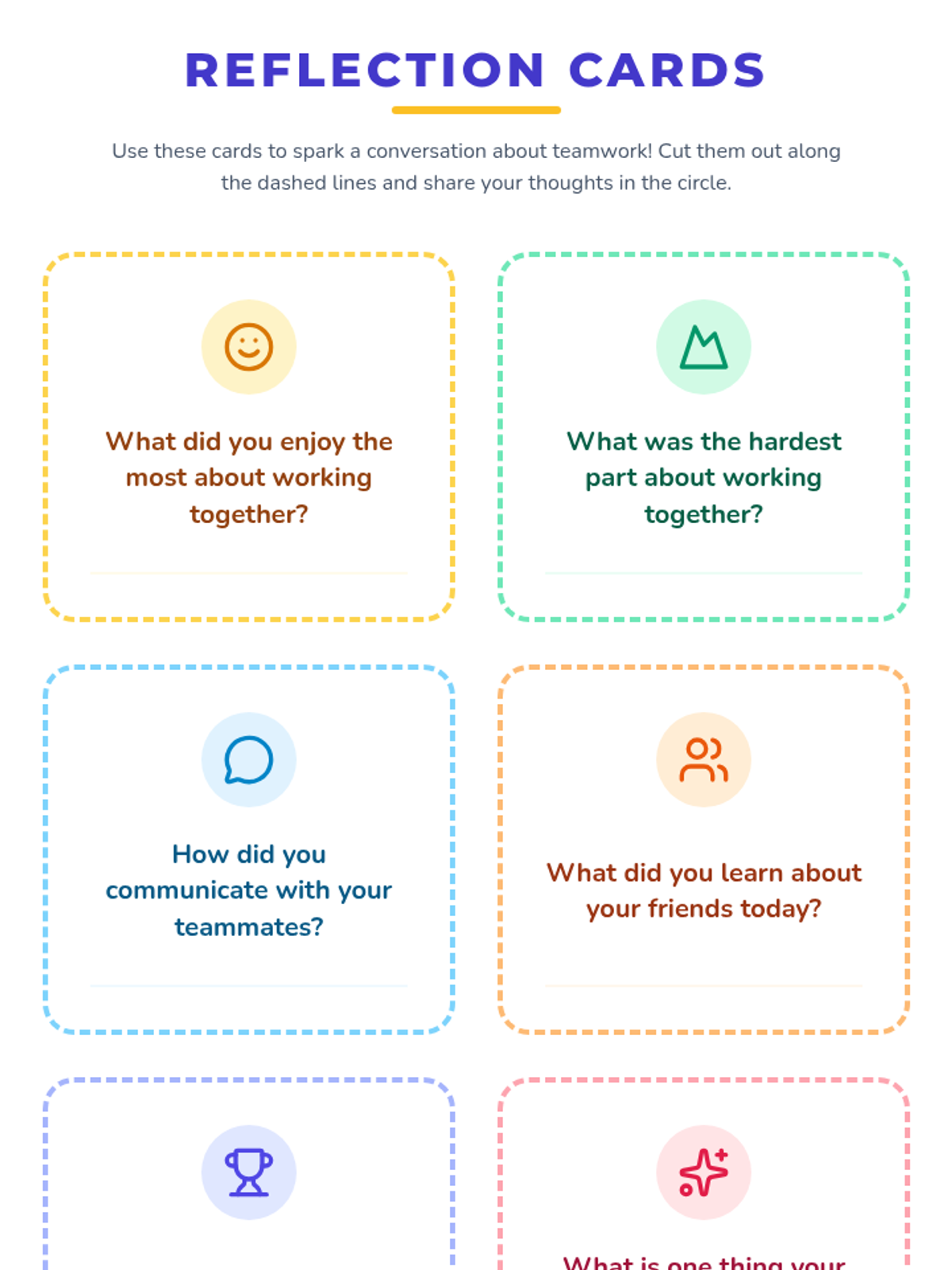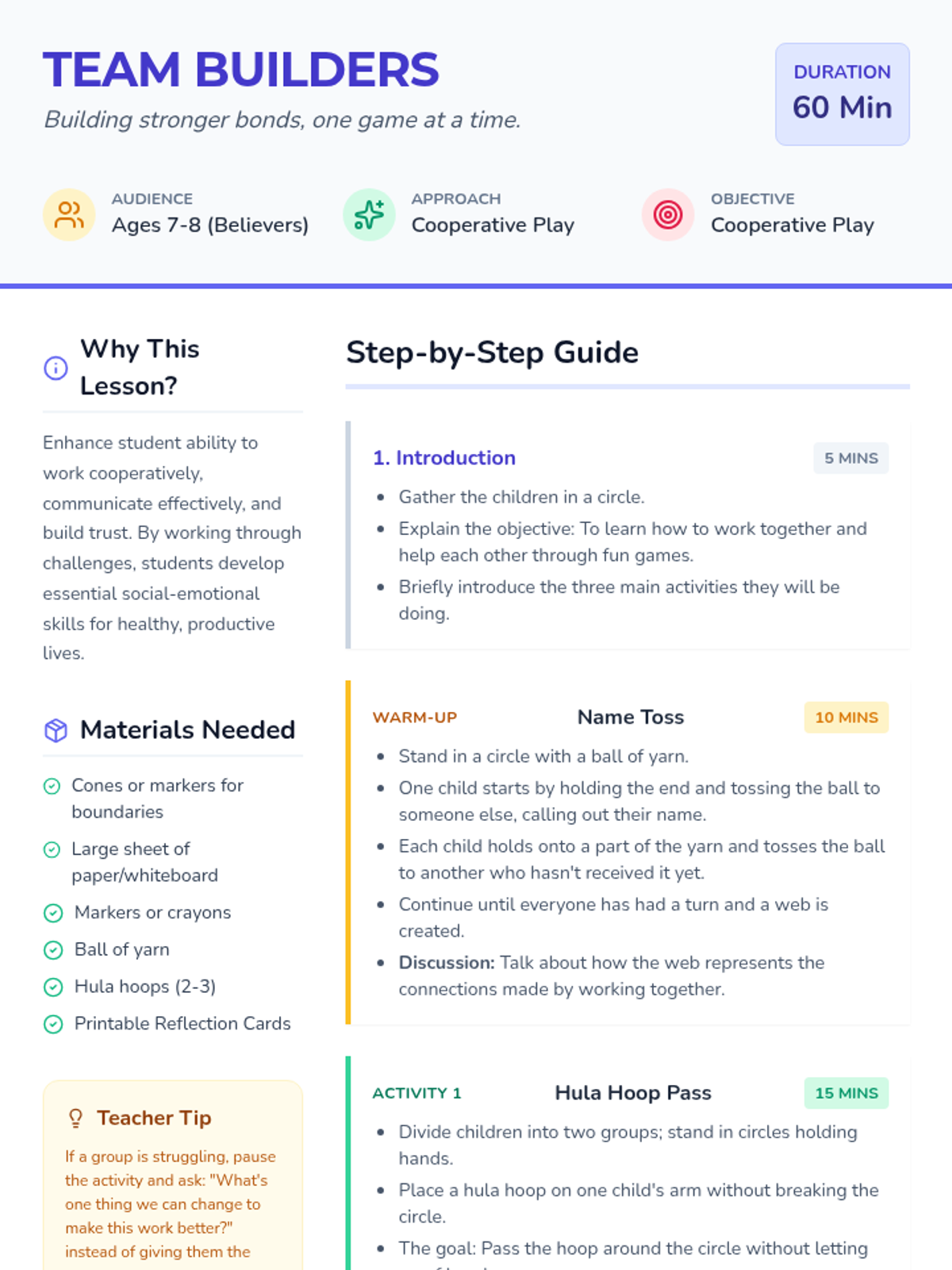 A fun, activity-based lesson focused on cooperative play and social-emotional skills through team challenges. Students learn to communicate, trust, and collaborate through games like Name Toss, Hula Hoop Pass, and Crossing the River.