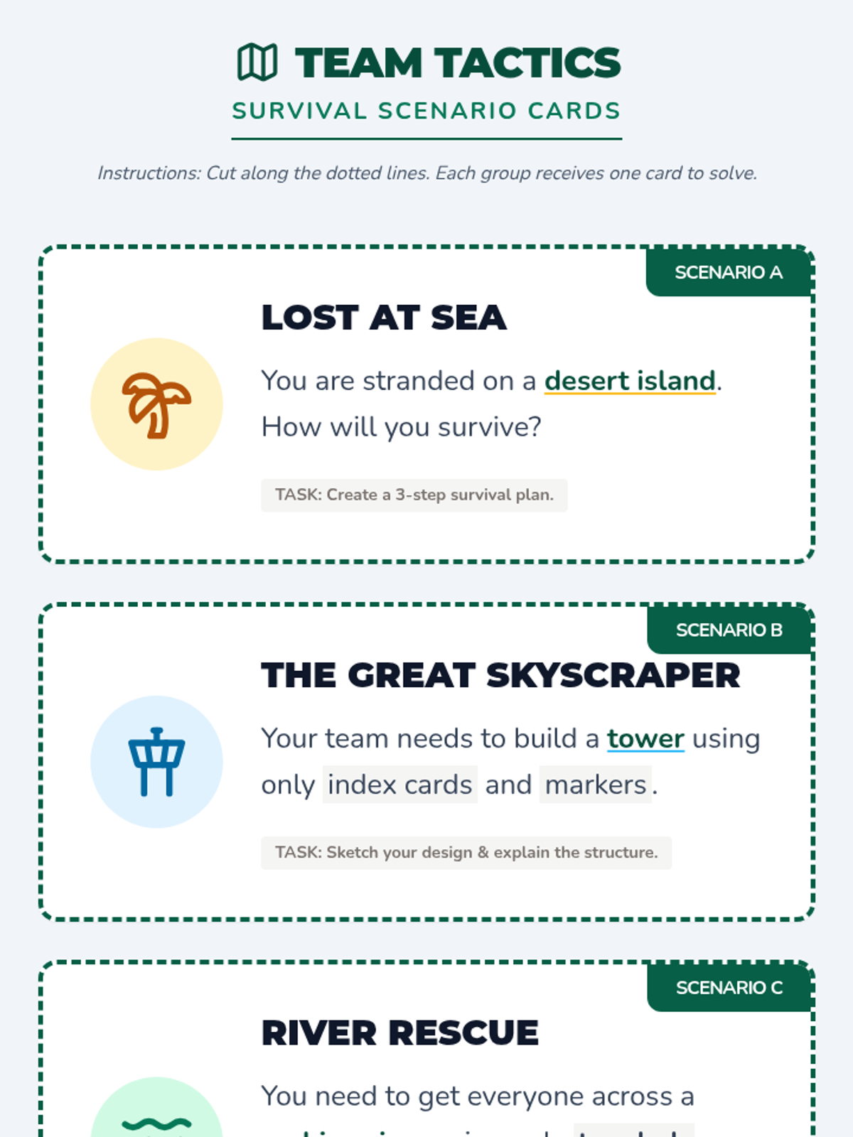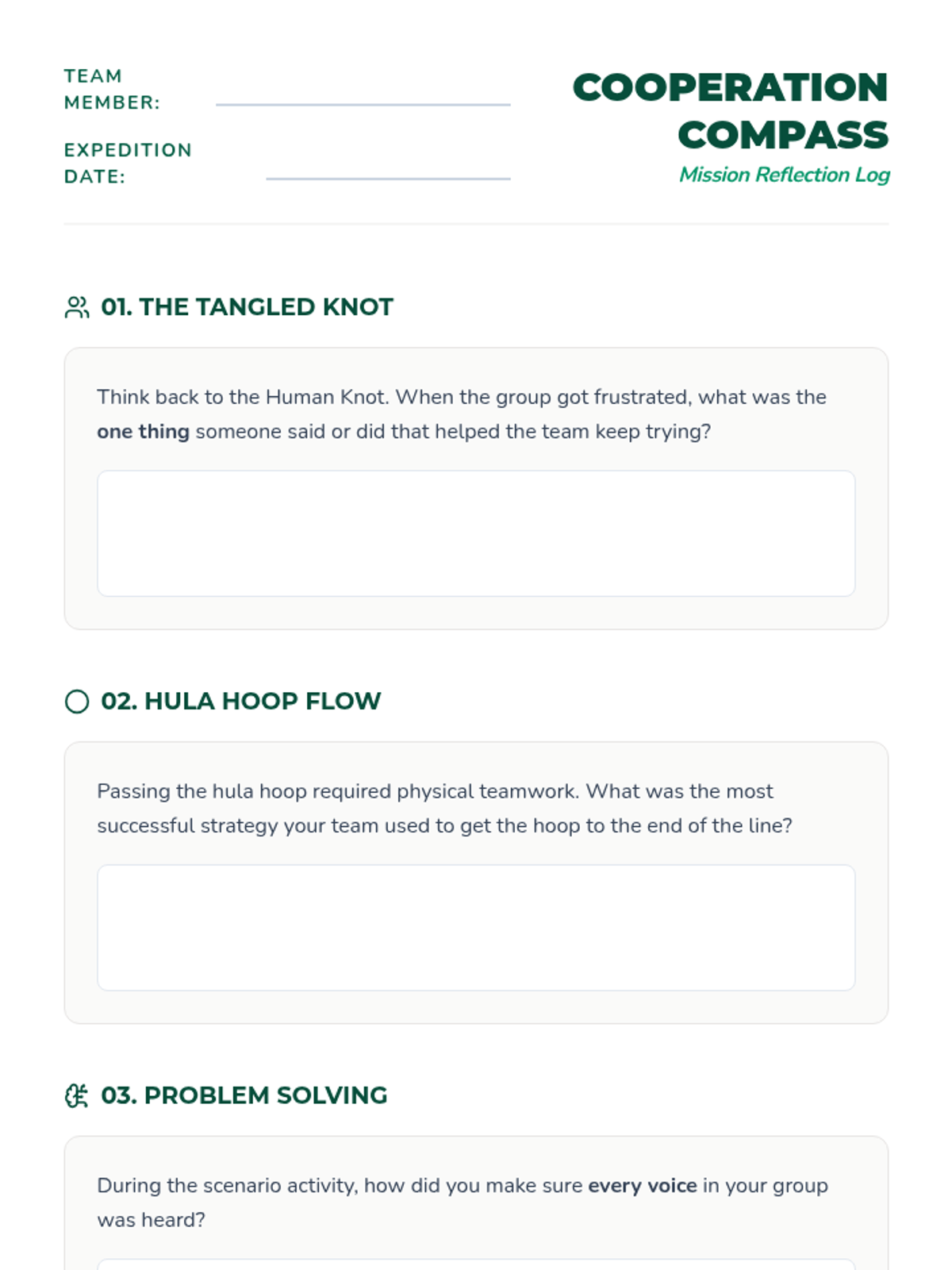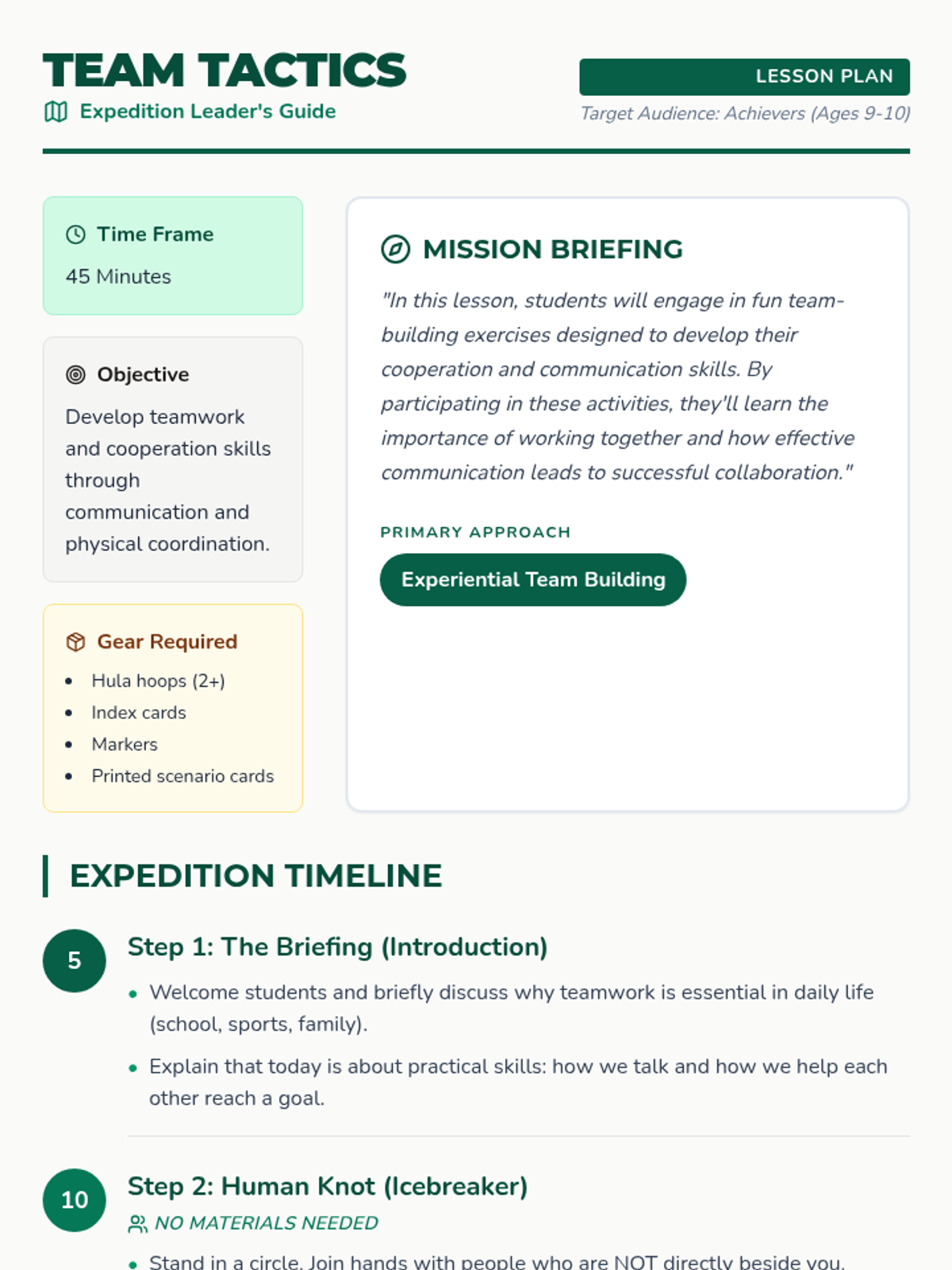 Students engage in dynamic team-building exercises like the Human Knot and Hula Hoop Pass to master cooperation and communication skills through active play and problem-solving scenarios.