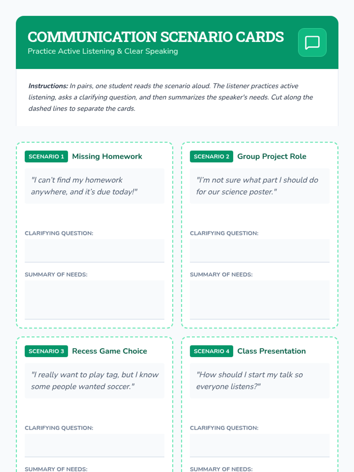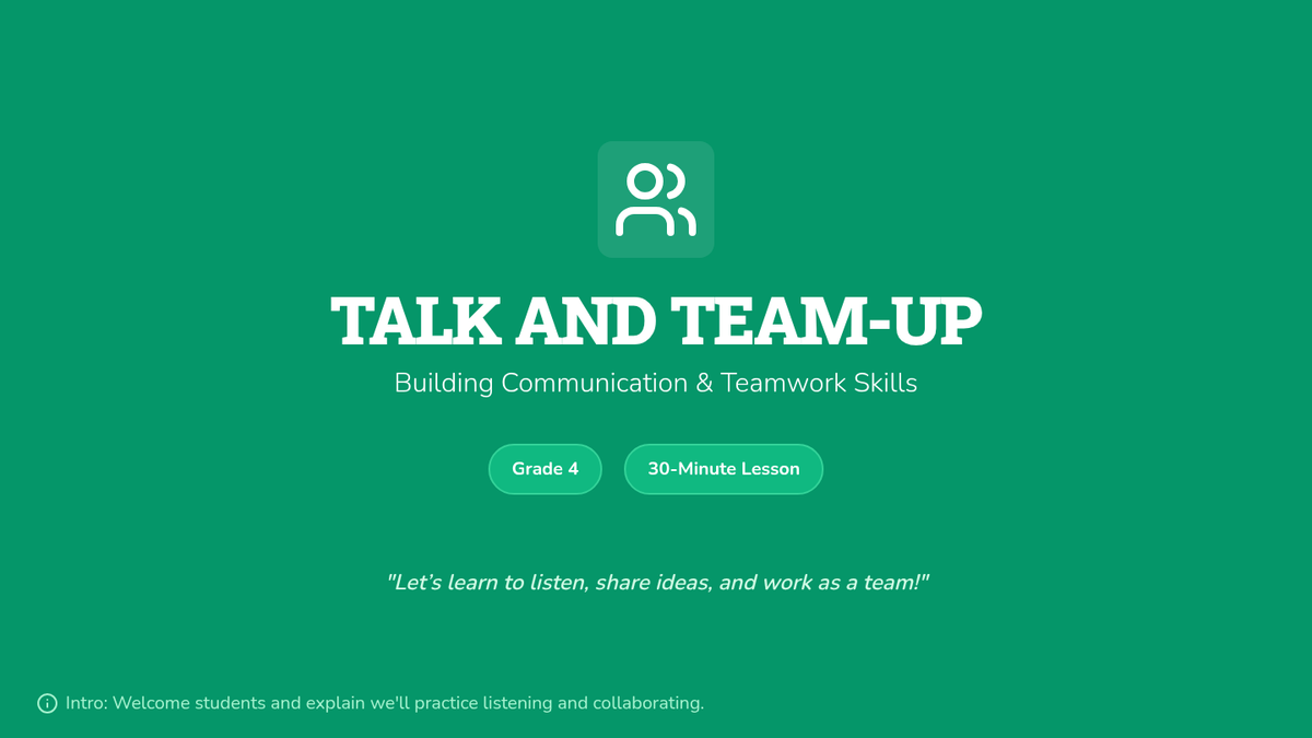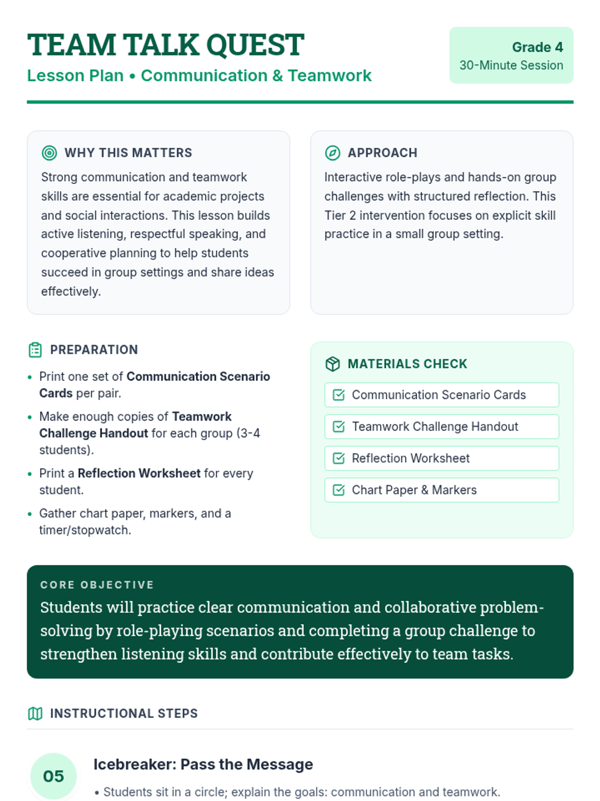 A 30-minute Tier 2 group lesson for 4th graders focused on building active listening, clear expression, and collaborative problem-solving through interactive role-plays and a group poster challenge.