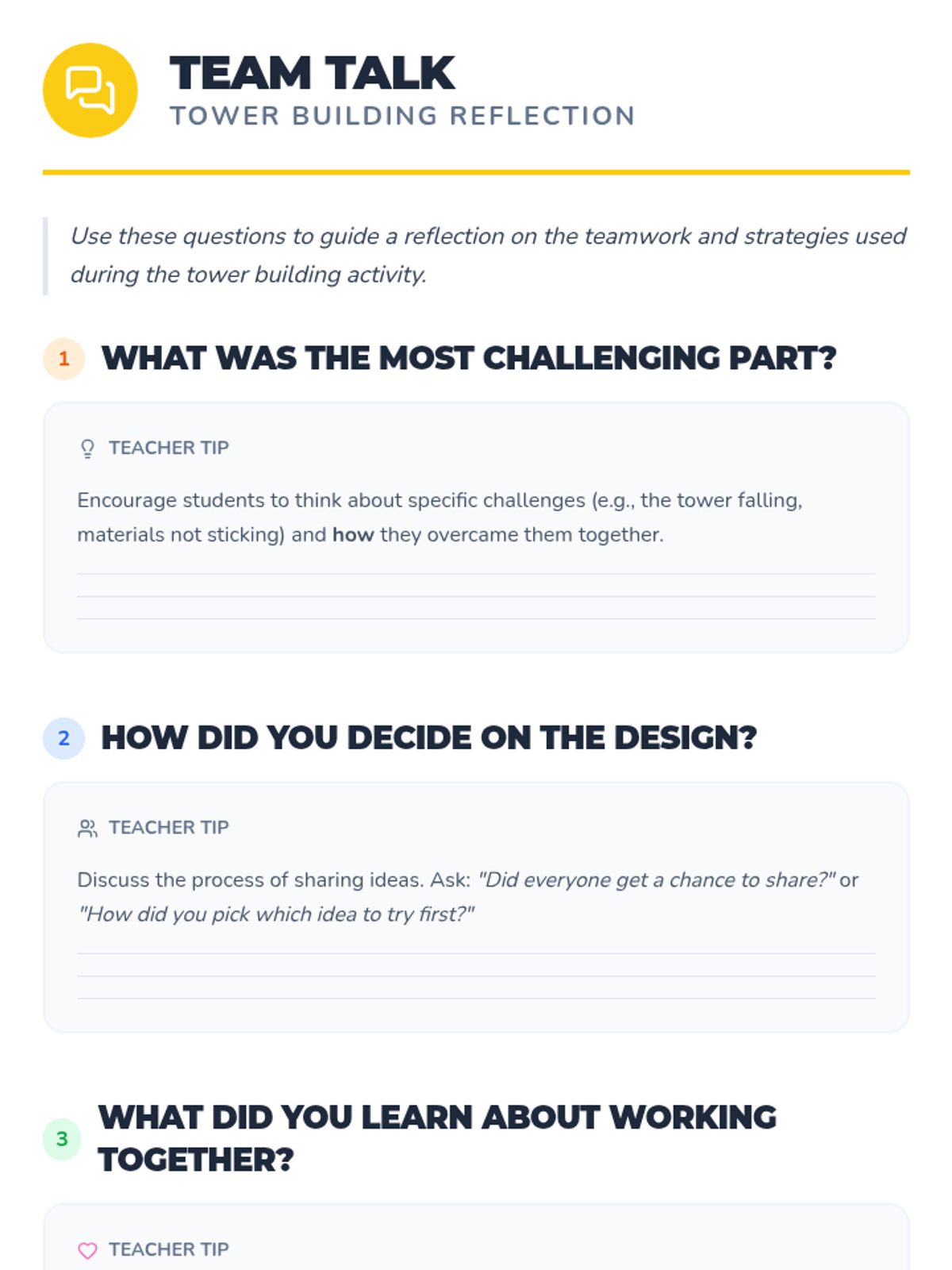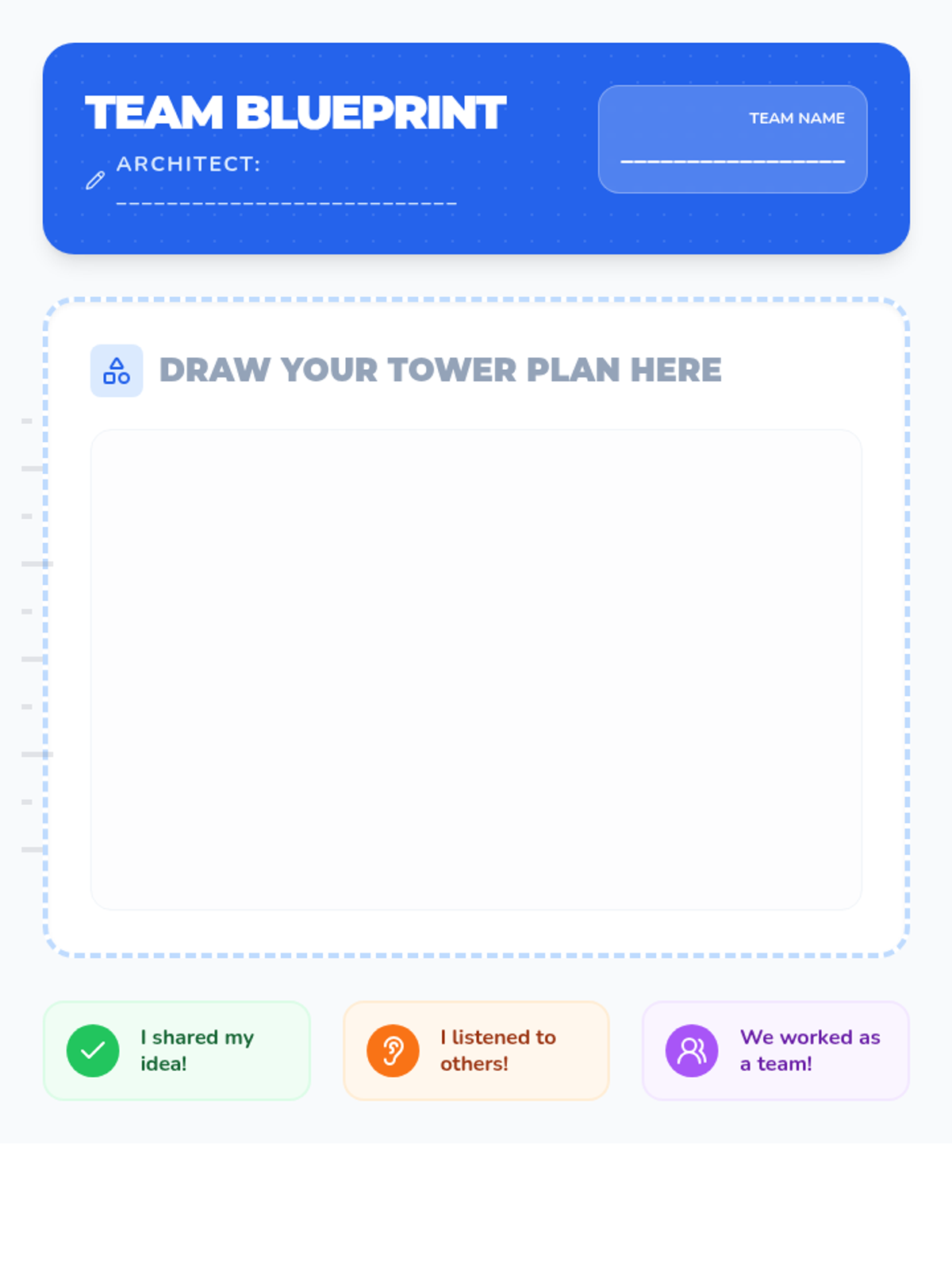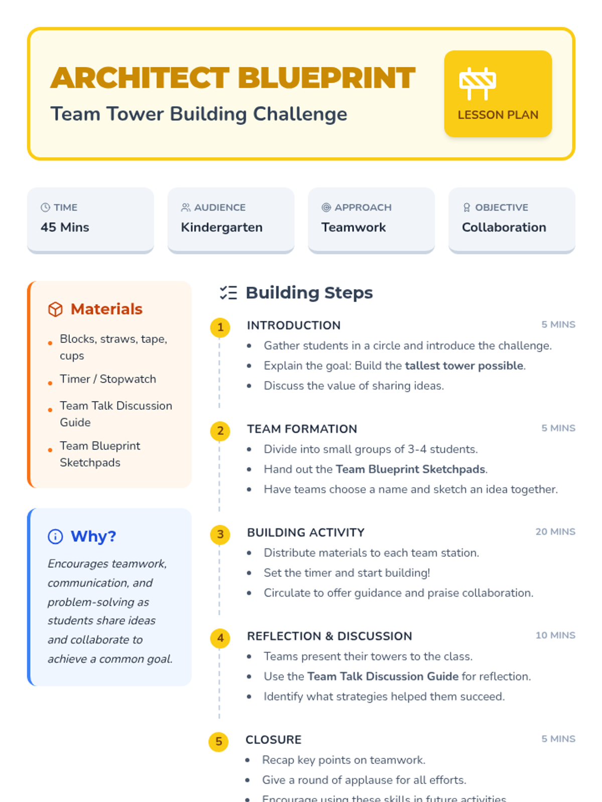A hands-on kindergarten lesson focused on teamwork and engineering. Students collaborate in small groups to build the tallest tower possible using various materials, practicing communication and problem-solving.
