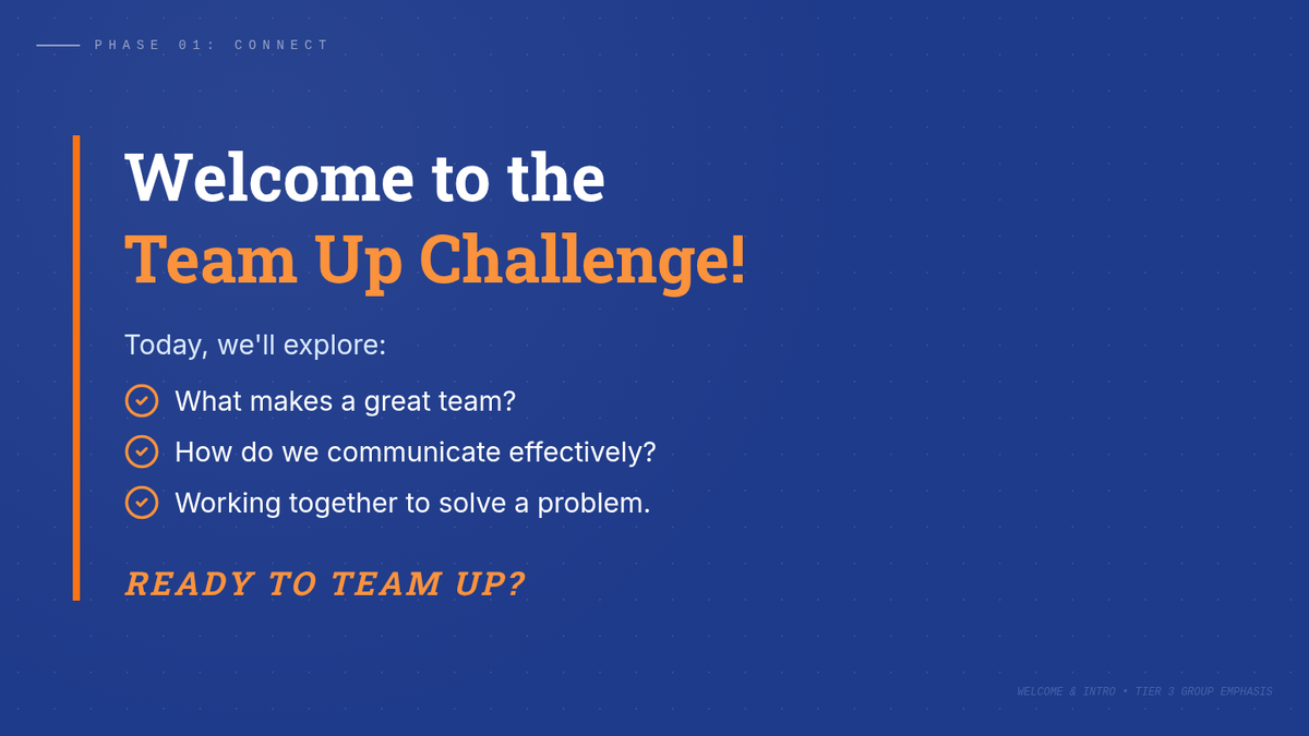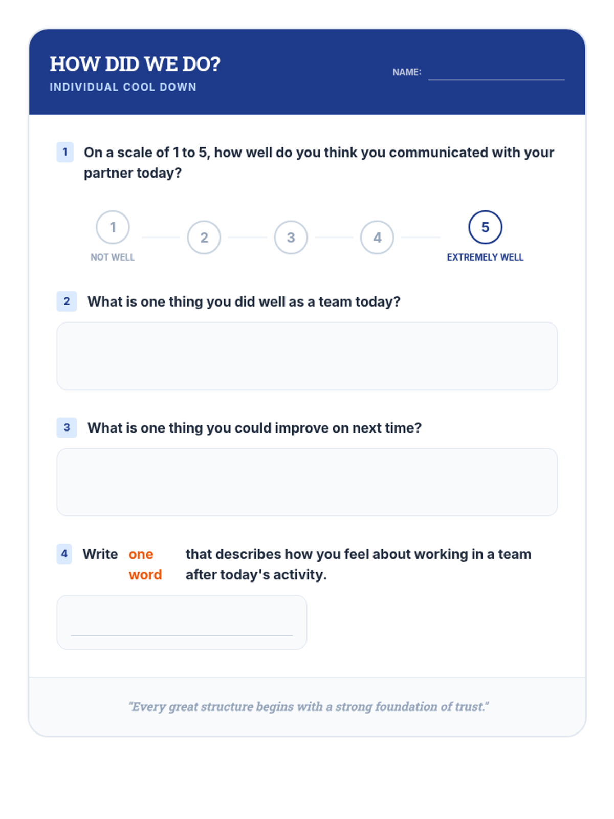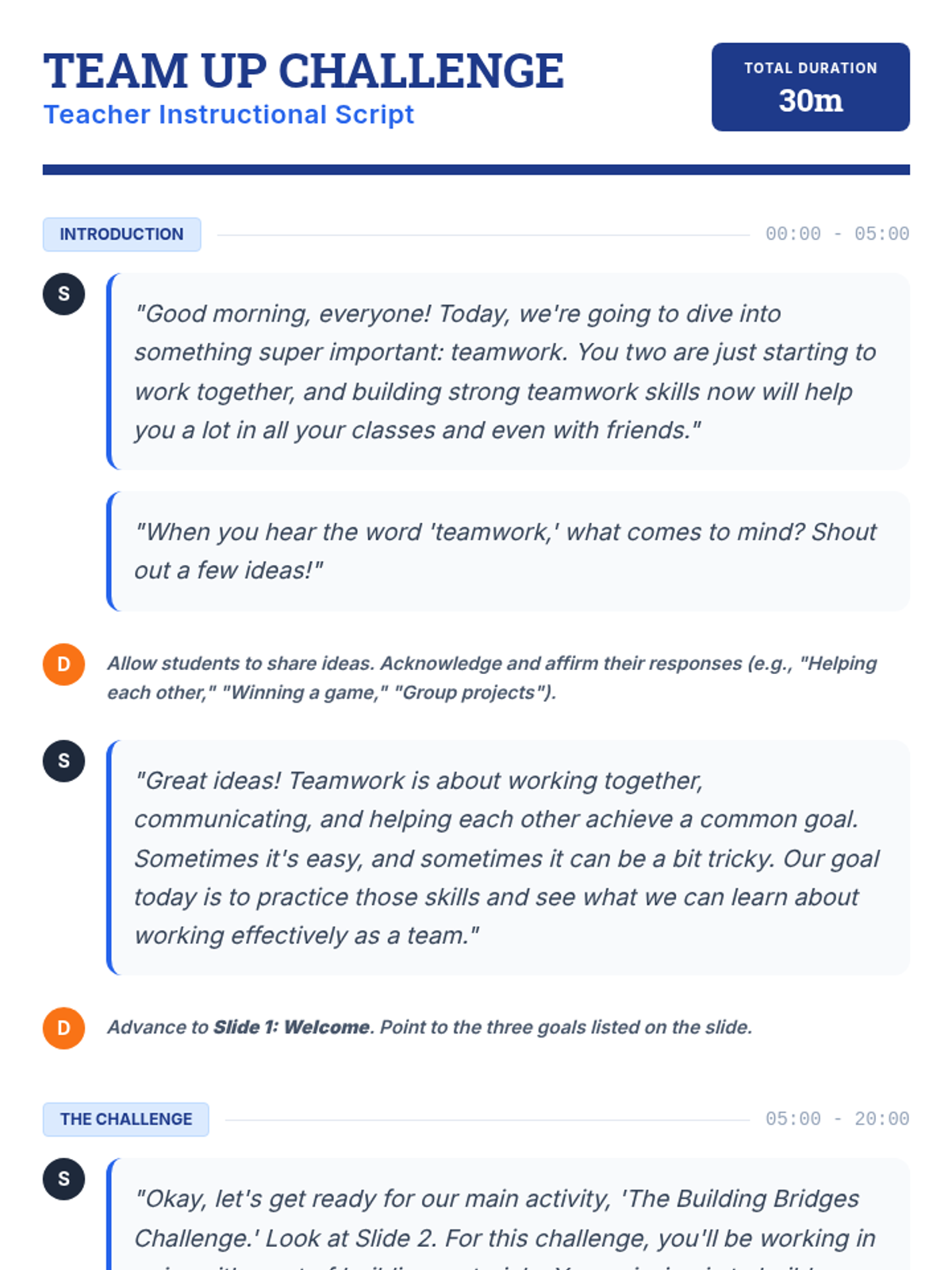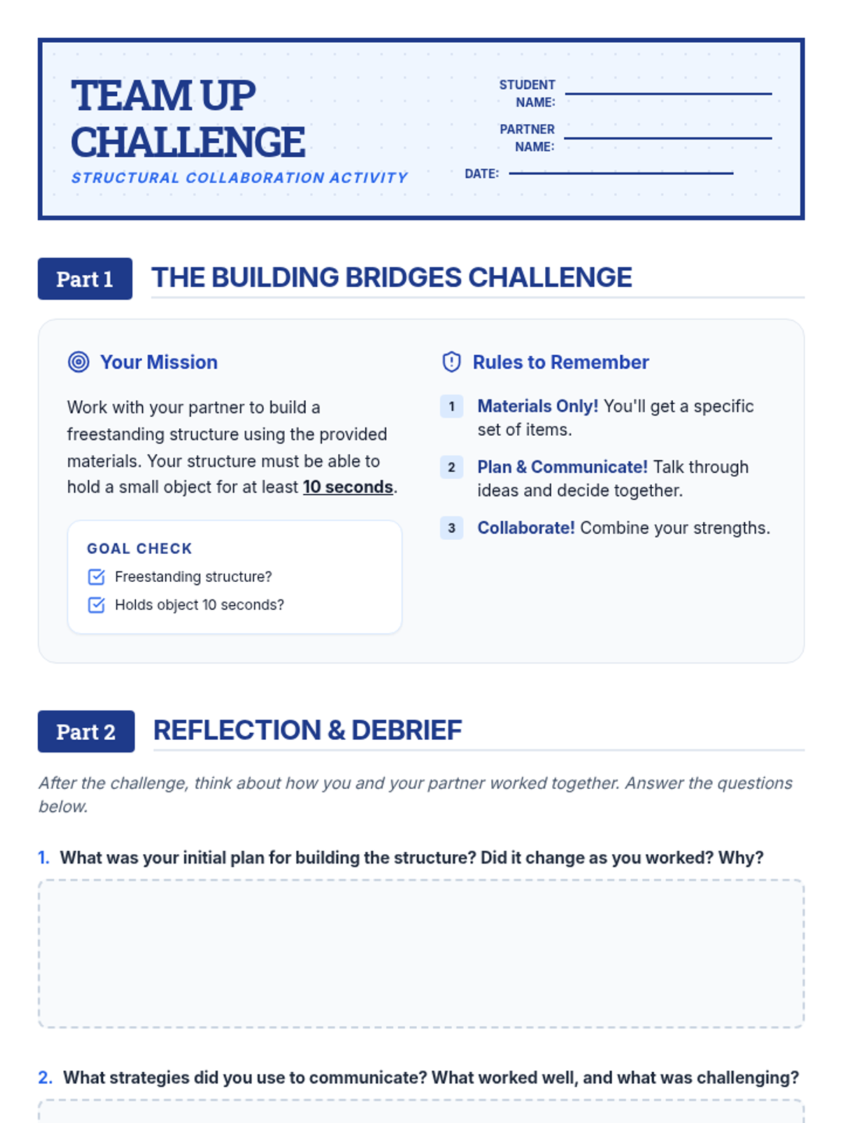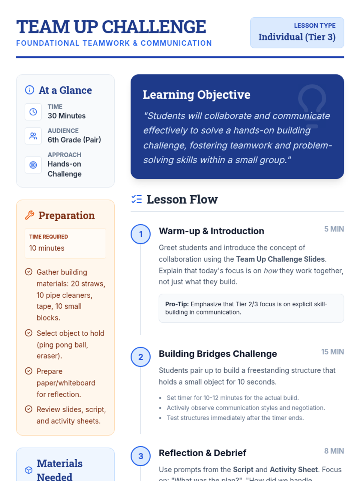 A 30-minute Tier 3 lesson for two 6th-grade students to build teamwork and communication skills through a hands-on building challenge.