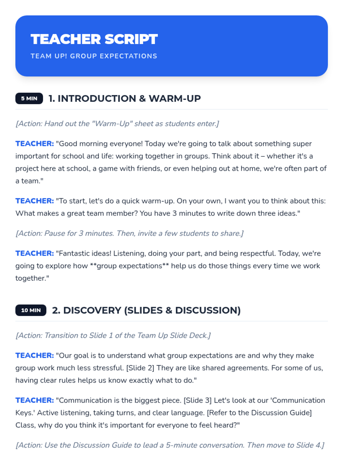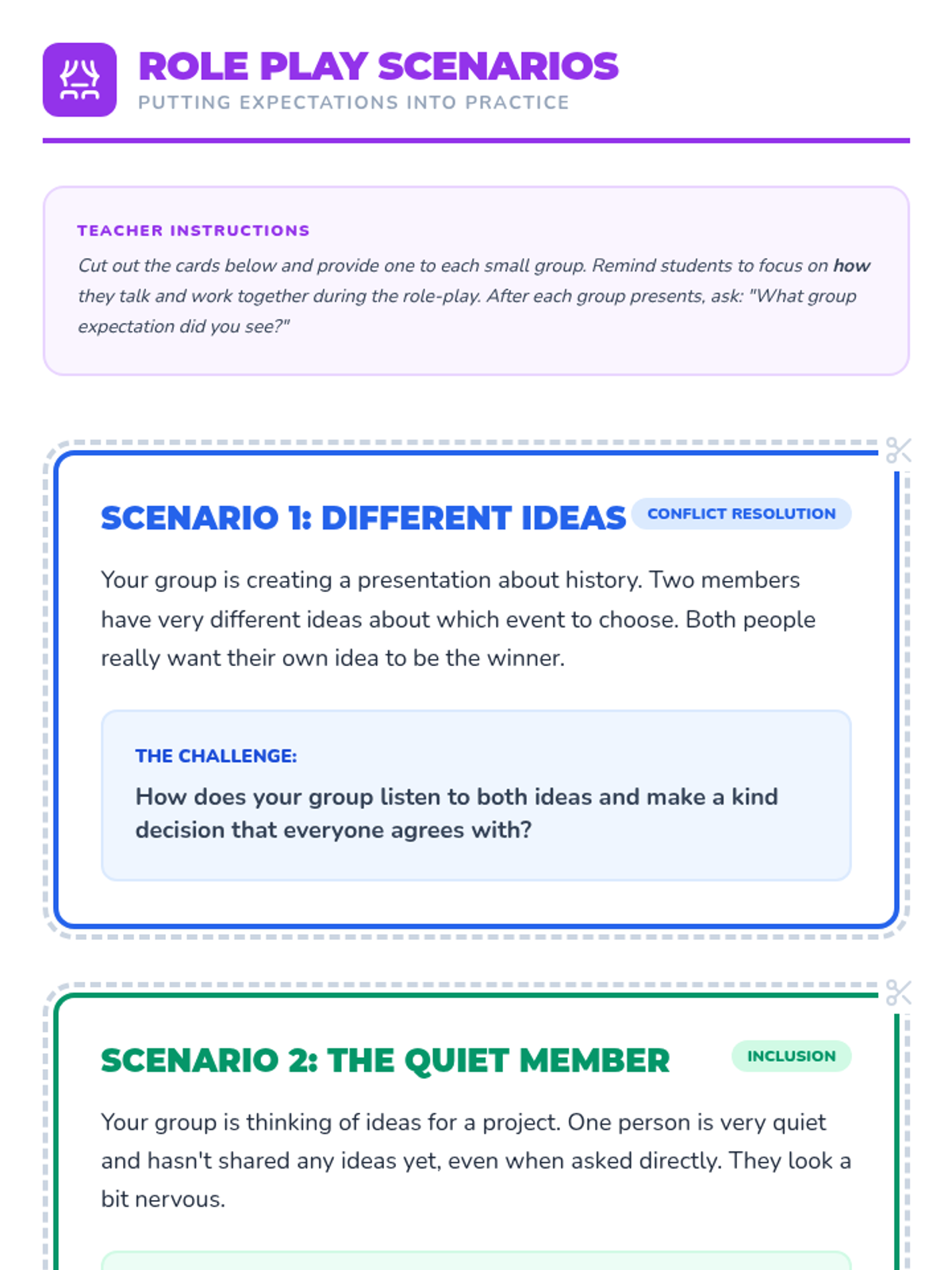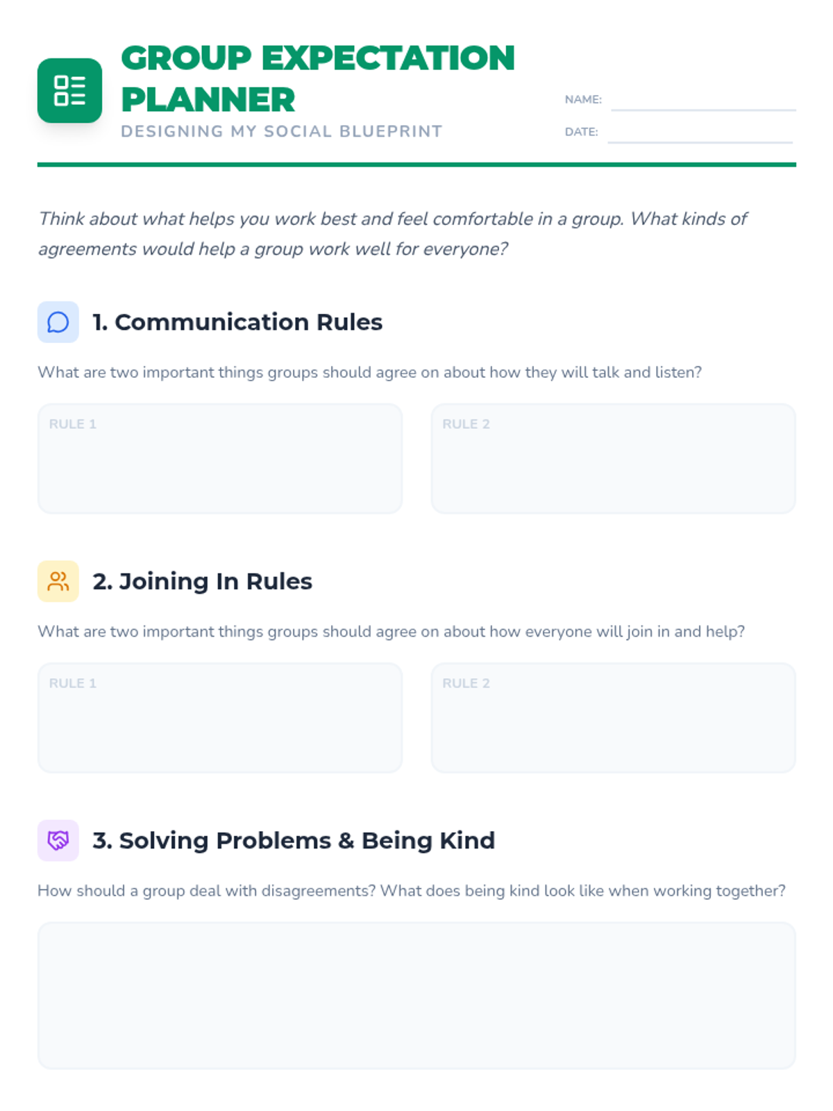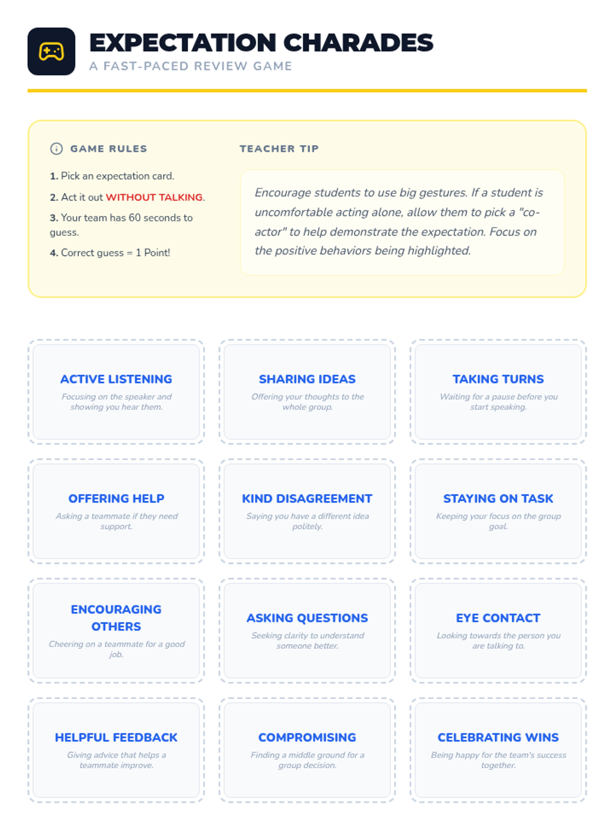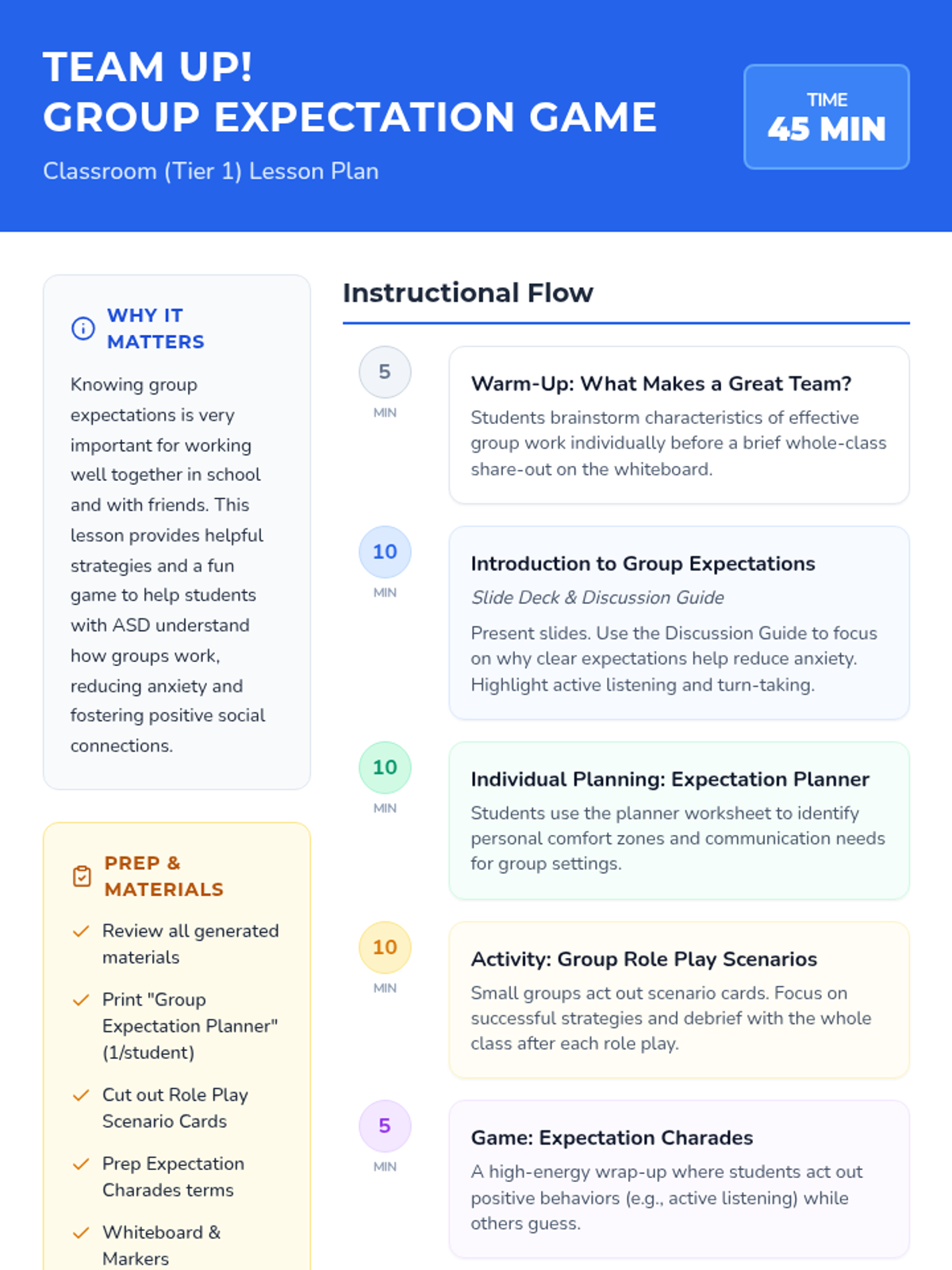 A 45-minute social skills lesson for 9th-grade students with ASD focused on understanding and practicing clear group expectations through interactive play and role-play.
