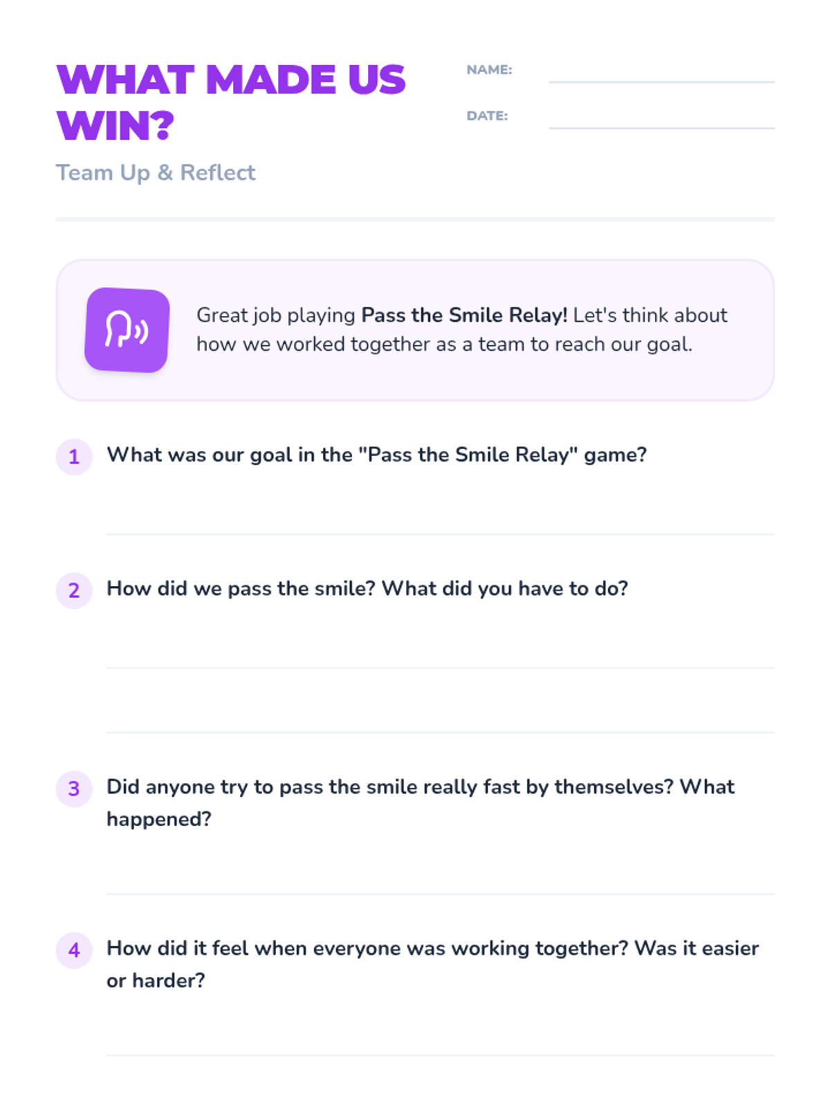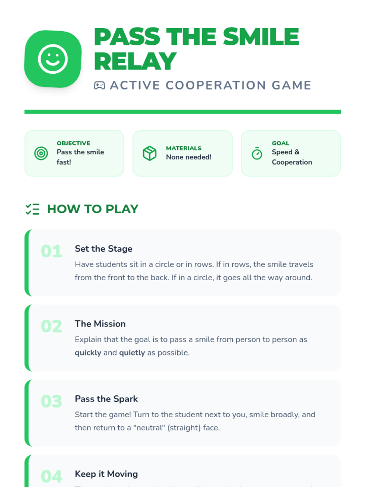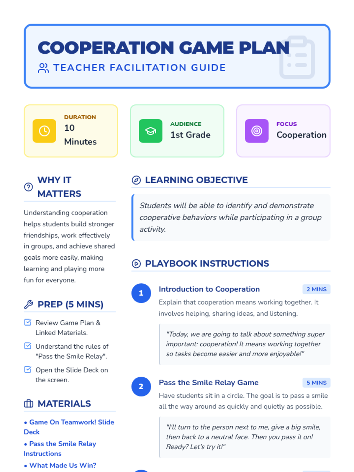 A quick, 10-minute 1st-grade lesson centered on the 'Pass the Smile Relay' game to demonstrate the benefits of cooperation and teamwork.