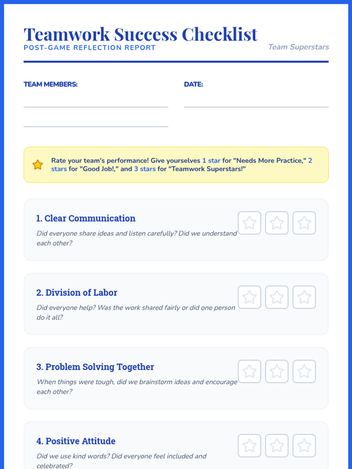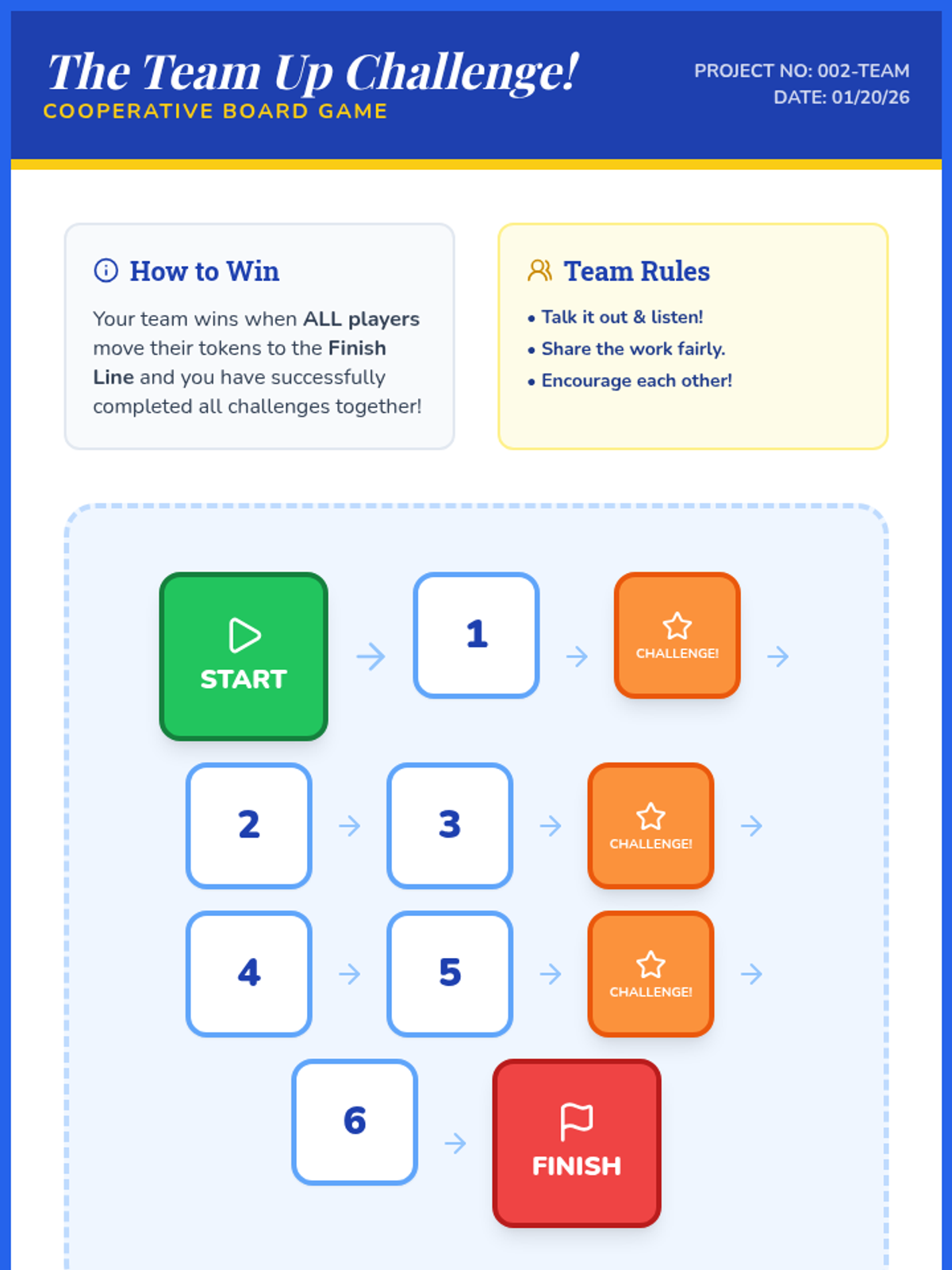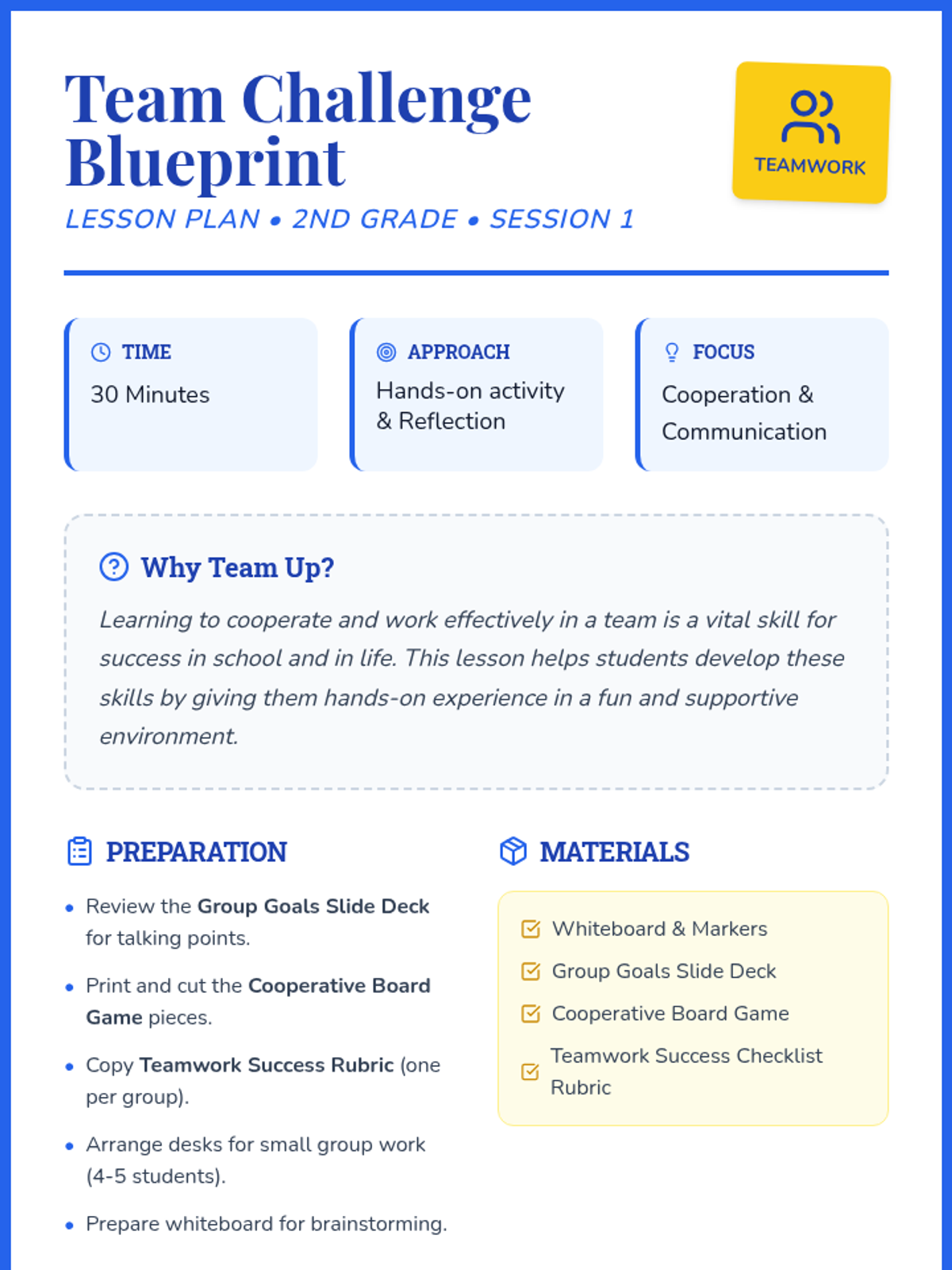 A 30-minute small group lesson for 2nd graders focused on developing teamwork skills through a cooperative board game and structured reflection. Students practice clear communication and division of labor to achieve shared goals.