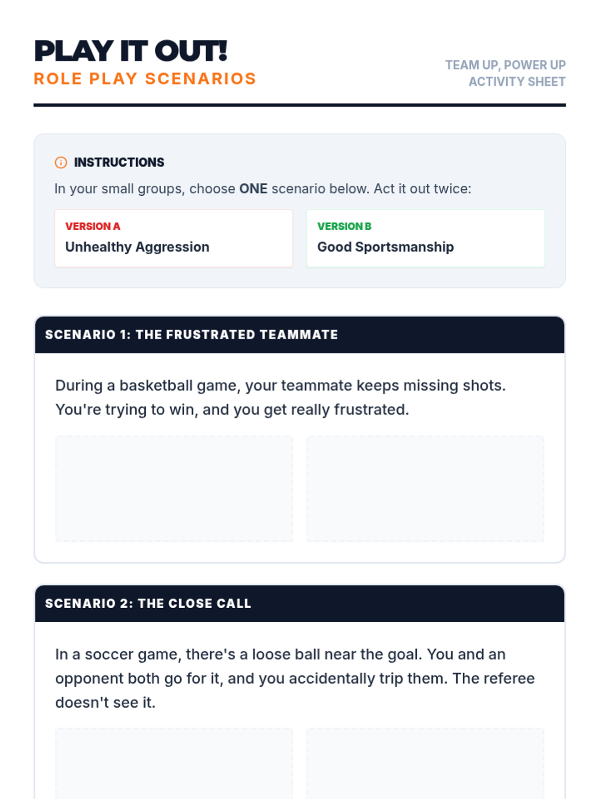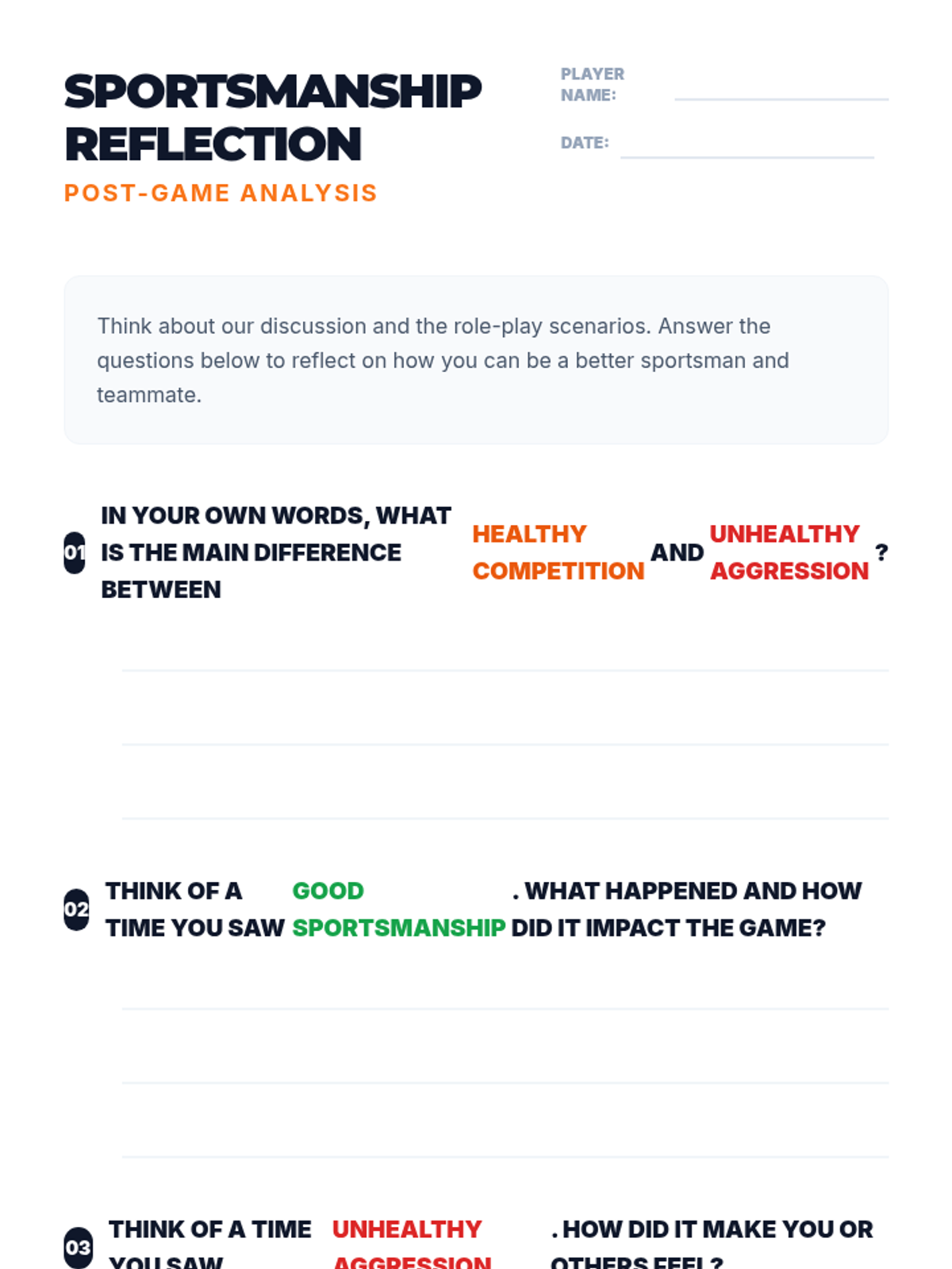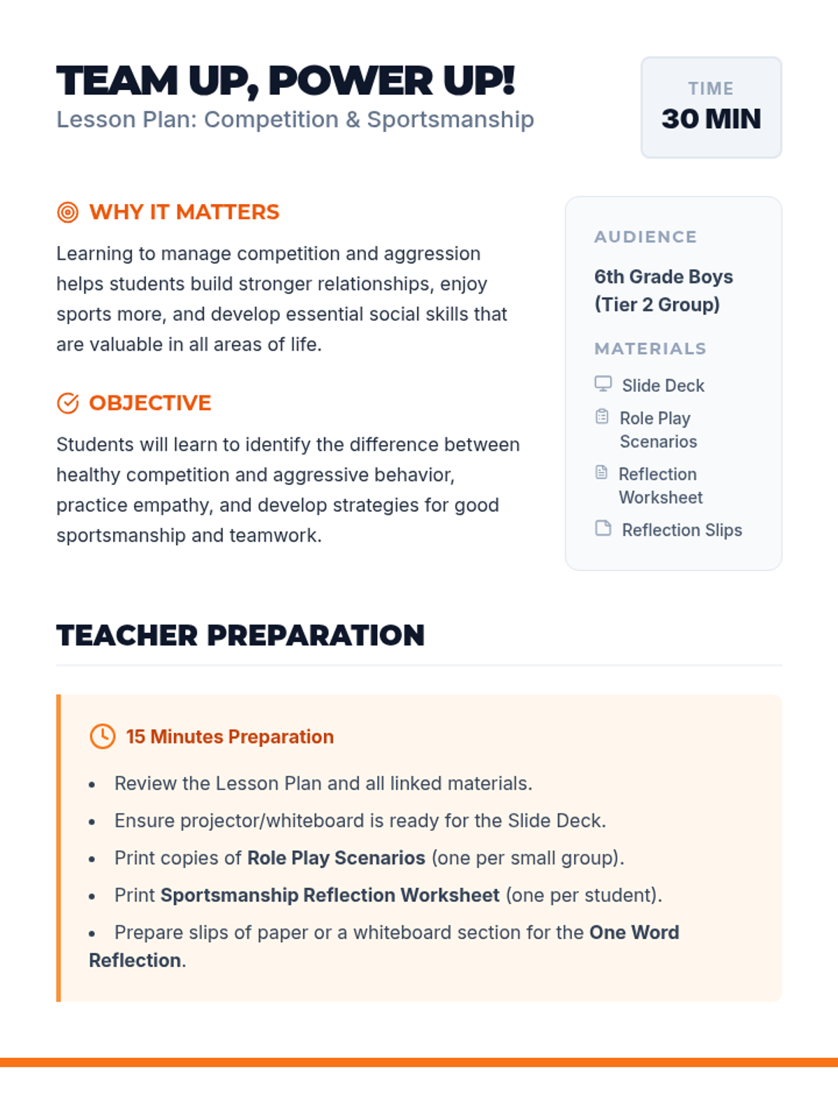 A single-session lesson for 6th-grade boys focused on distinguishing healthy competition from unhealthy aggression in sports. Students will explore empathy and teamwork through role-playing and reflection.