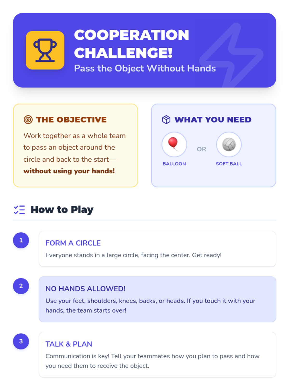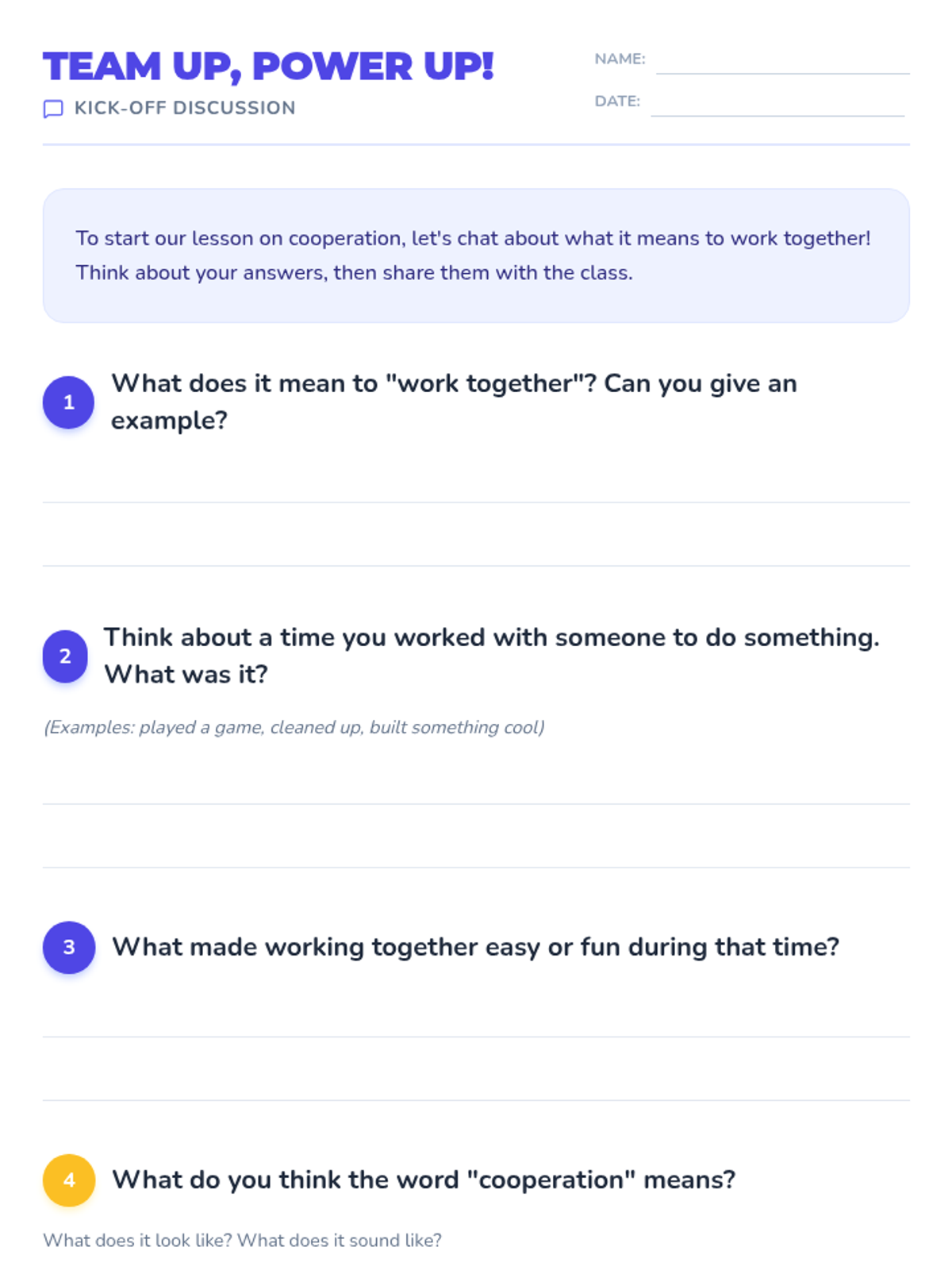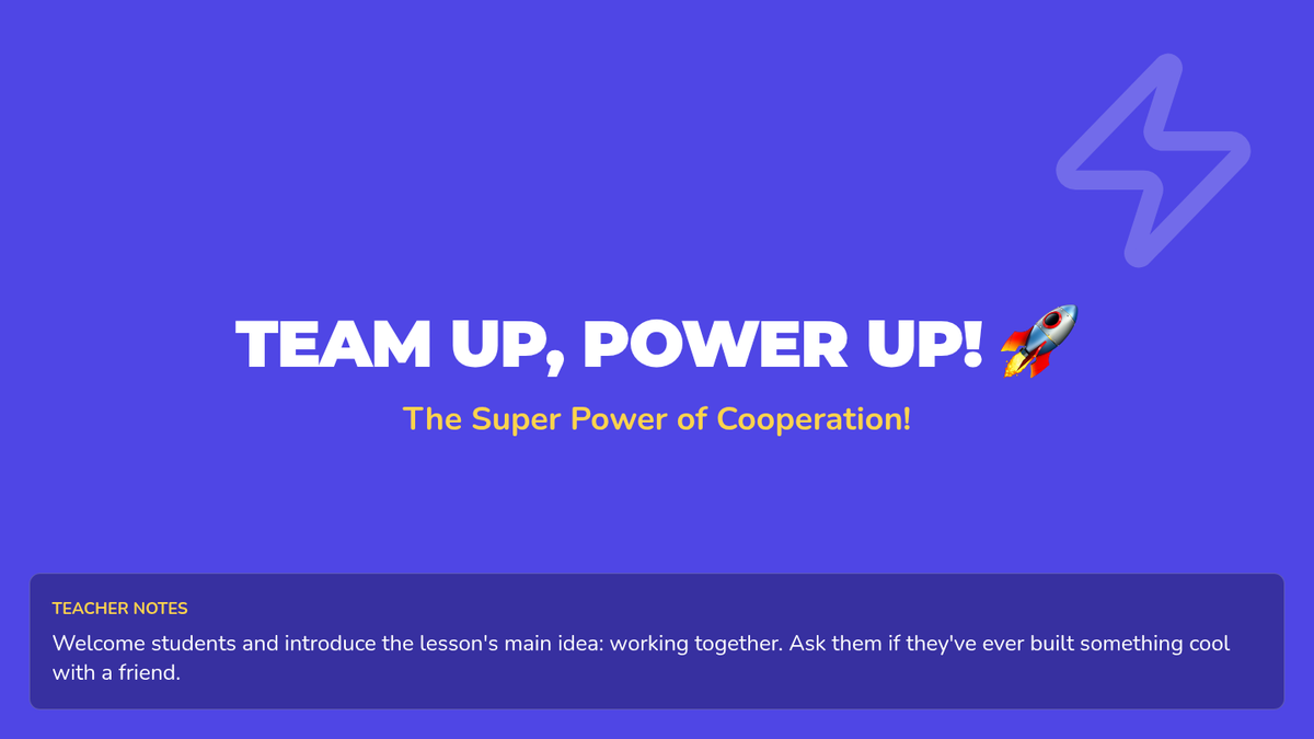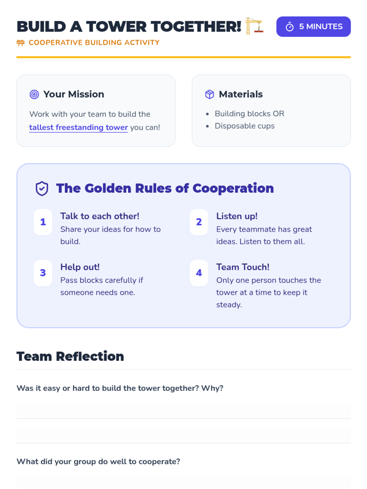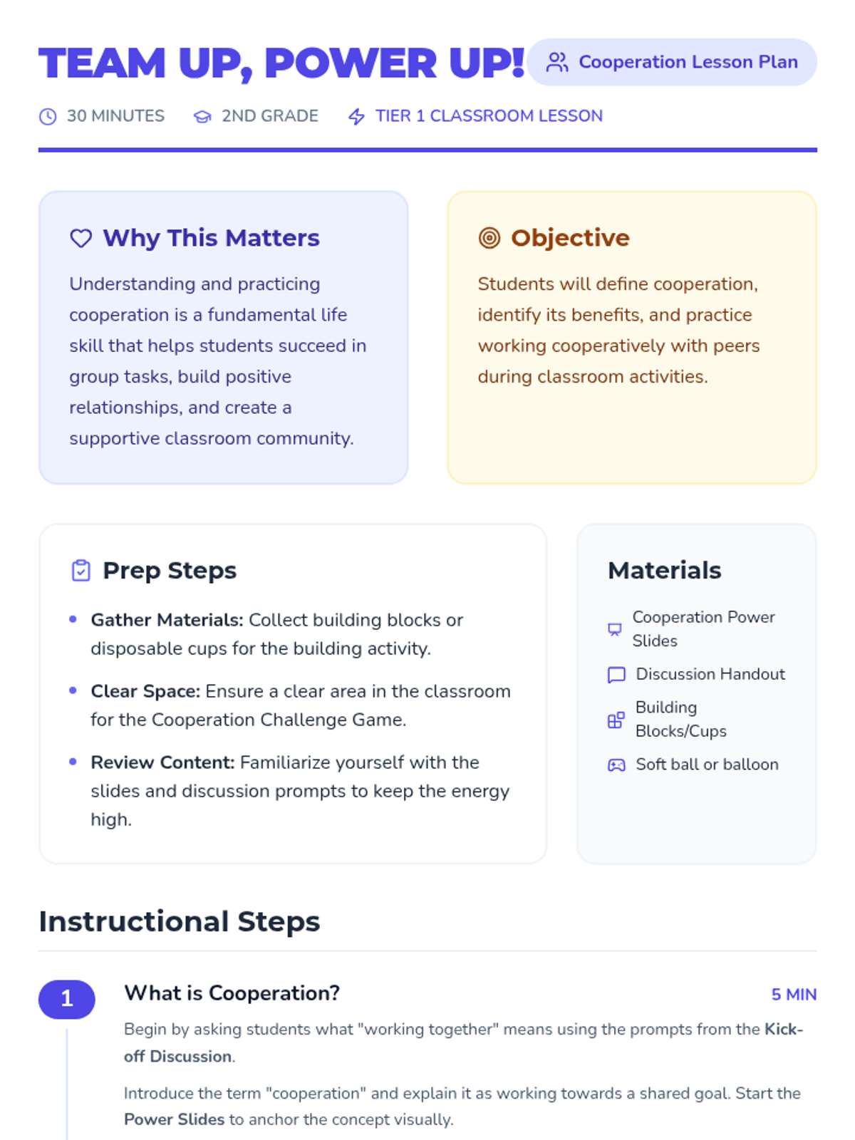 A fun, interactive 30-minute lesson for 2nd graders to learn the power of cooperation through discussion, a building activity, and a group game.