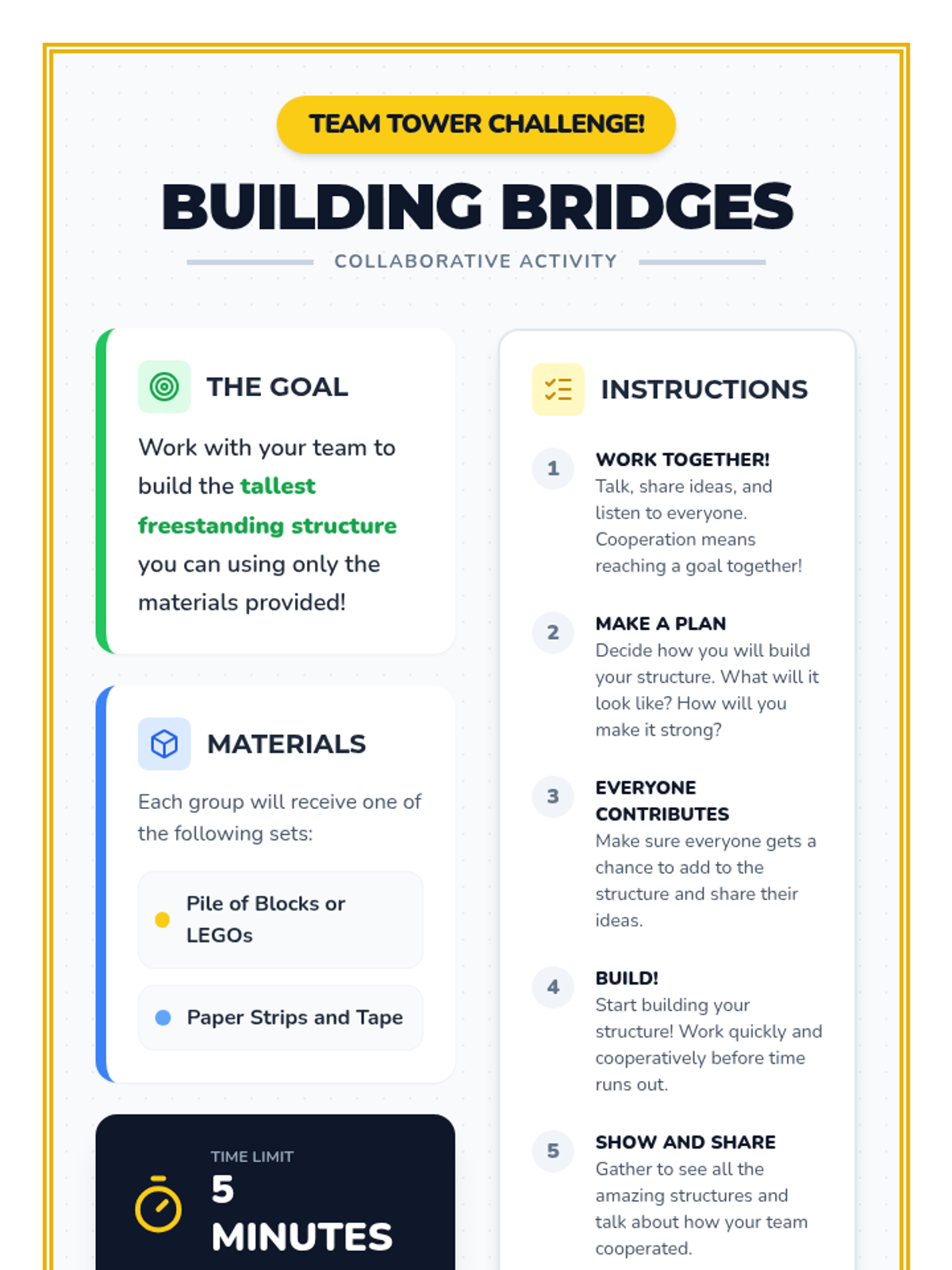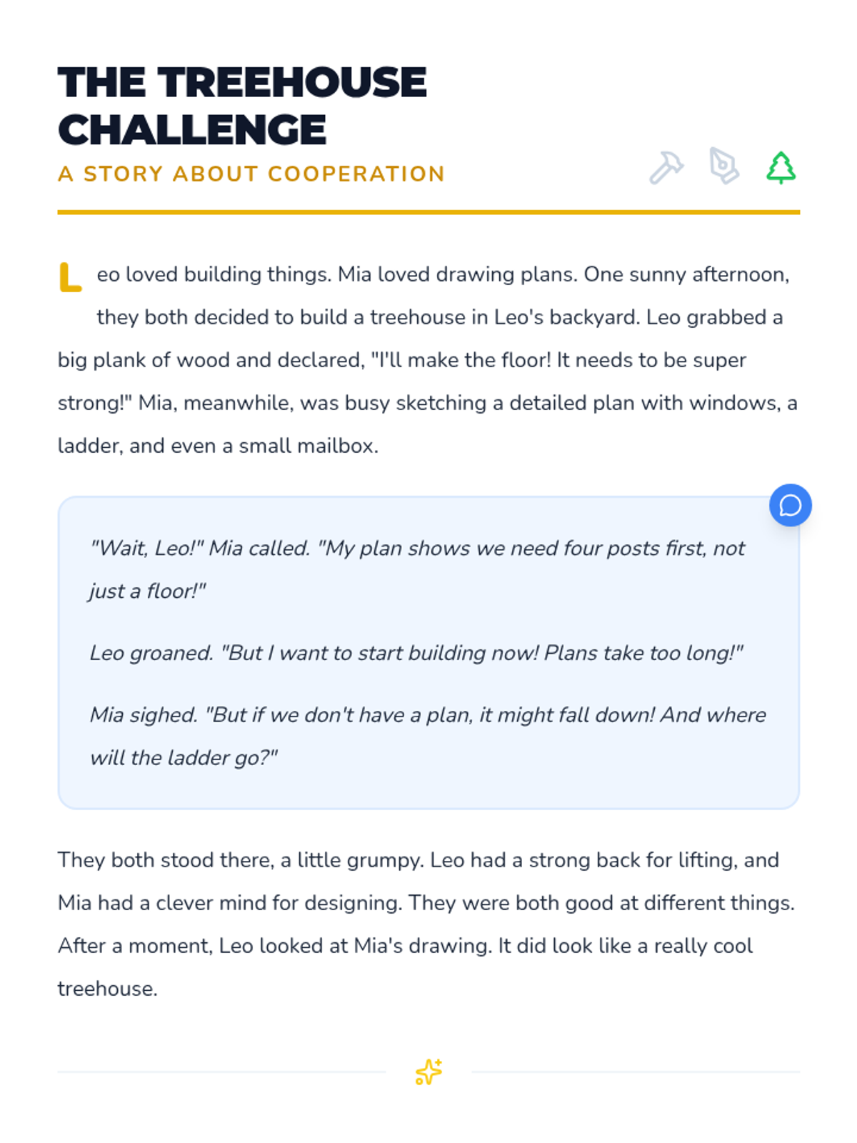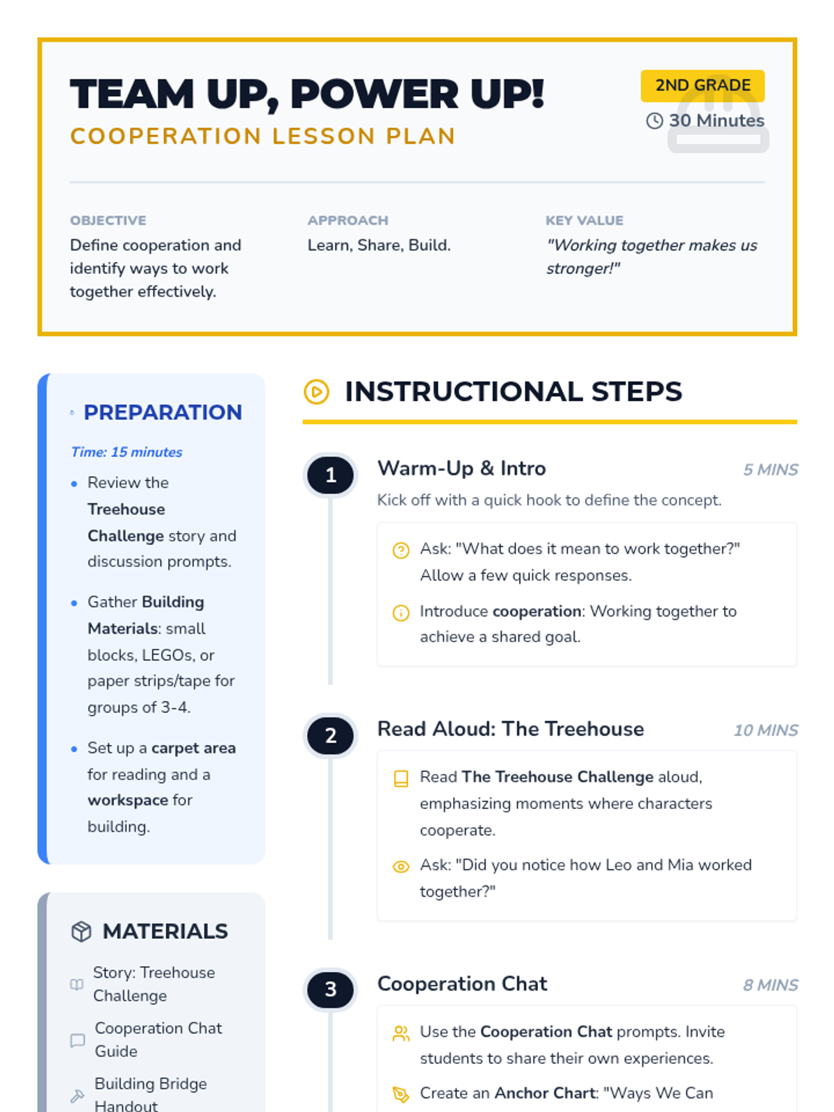 An engaging 30-minute lesson for 2nd graders focused on the power of cooperation, featuring a story about building a treehouse and a hands-on bridge-building challenge.