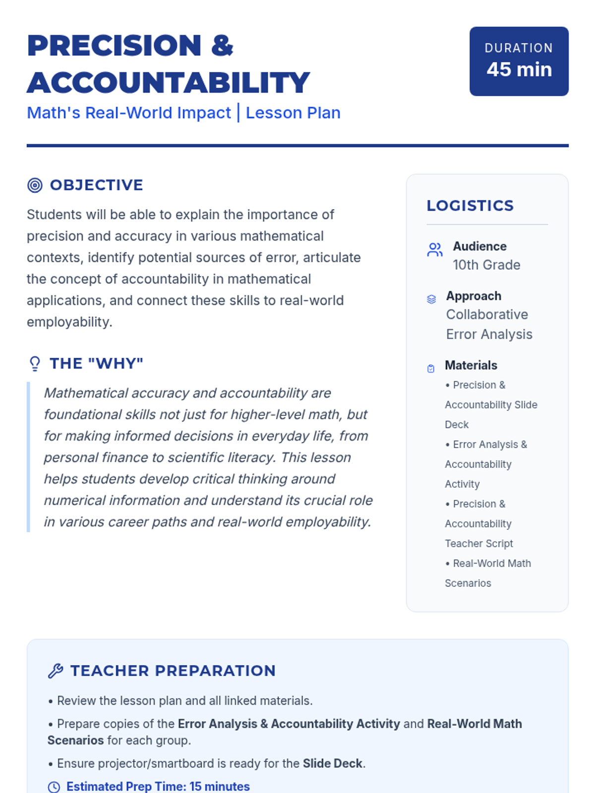 This 45-minute lesson for 10th-grade students highlights the critical role of collaboration and problem-solving skills across all mathematical domains. Students will experience how diverse perspectives and teamwork lead to more effective and robust solutions, fostering a deeper appreciation for the interconnectedness of math and real-world challenges.