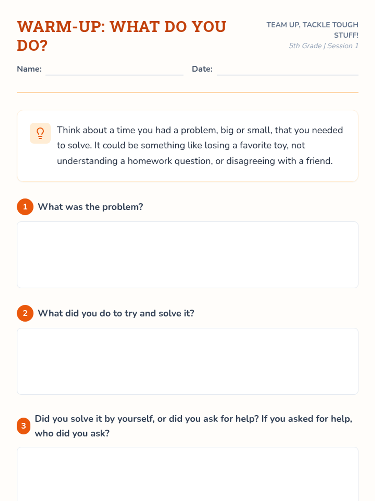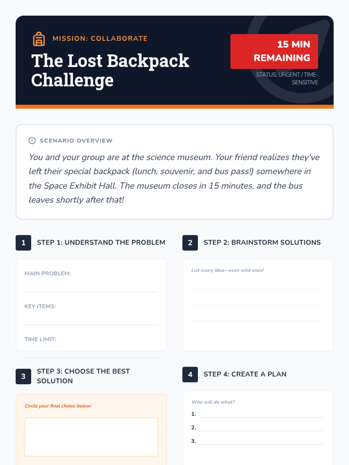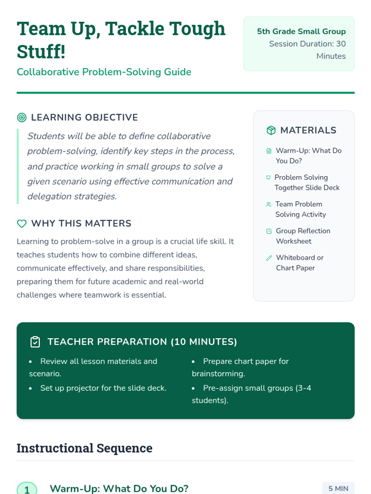 A 30-minute social-emotional learning lesson for 5th graders focused on collaborative problem-solving through the 'Lost Backpack Challenge' scenario. Students learn a 6-step framework for tackling challenges as a team.