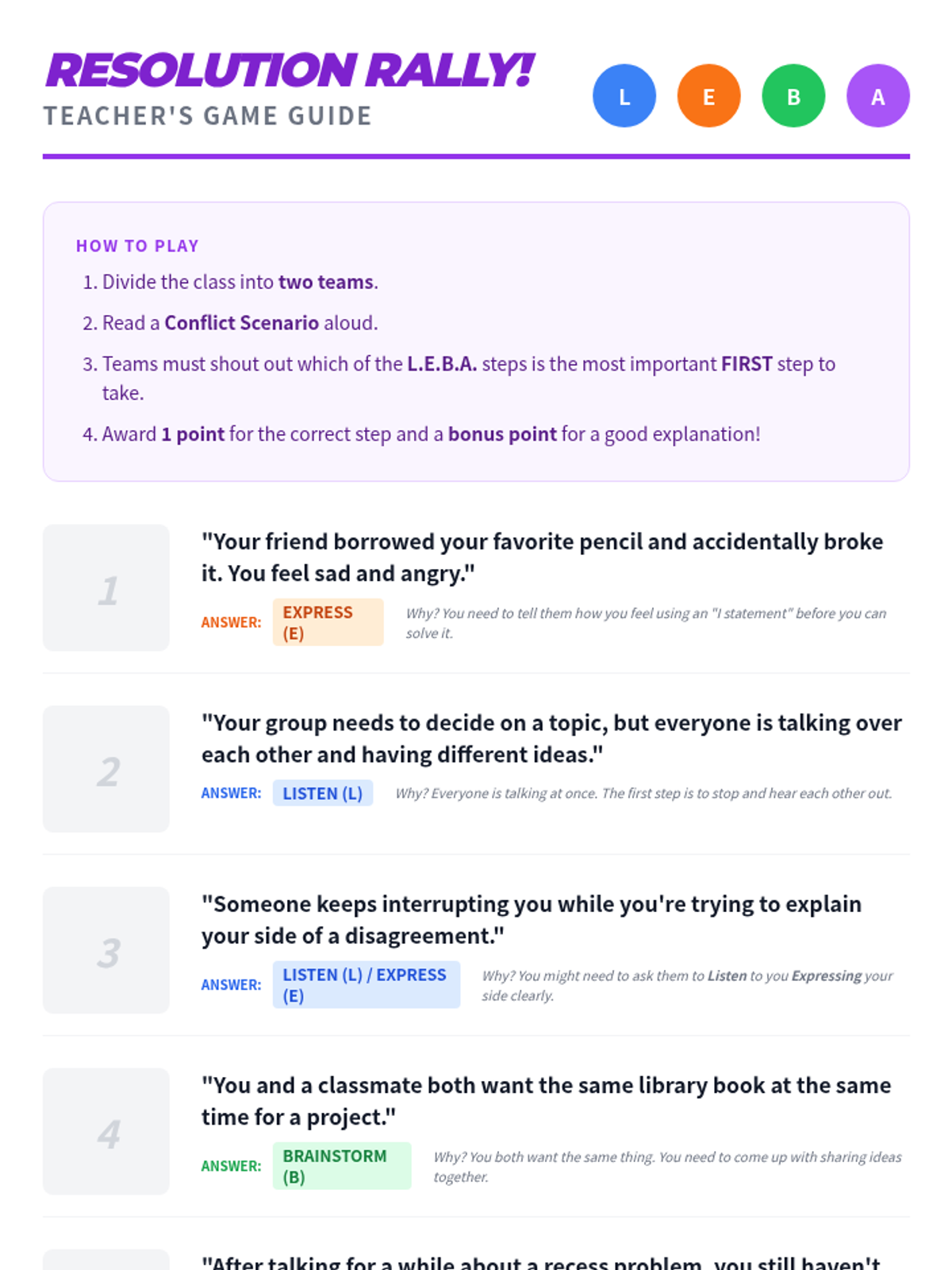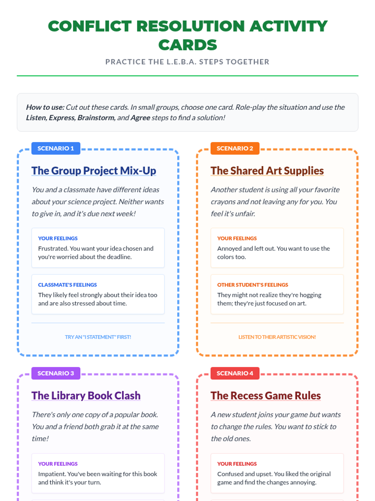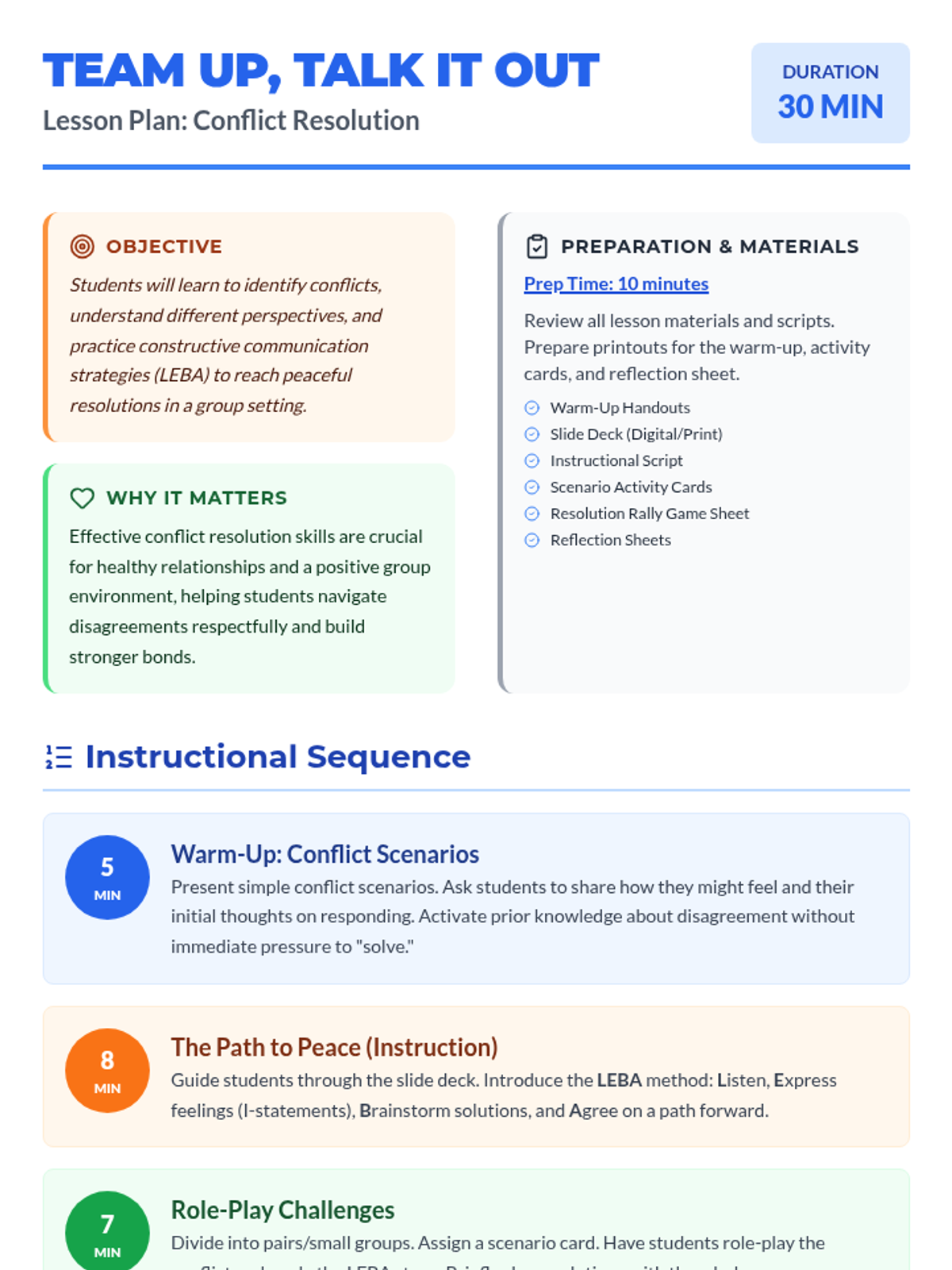 This lesson empowers small groups of students to effectively resolve conflicts by teaching practical communication and problem-solving skills using the LEBA method: Listen, Express, Brainstorm, and Agree.