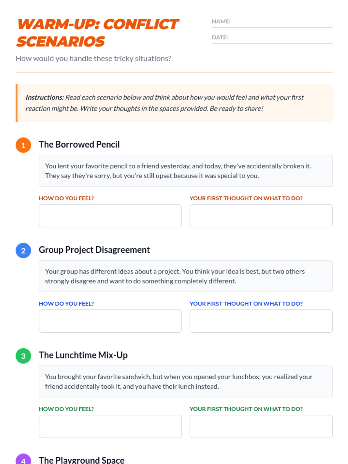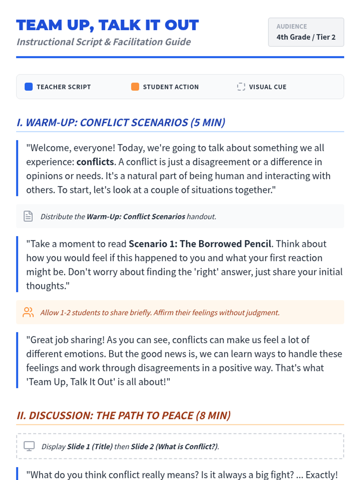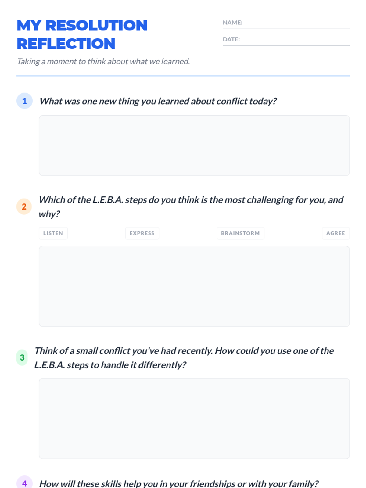 This lesson empowers small groups of students to effectively resolve conflicts by teaching practical communication and problem-solving skills using the LEBA method: Listen, Express, Brainstorm, and Agree.