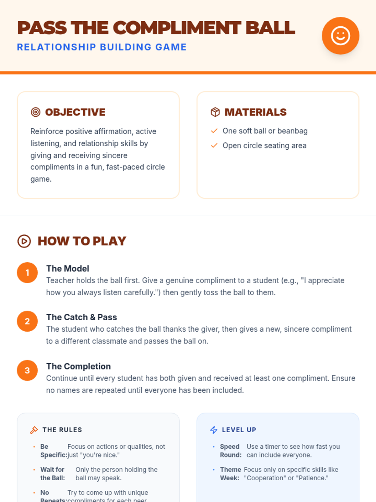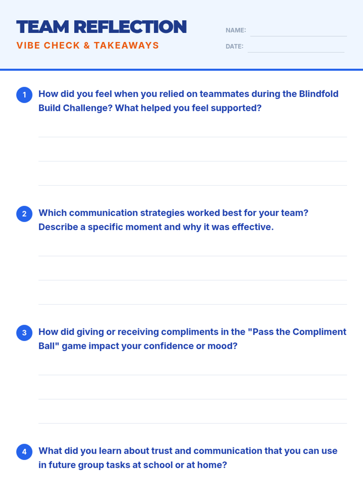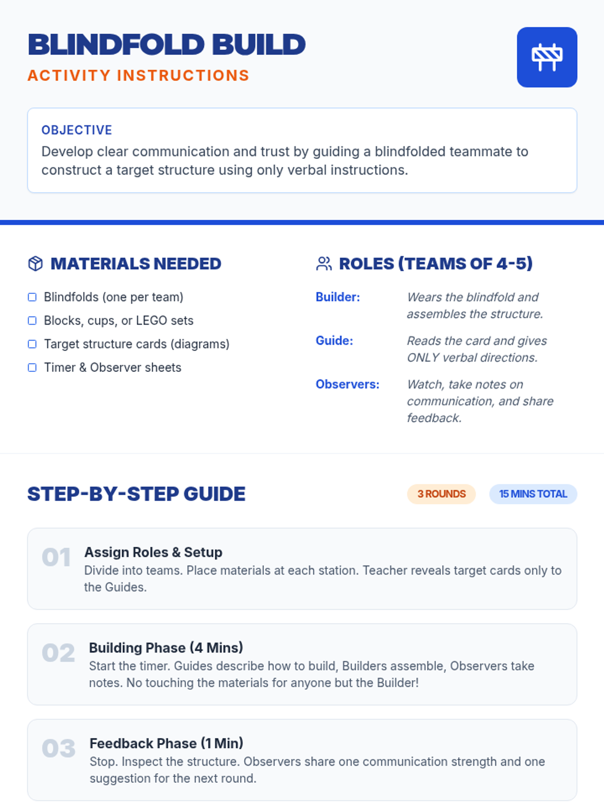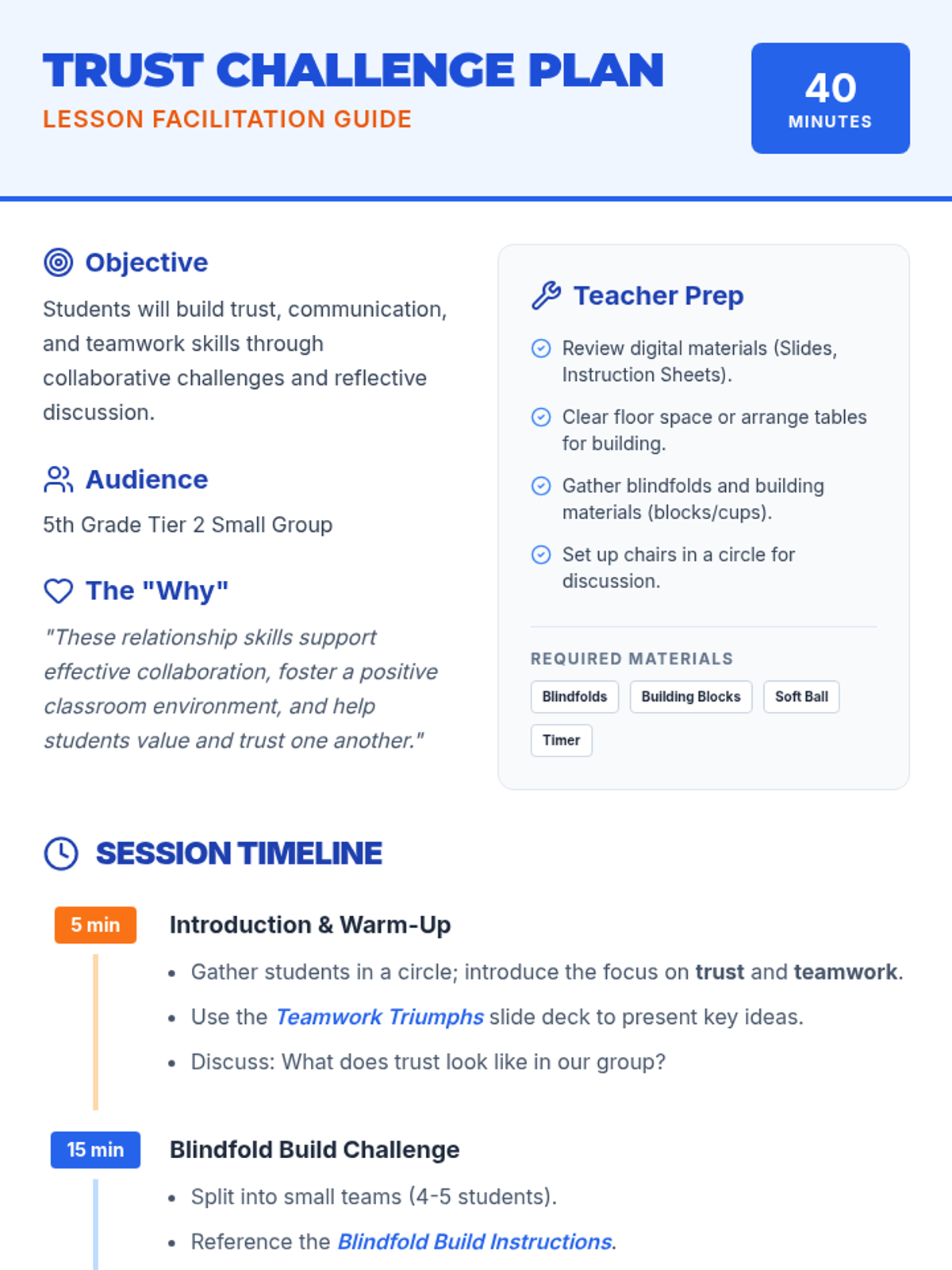 A short, energetic small-group session for 5th graders focused on building trust, communication, and teamwork through hands-on challenges and reflection.