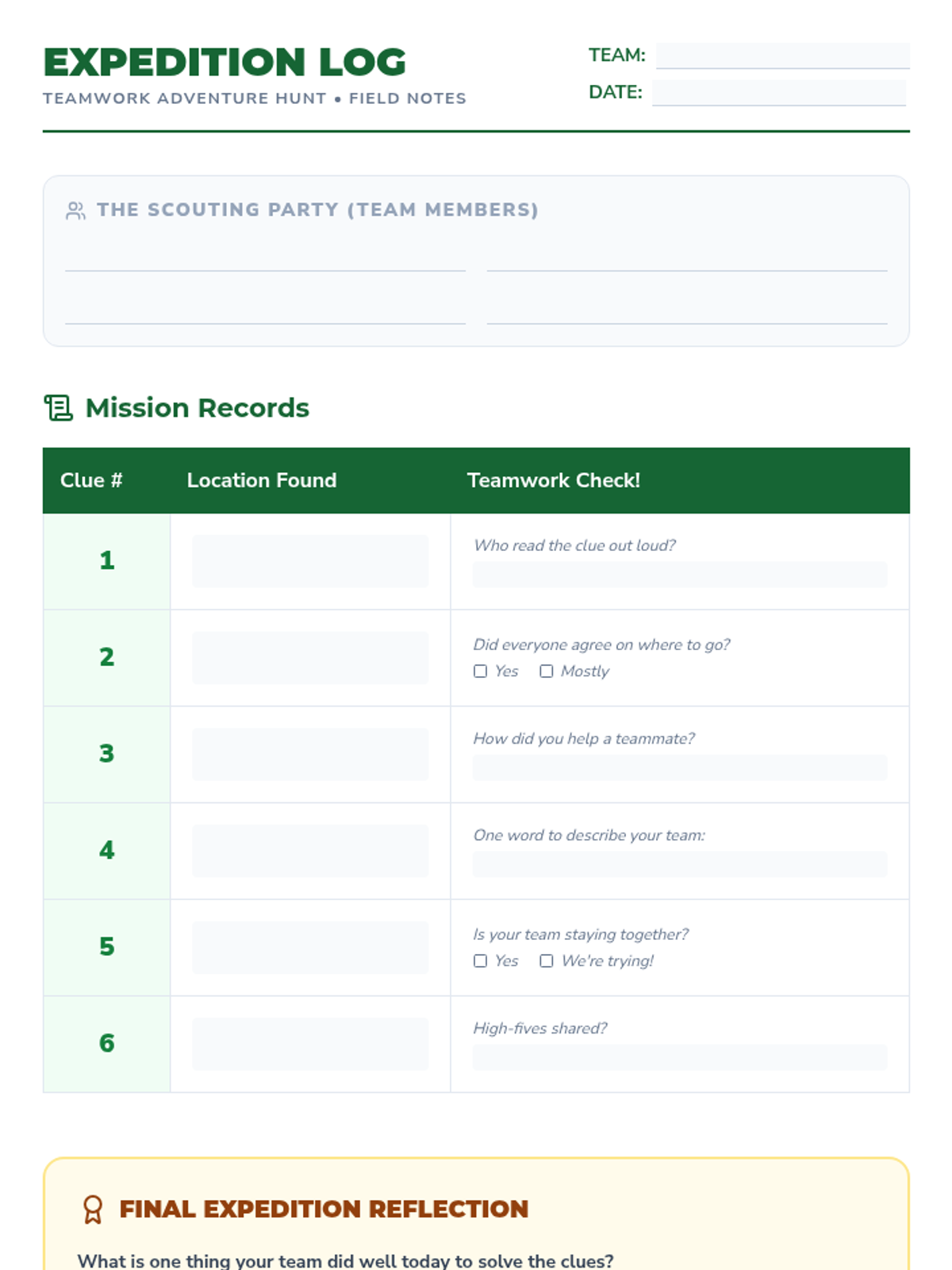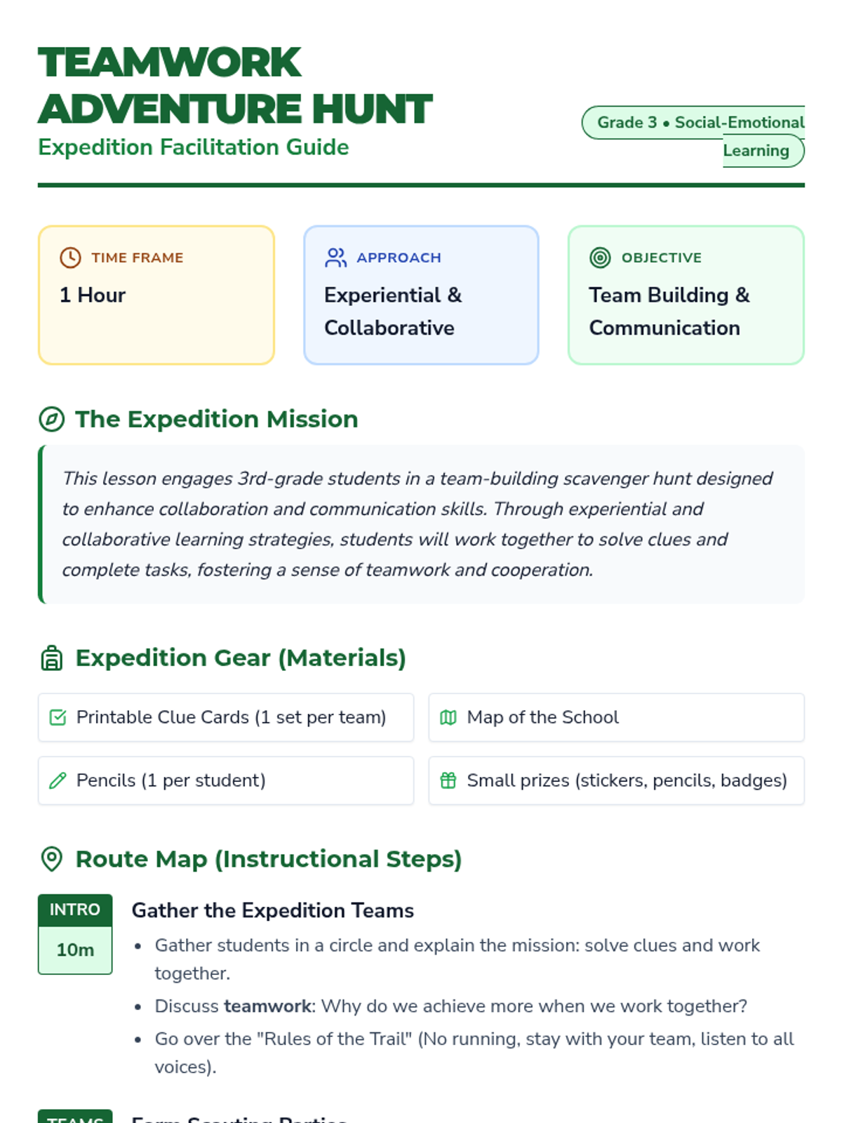 A high-energy team-building lesson where 3rd graders work in teams to solve clues and navigate their school environment. This lesson focuses on collaborative communication, critical thinking, and social-emotional growth through experiential learning.