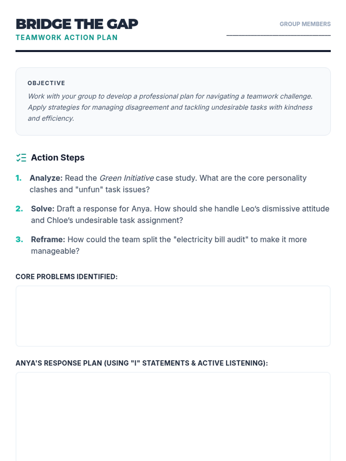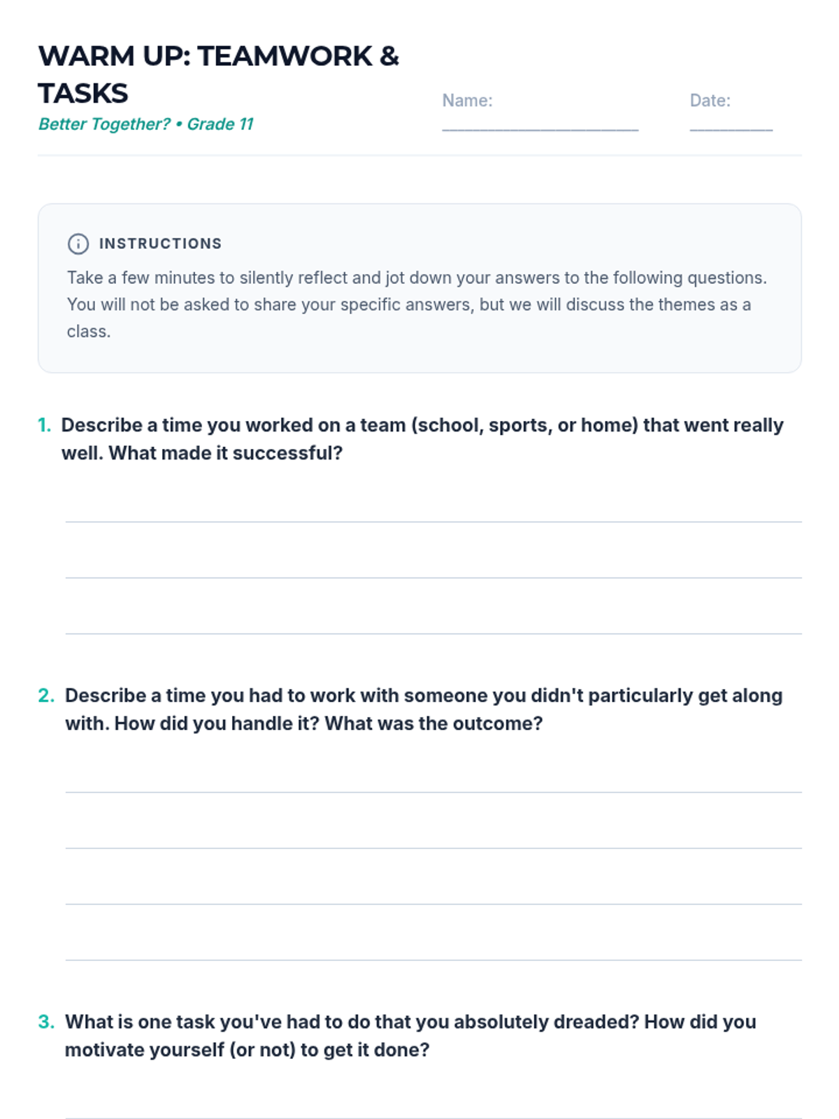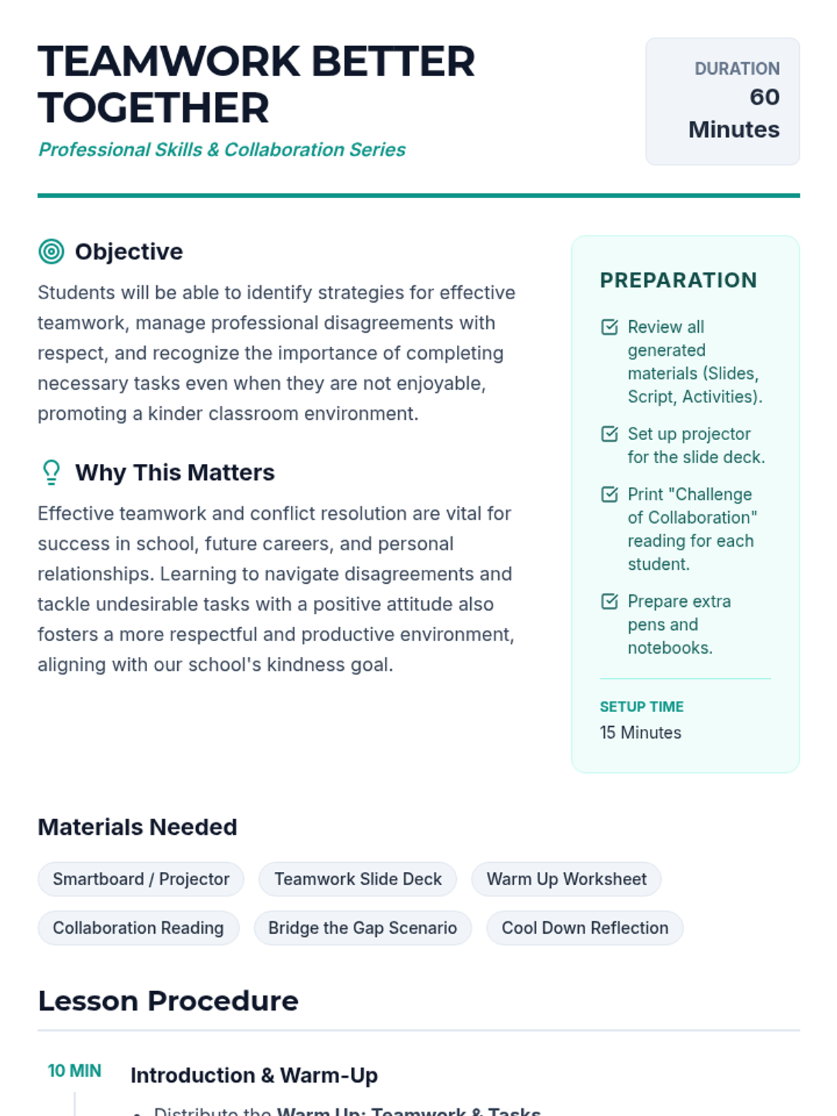 A 60-minute lesson for 11th-grade students focused on effective teamwork, professional conflict resolution, and the value of completing less-glamorous tasks as part of a team effort.