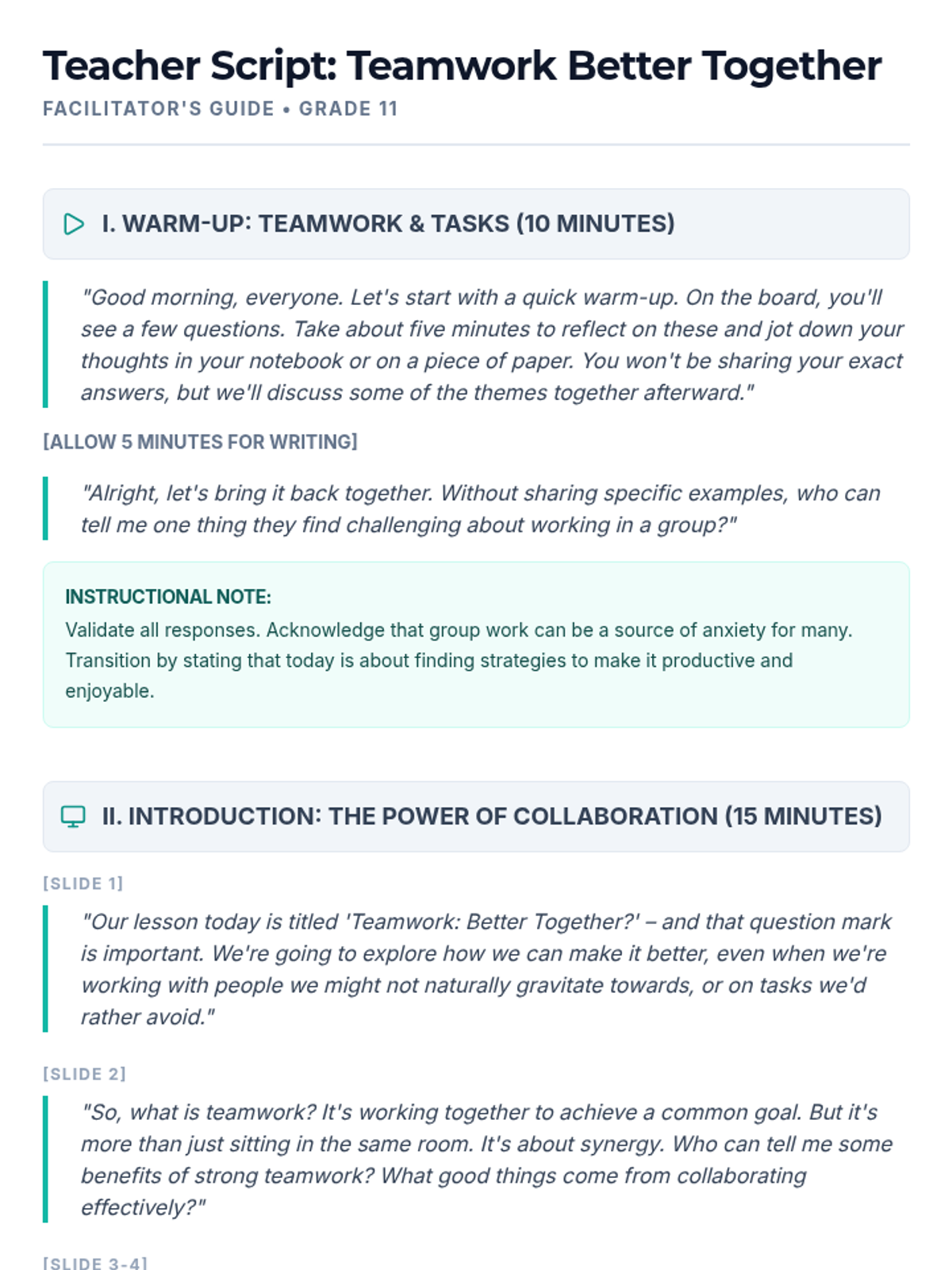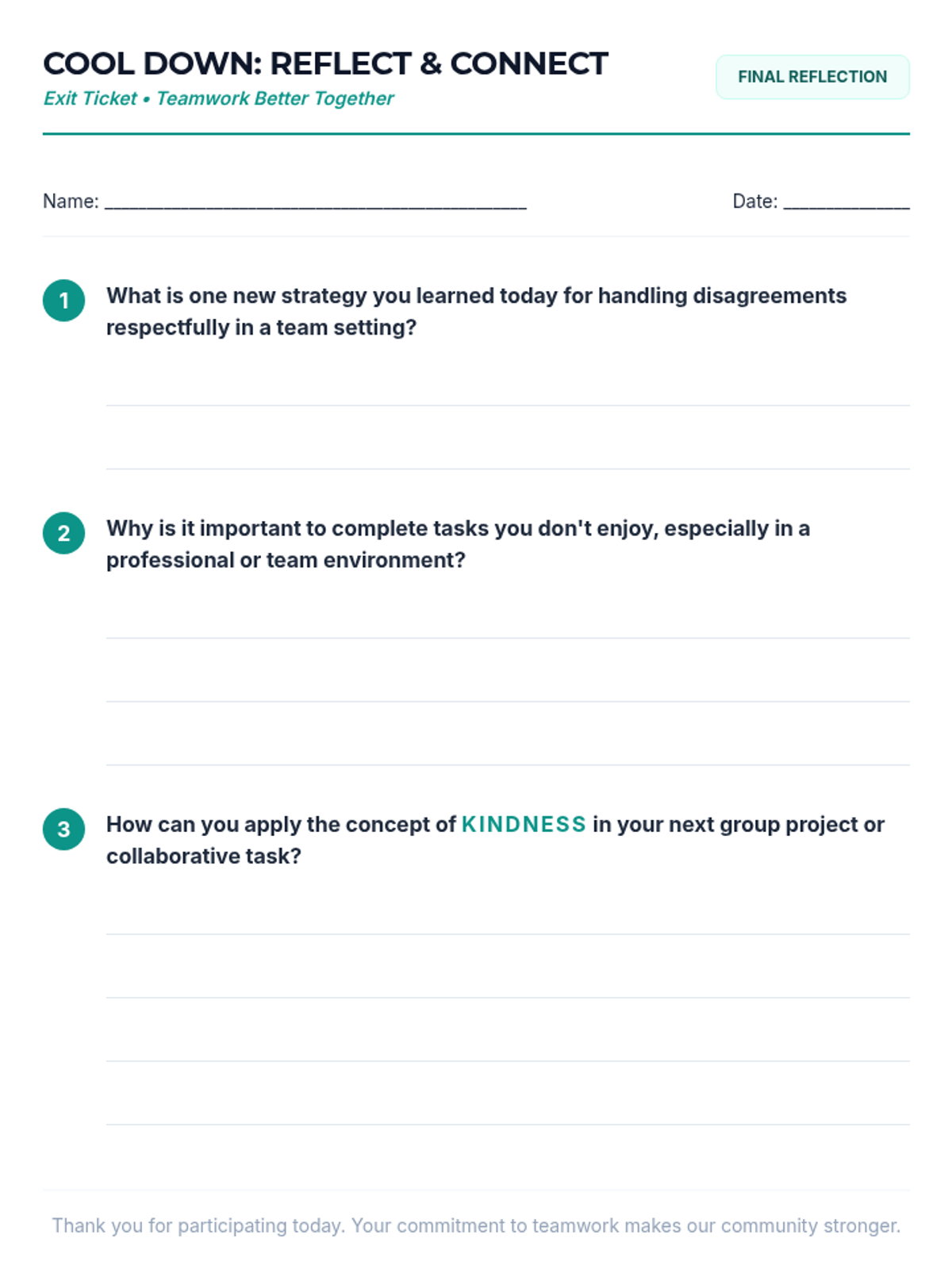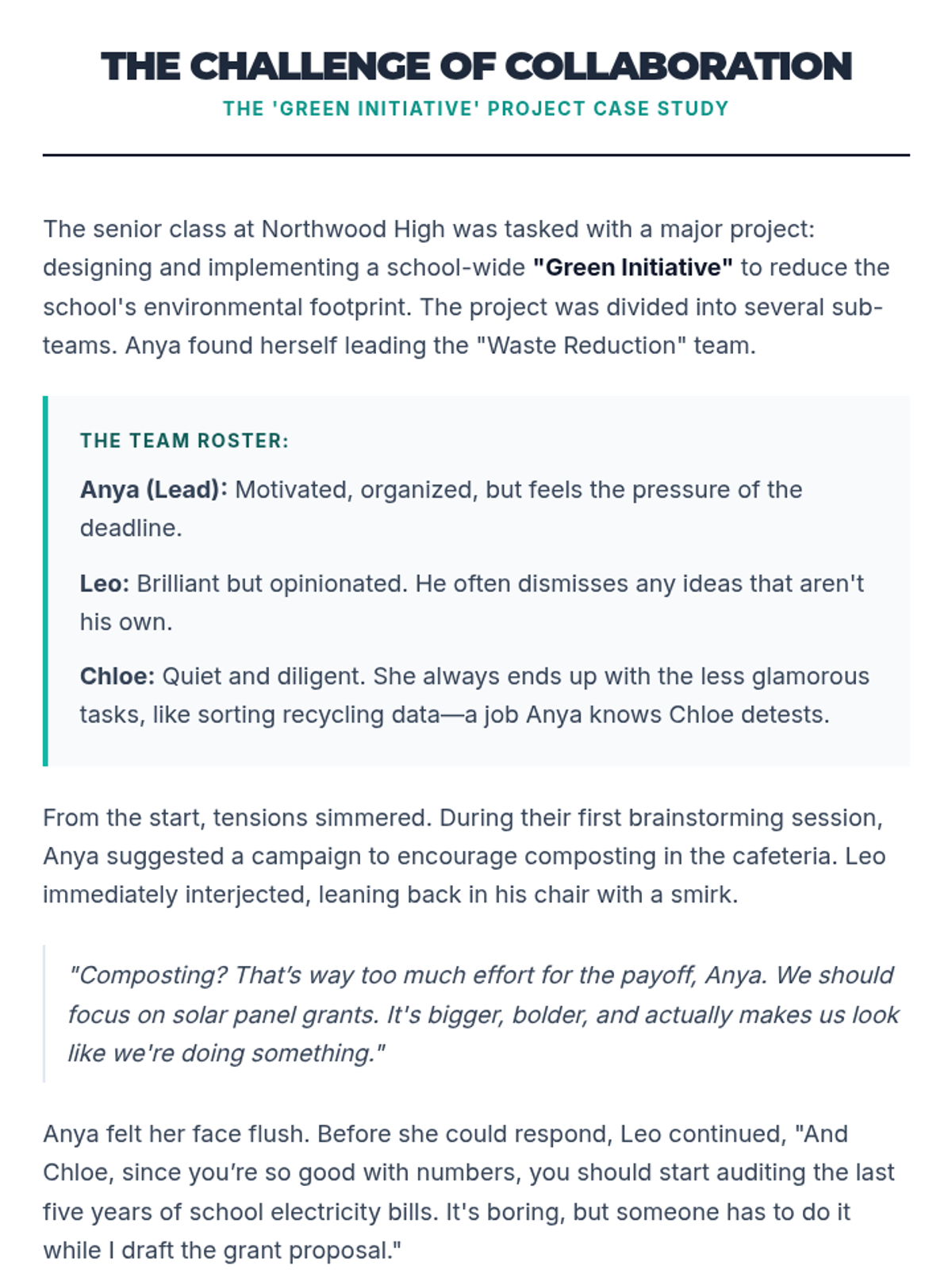 A 60-minute lesson for 11th-grade students focused on effective teamwork, professional conflict resolution, and the value of completing less-glamorous tasks as part of a team effort.