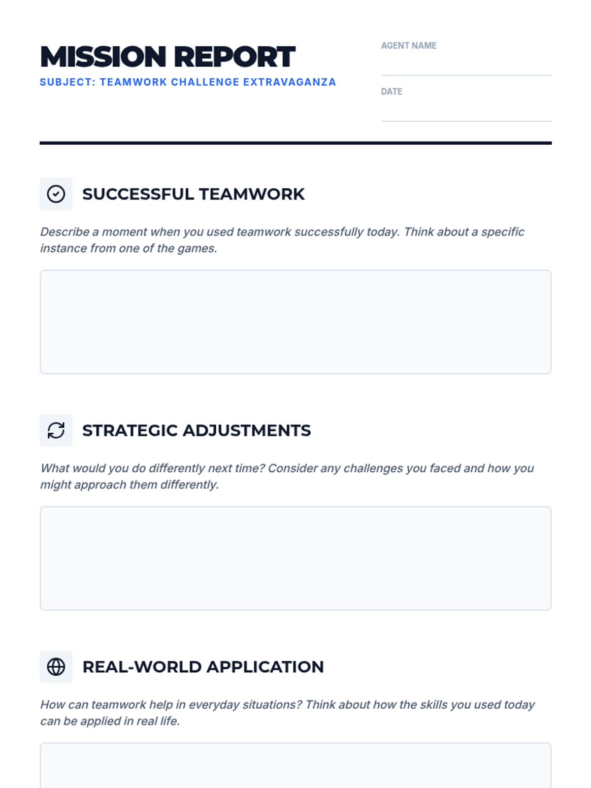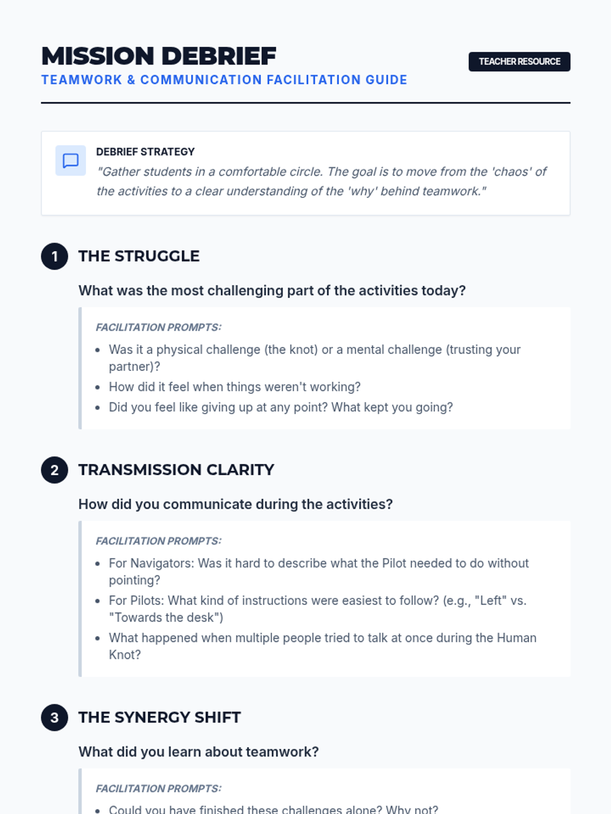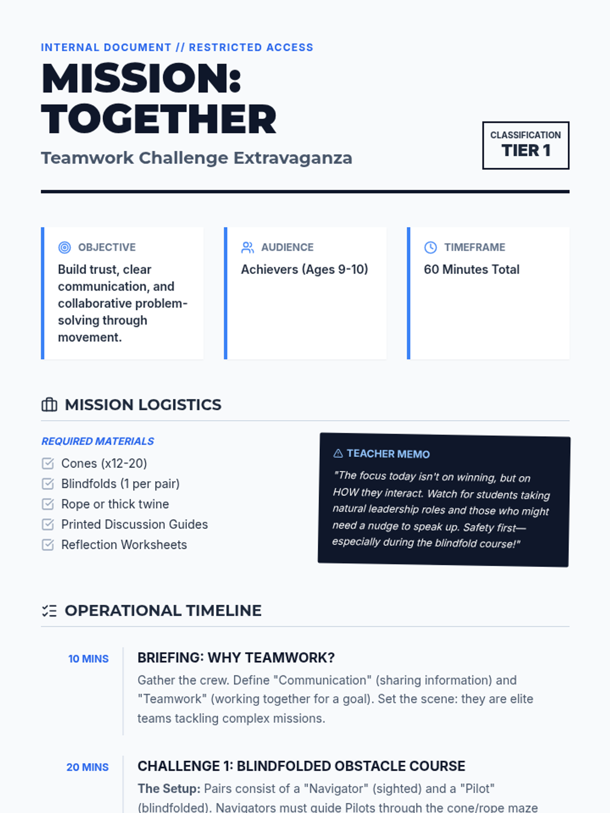 A high-energy, activity-based lesson where students participate in cooperative games like 'Blindfolded Obstacle Course' and 'Human Knot' to build communication, trust, and problem-solving skills.