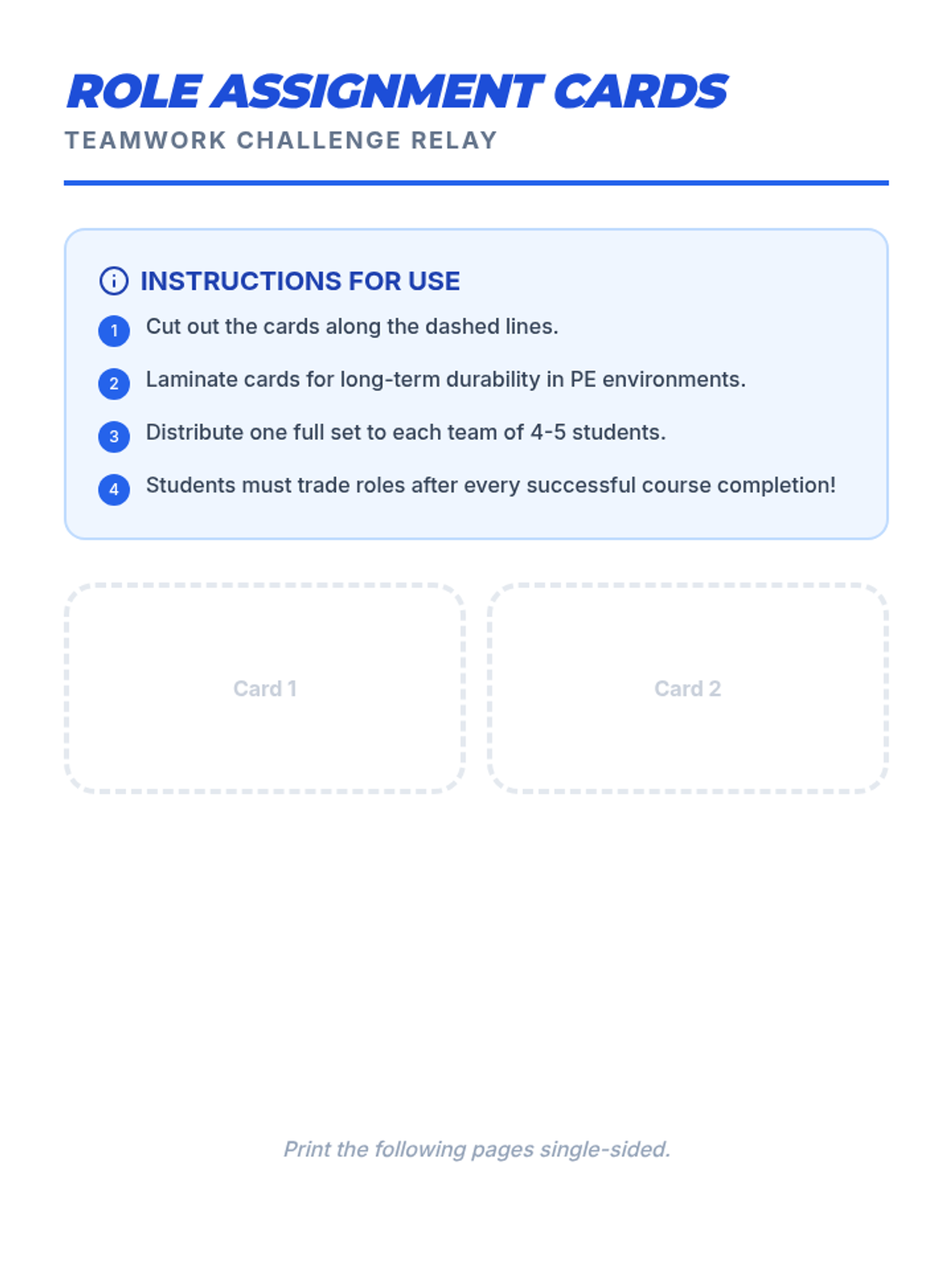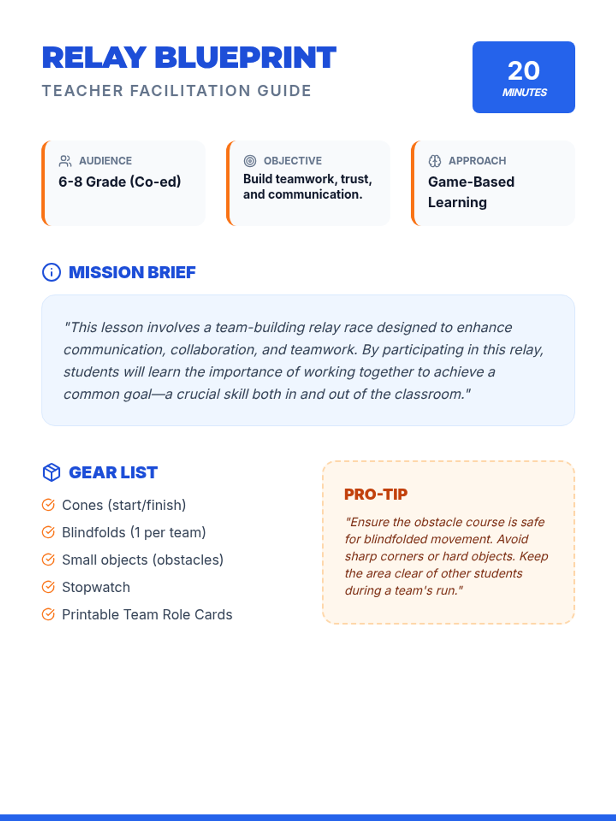 A high-energy PE lesson focused on communication and trust through a blindfolded obstacle course relay. Students rotate through roles like Leader, Navigator, and Encourager to work together and beat the clock.