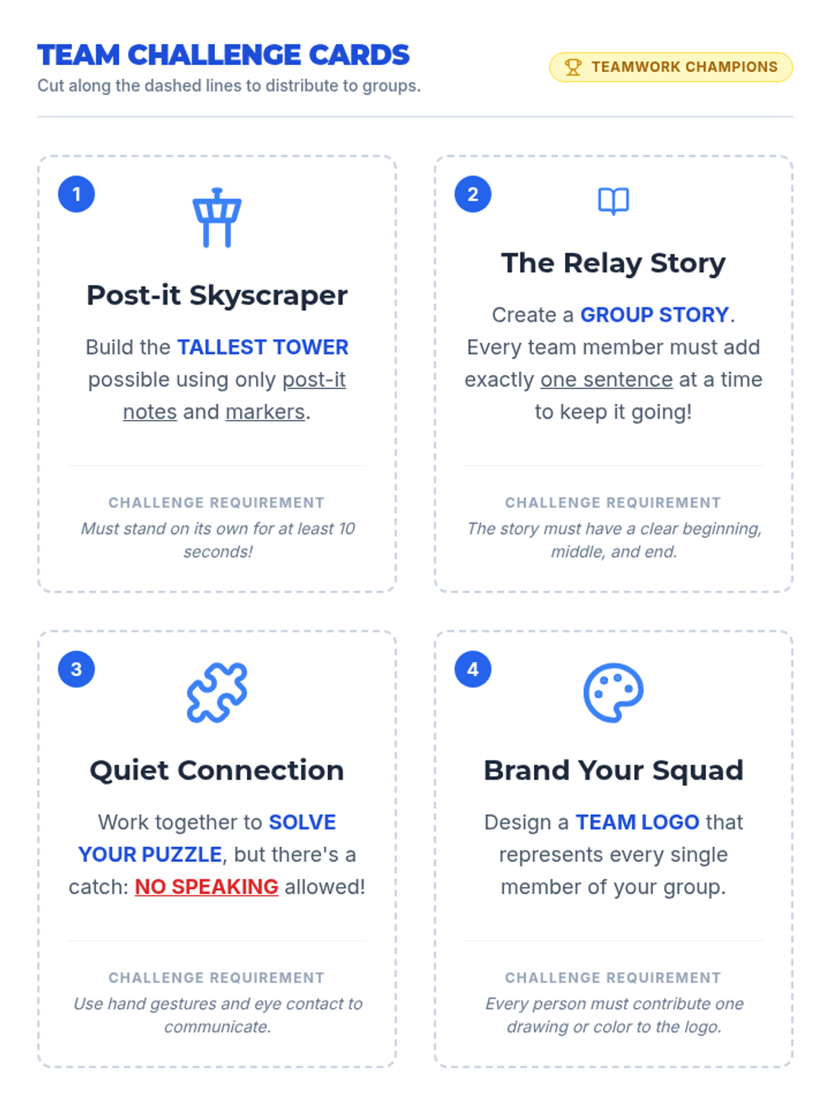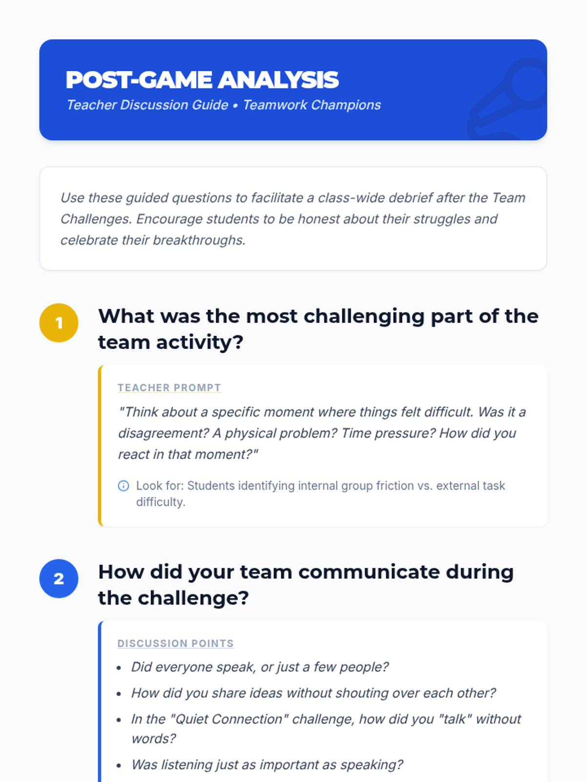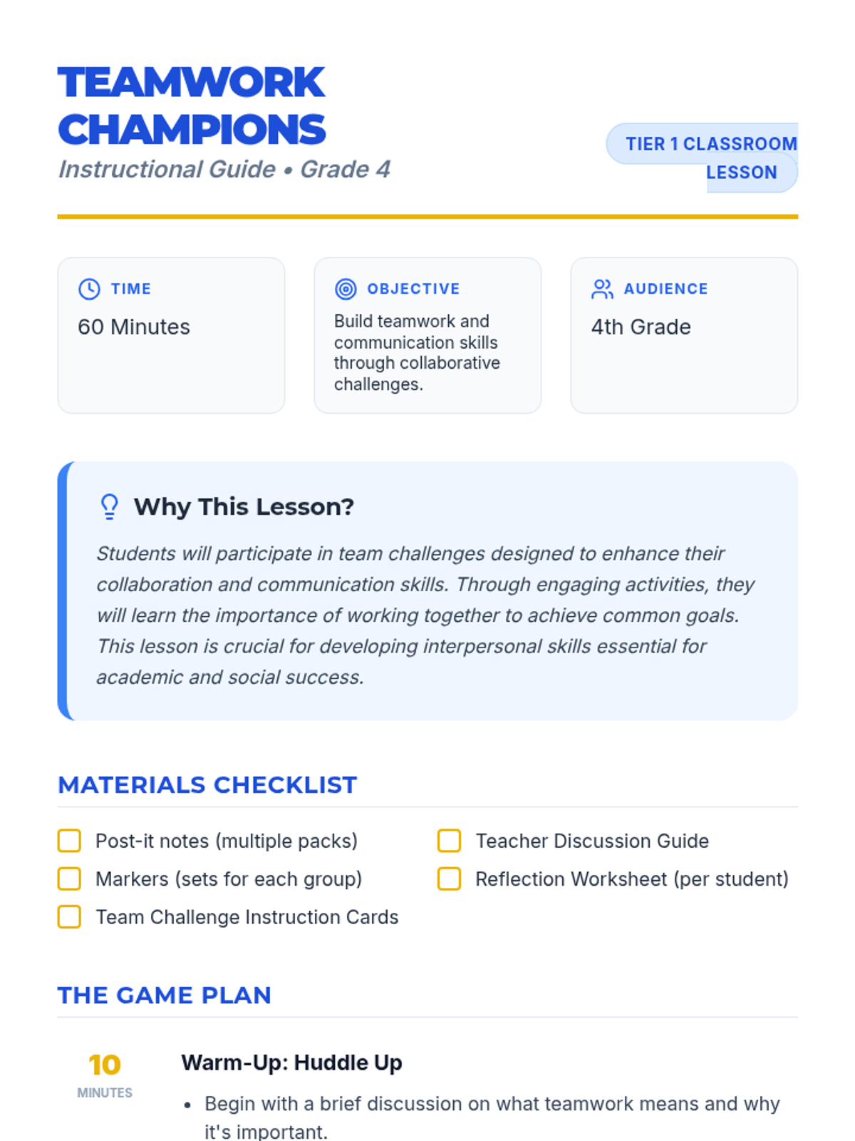A high-energy lesson where 4th-grade students engage in collaborative challenges to strengthen their communication and teamwork skills through hands-on activities and reflection.