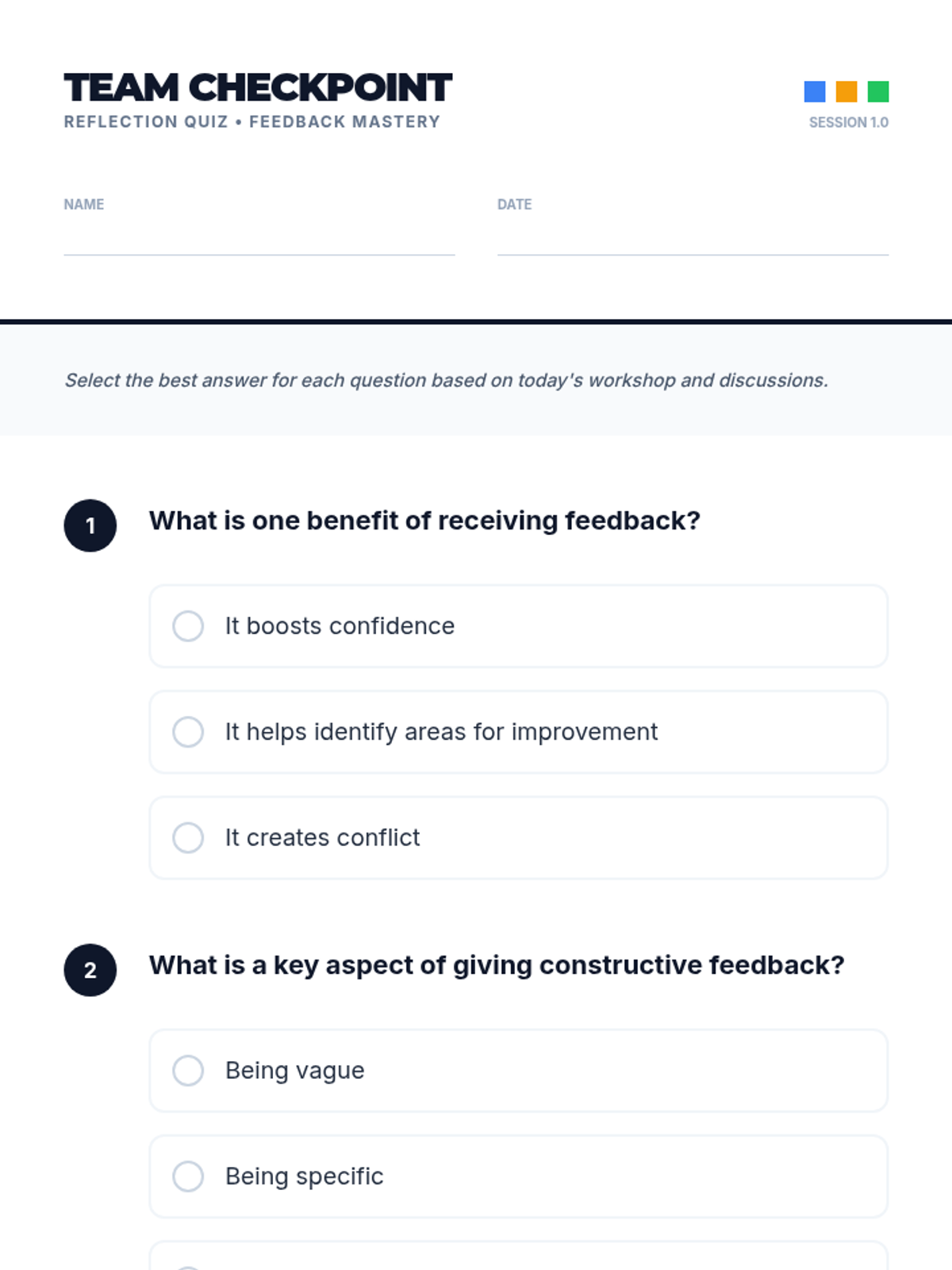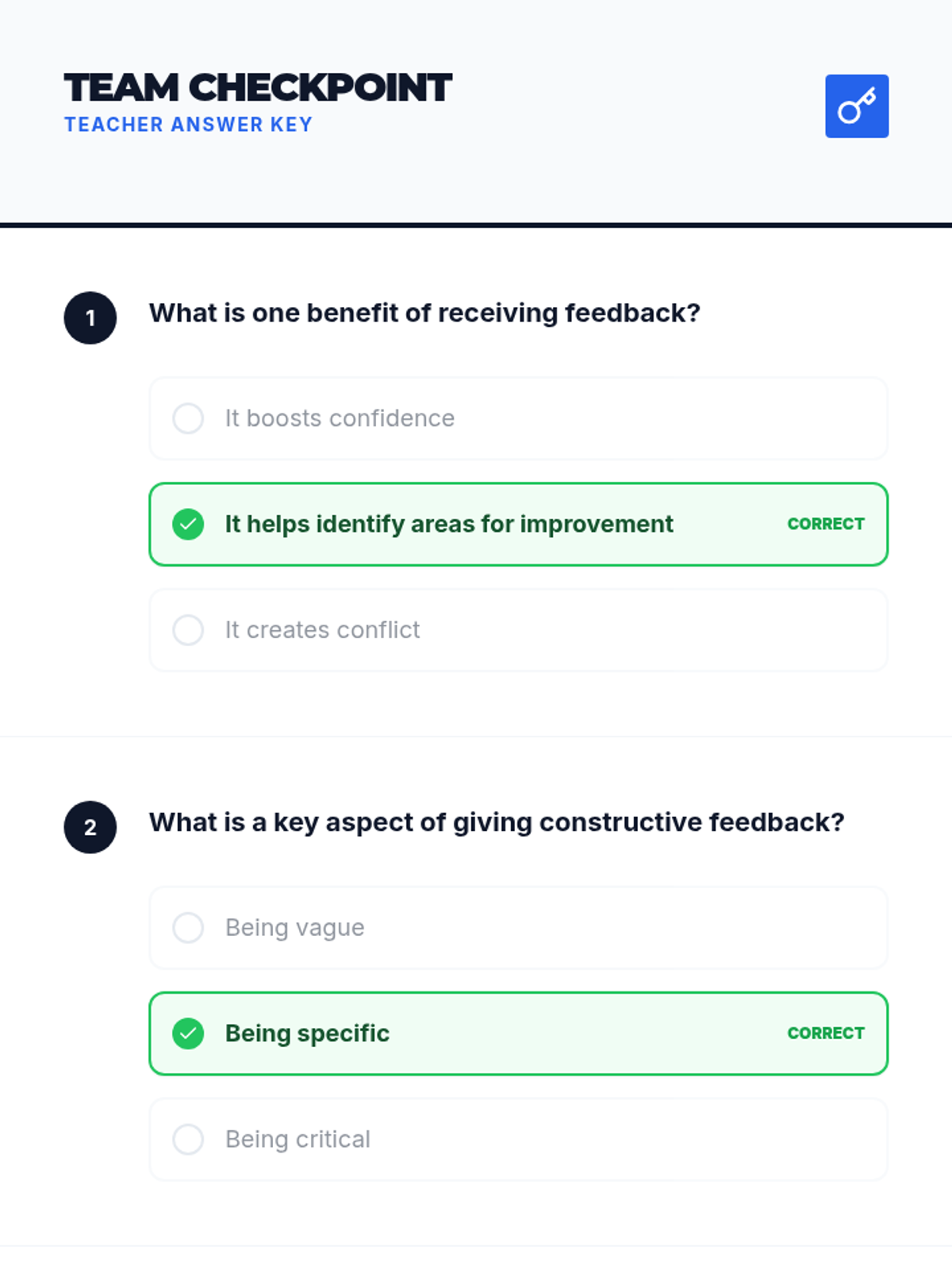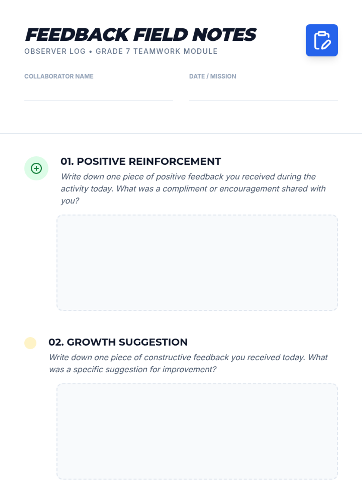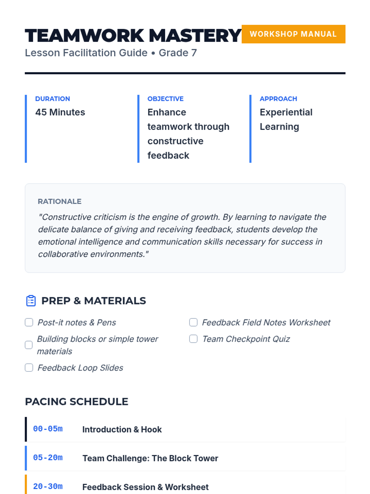 A lesson focused on developing communication skills through team-building exercises and practicing constructive feedback. Students learn to offer and accept suggestions to improve group performance and foster a collaborative environment.