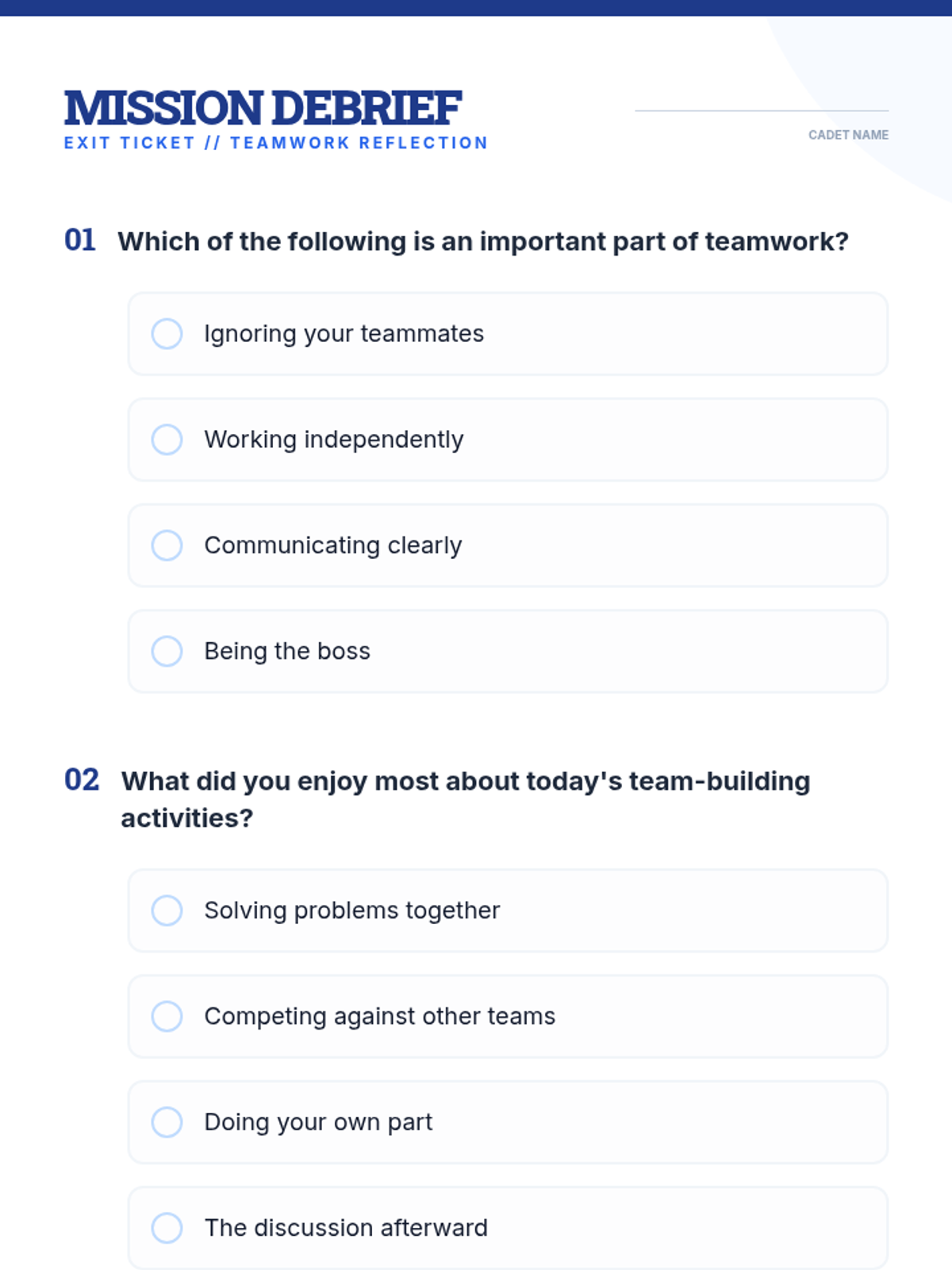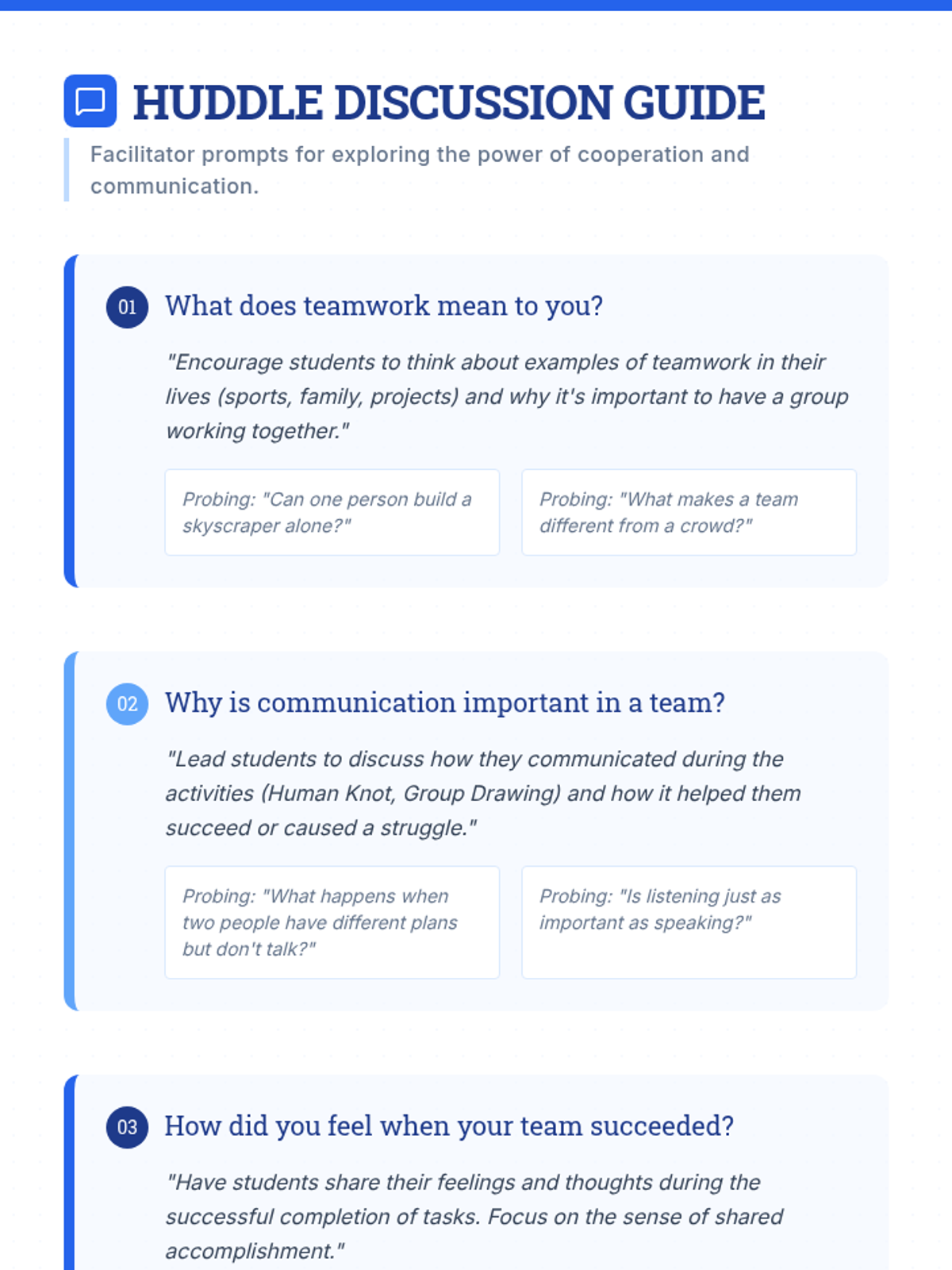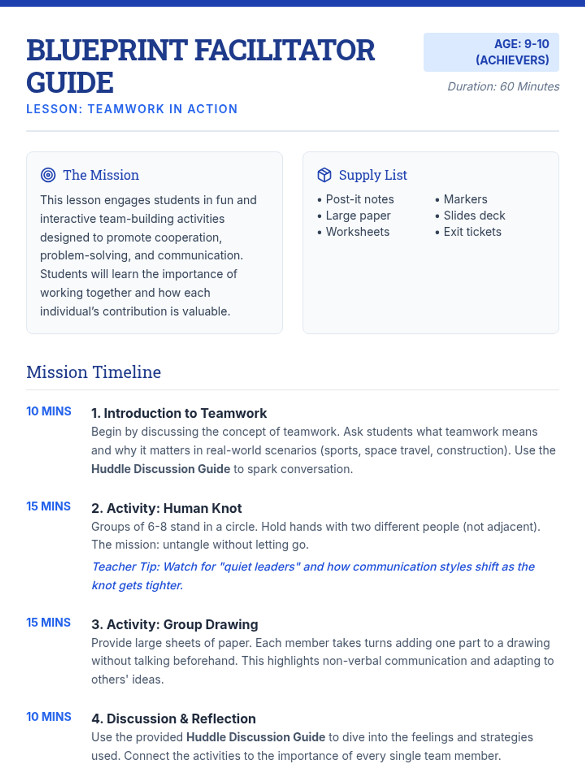 An interactive lesson for ages 9-10 focused on cooperation, problem-solving, and communication through hands-on team-building activities.