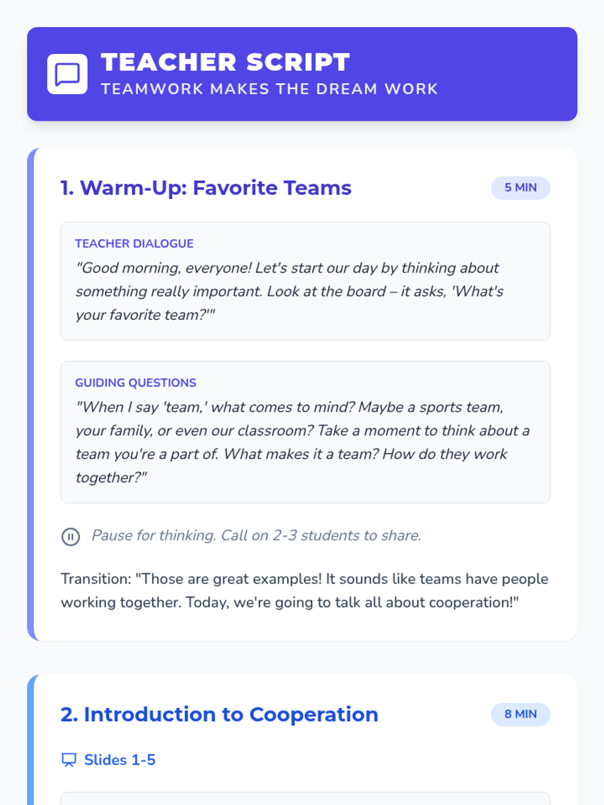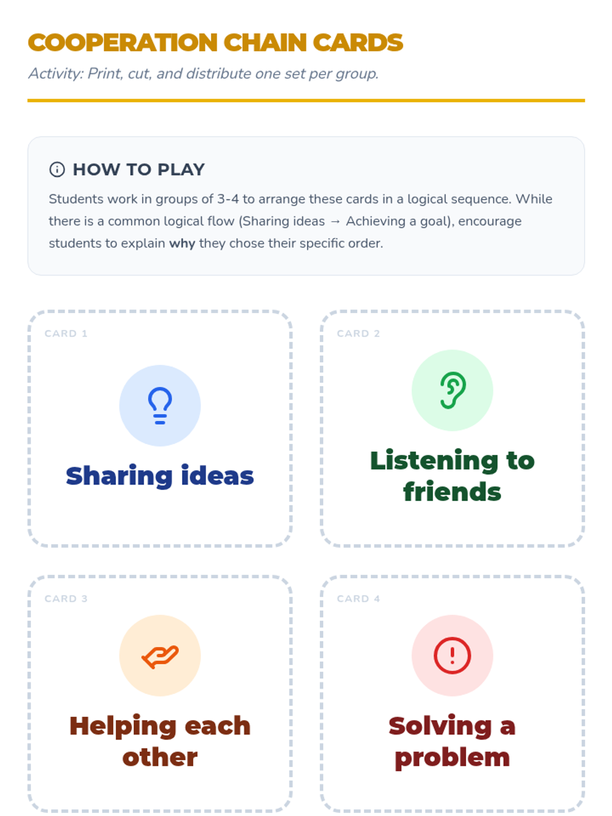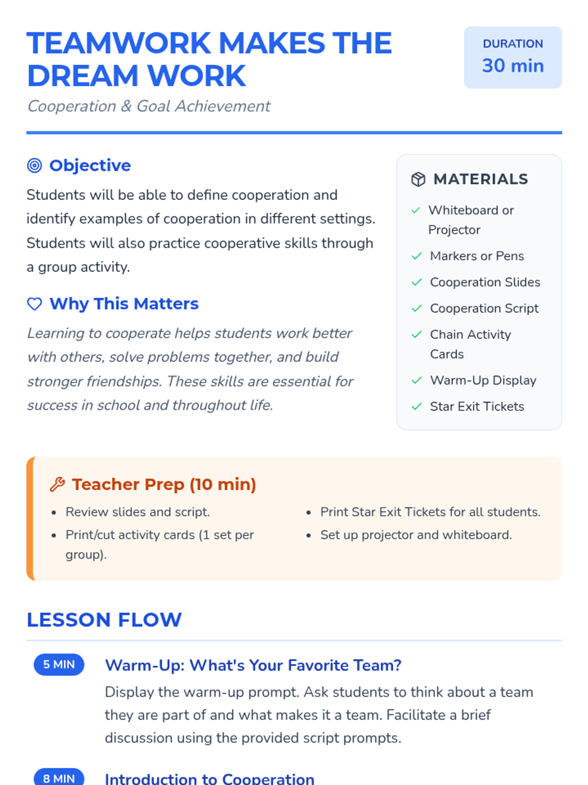 A 30-minute lesson for 2nd graders that introduces the concept of cooperation through interactive discussion, a slide presentation, and a hands-on card-sequencing activity.