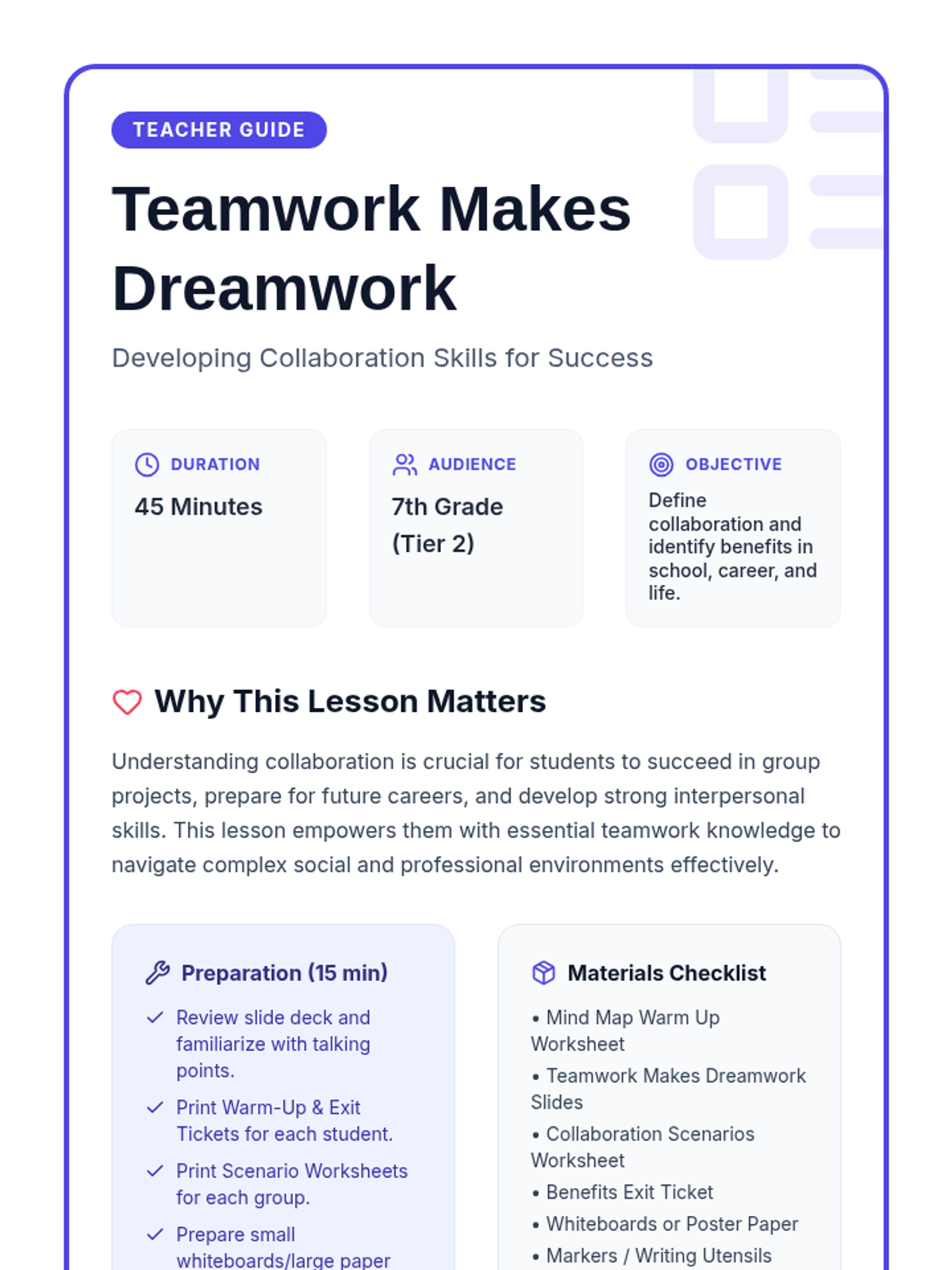 A 45-minute Tier 2 small group lesson for 7th graders to explore the power of collaboration across school, work, and personal life.