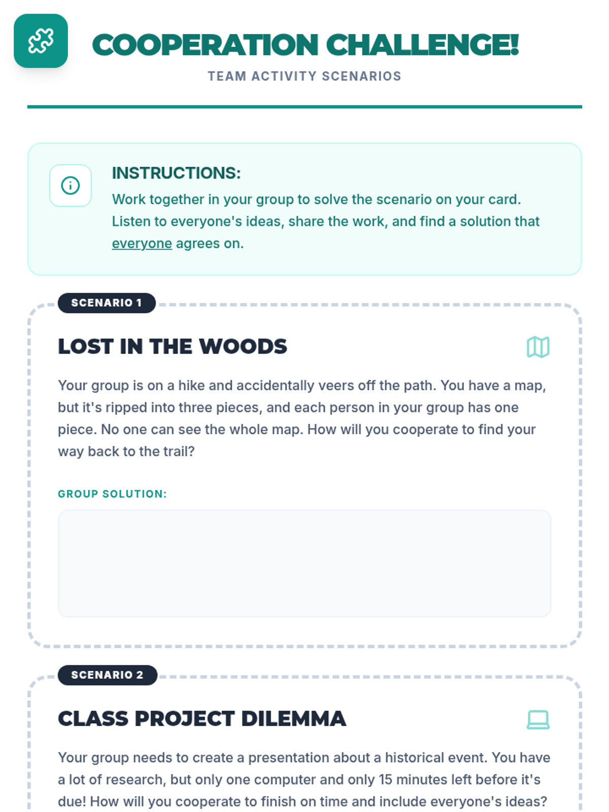 Practical team-based synergy challenges to apply collaborative problem-solving skills.