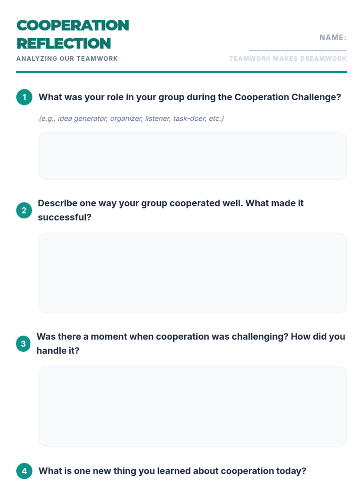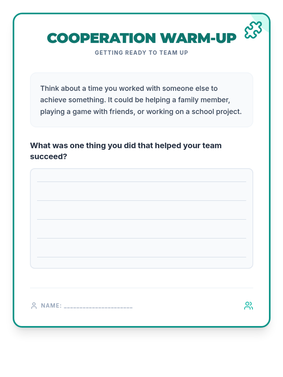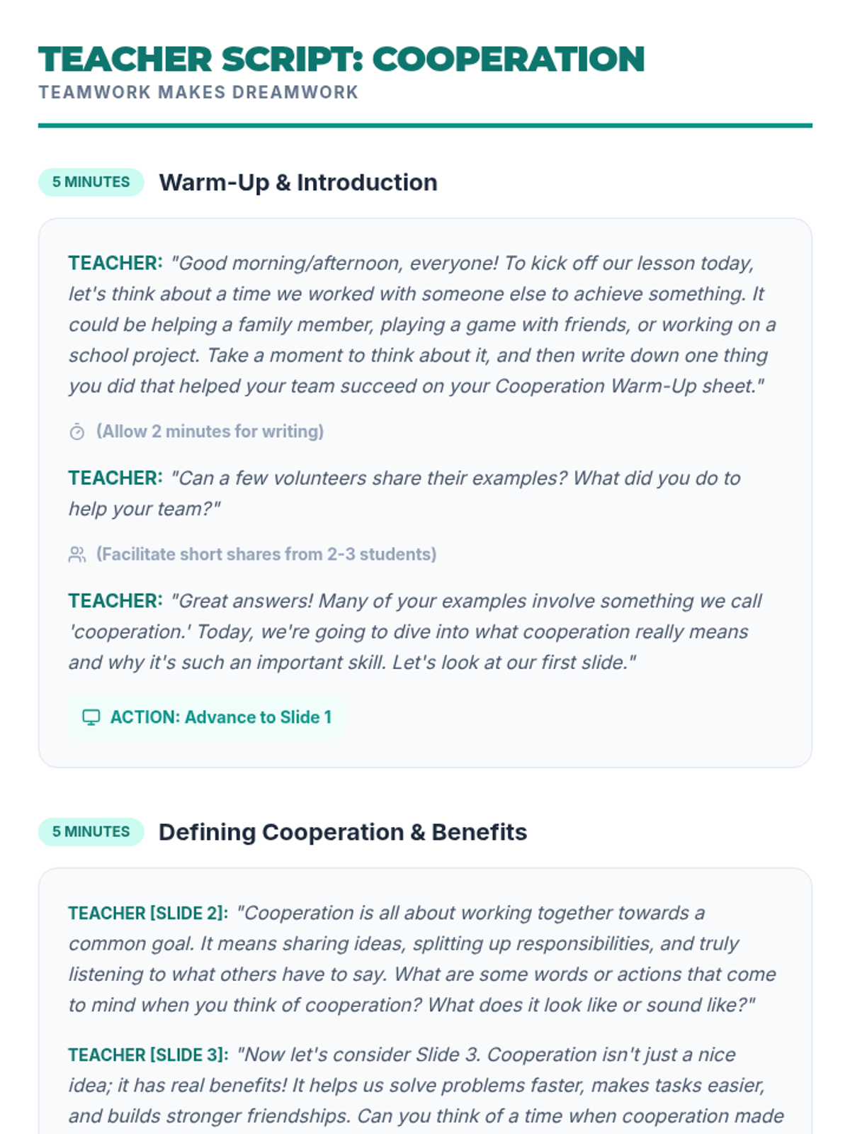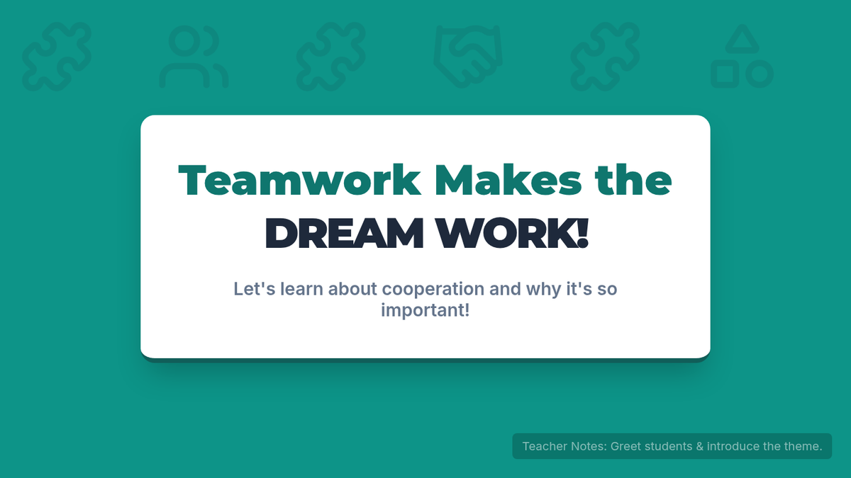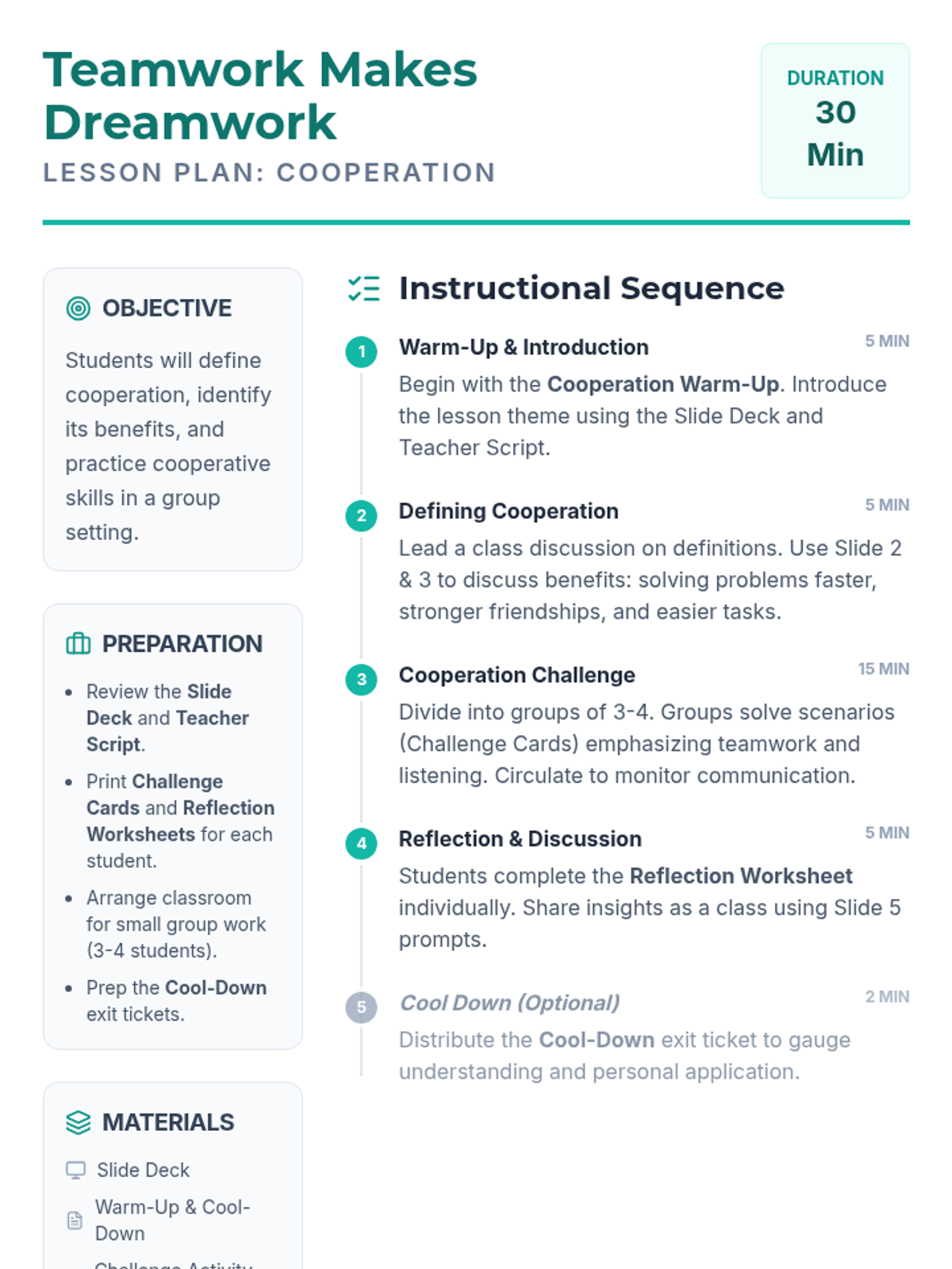 A 30-minute lesson for 5th-grade students exploring the concept of cooperation, its benefits, and practical application through a collaborative challenge activity.
