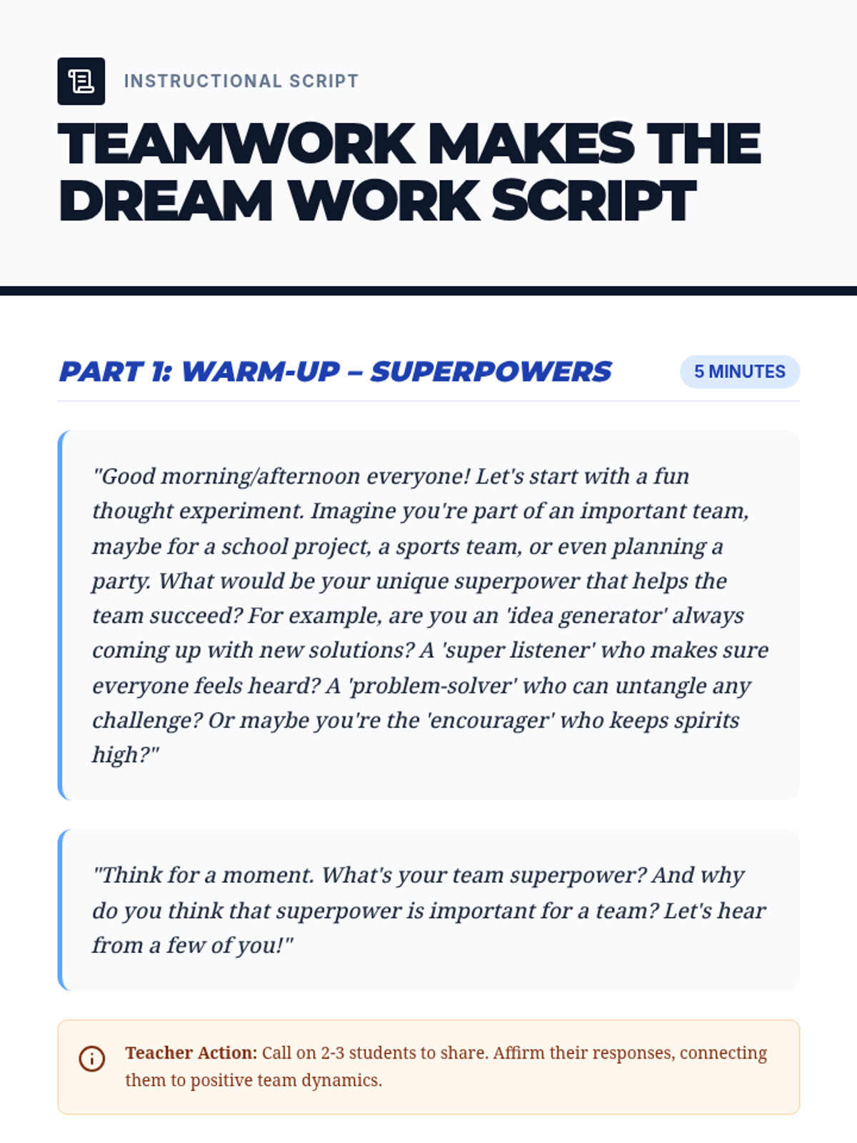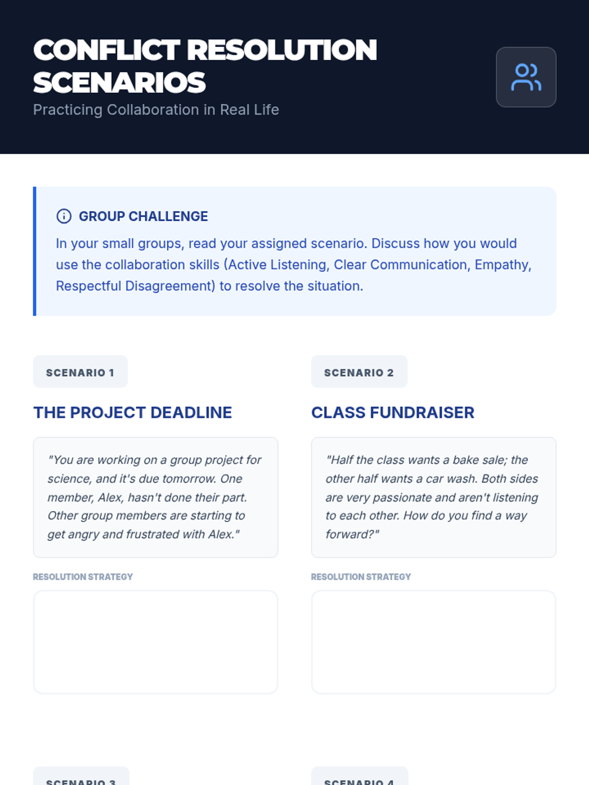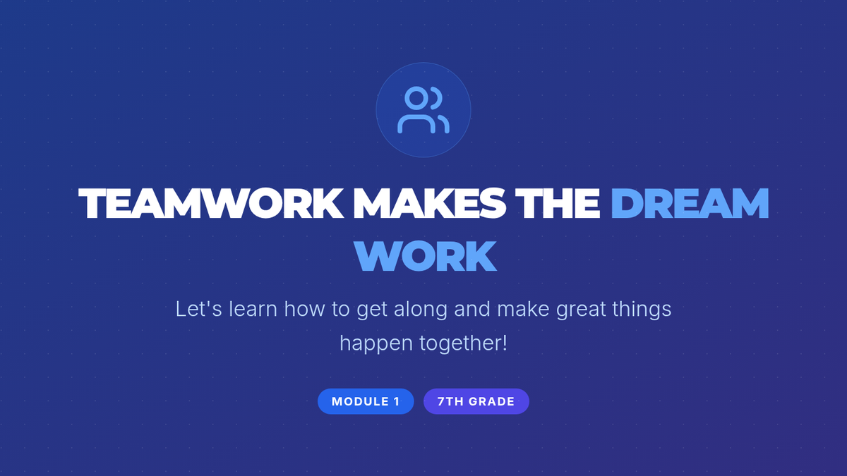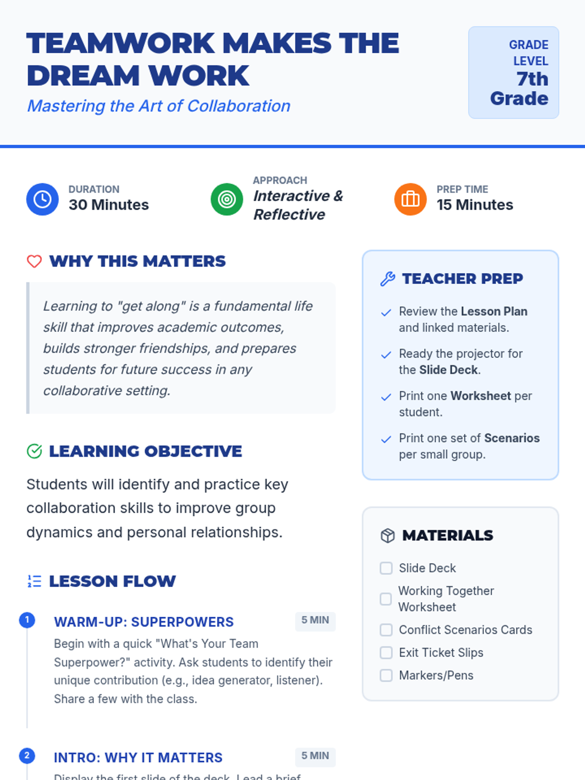 This lesson helps 7th-grade students understand and practice essential skills for getting along with others and working effectively in groups. It's crucial for fostering a positive classroom environment and real-world success. This single session will take approximately 30 minutes.
