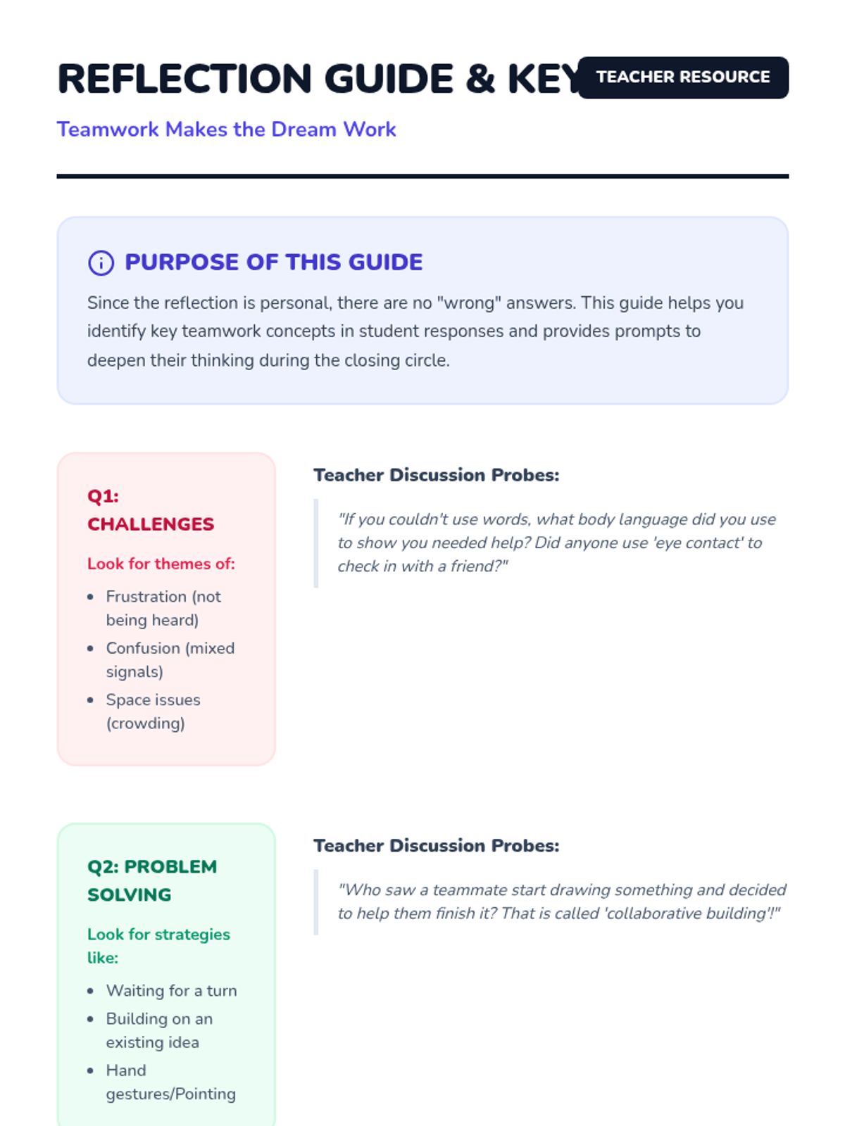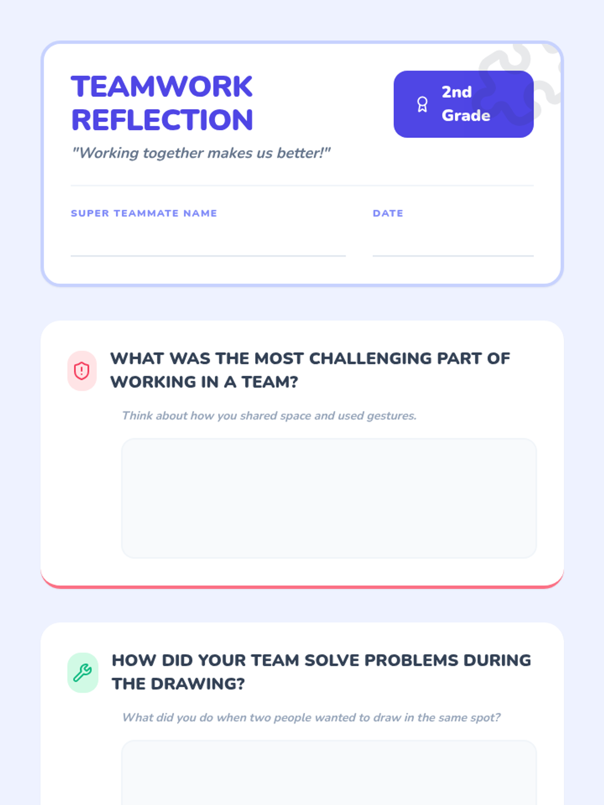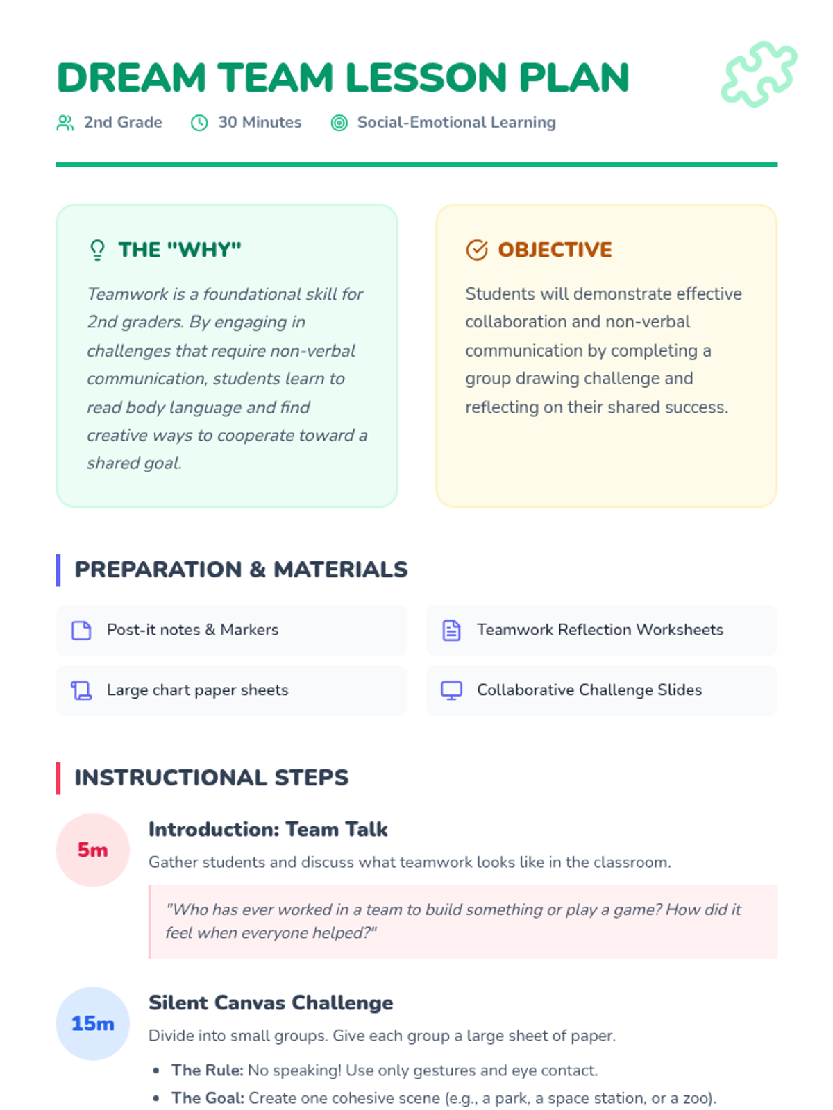 A lesson for 2nd graders to build teamwork and collaboration through non-verbal drawing challenges and reflection exercises.
