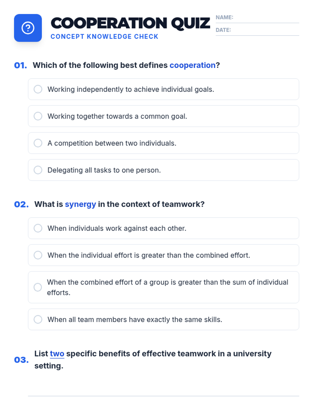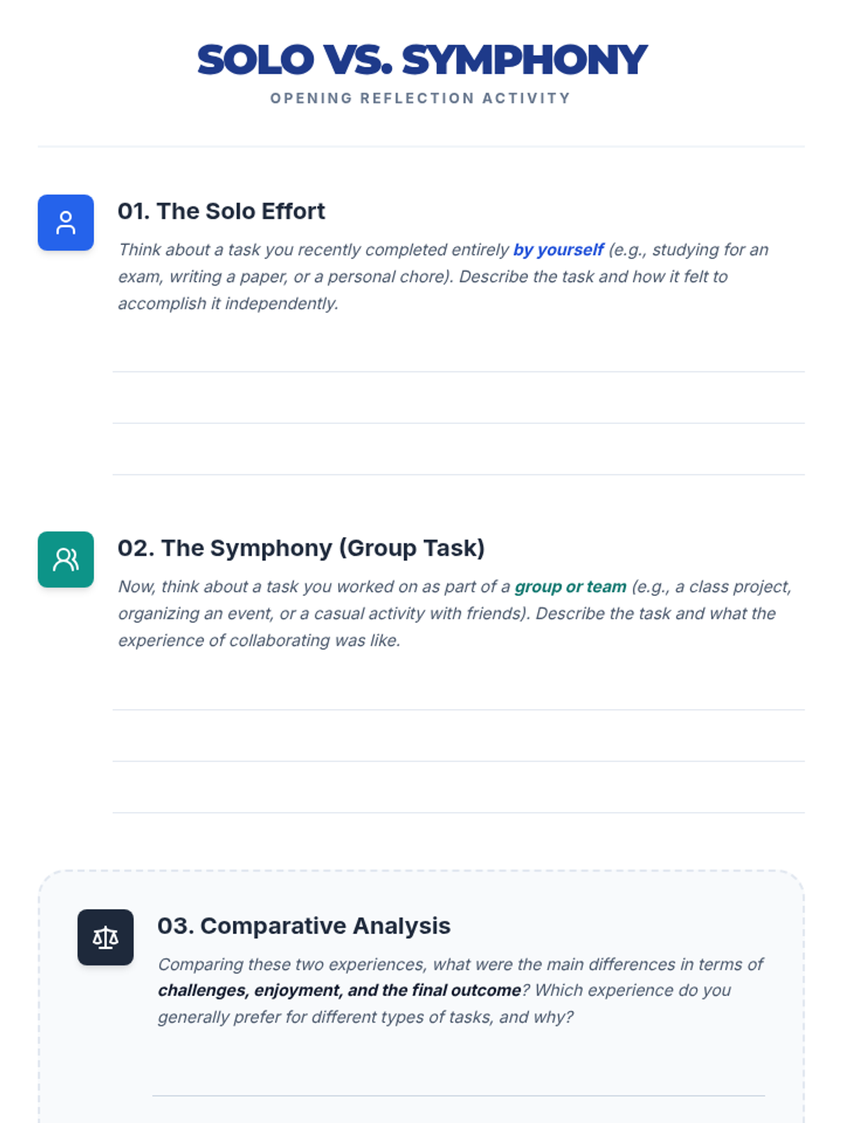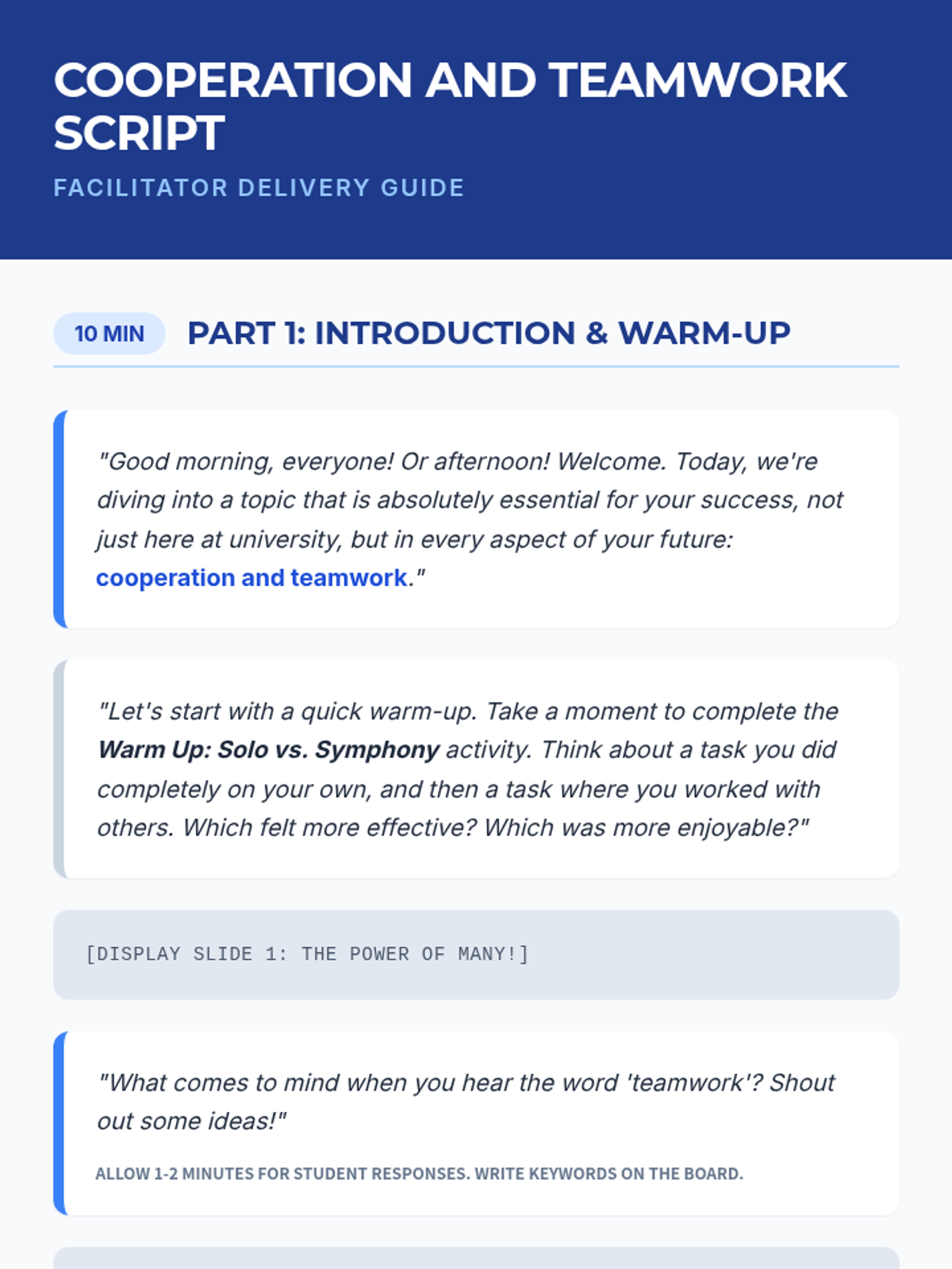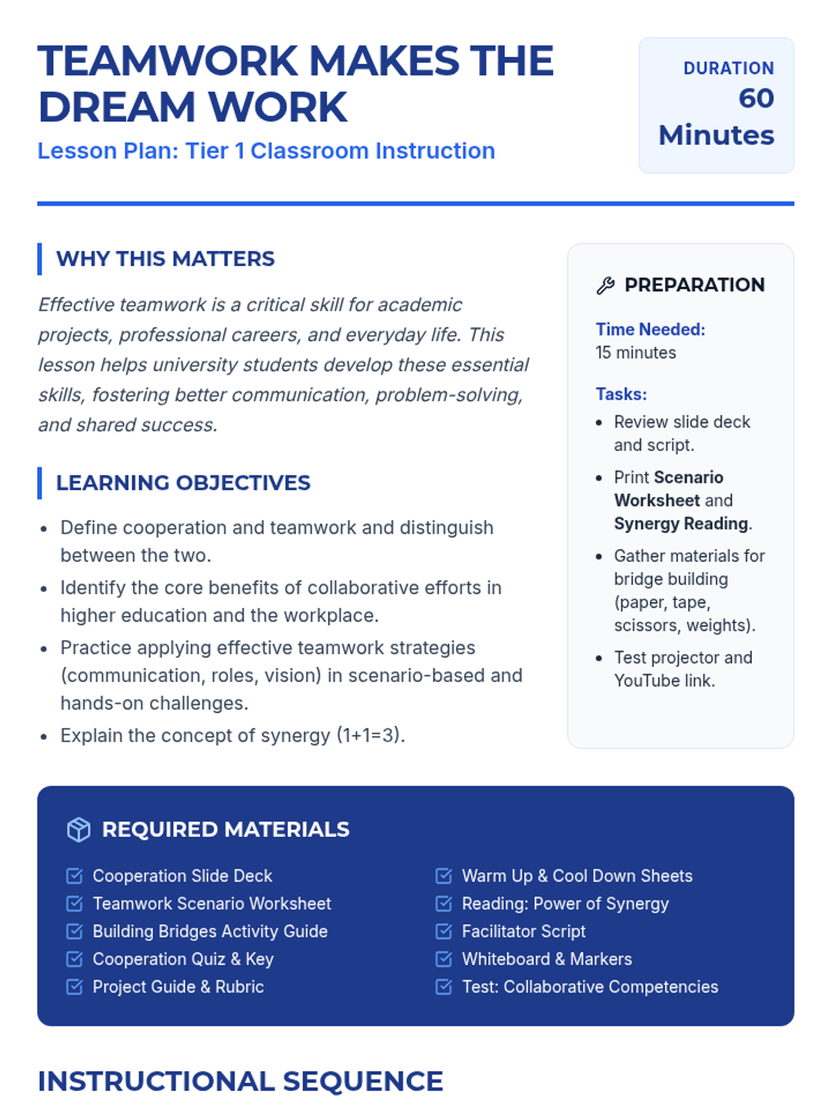 This lesson empowers university students with essential cooperation and teamwork skills through interactive discussions, hands-on activities, and reflective exercises. Over one hour, students explore definitions, the concept of synergy, and practical strategies for effective collaboration in academic and professional settings.