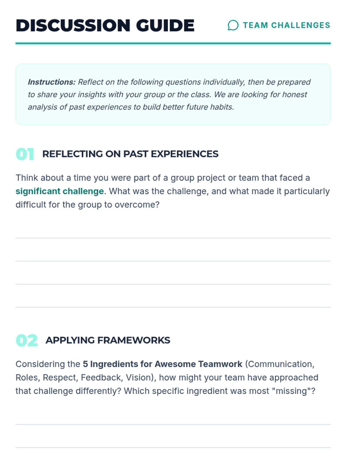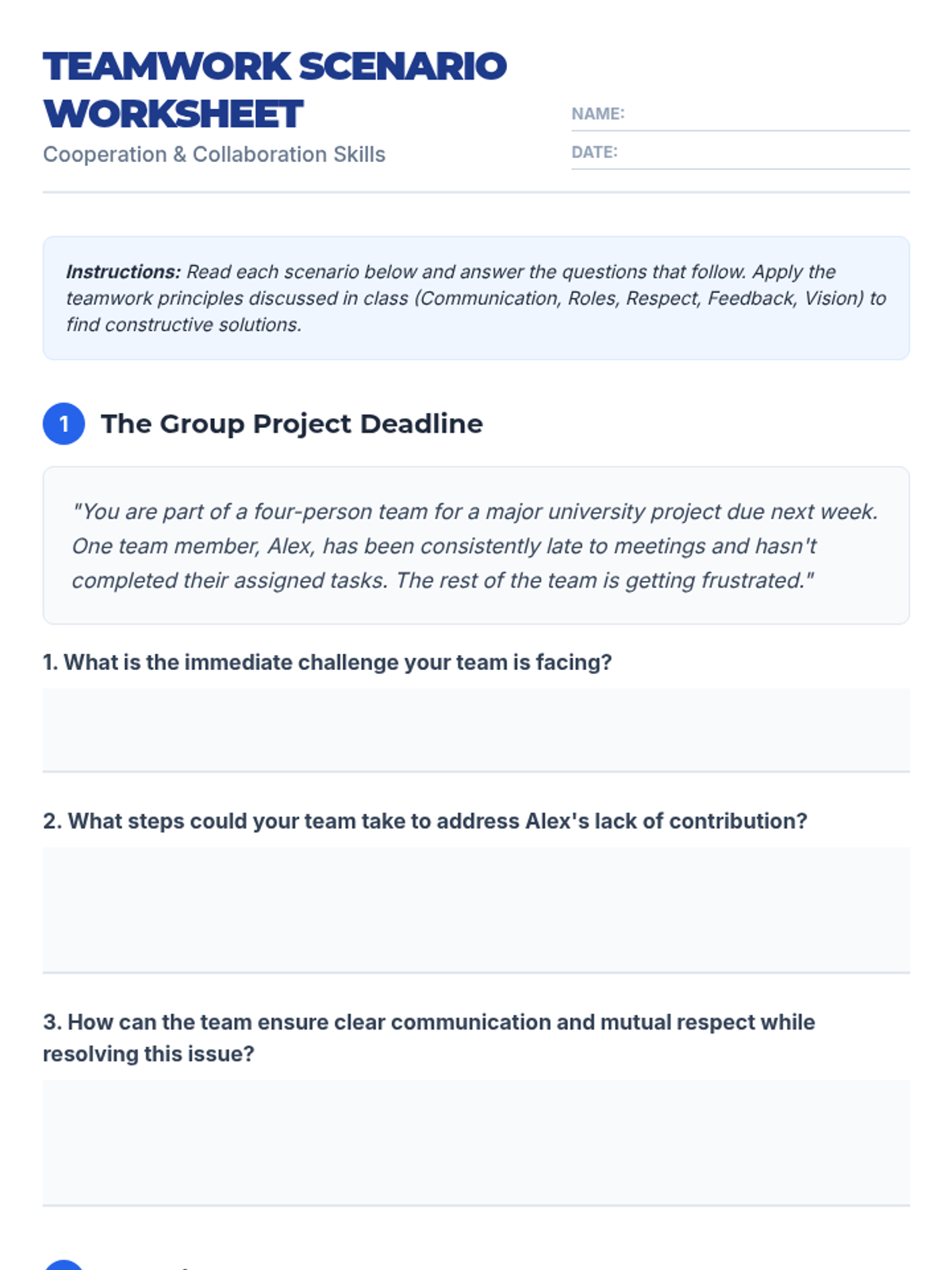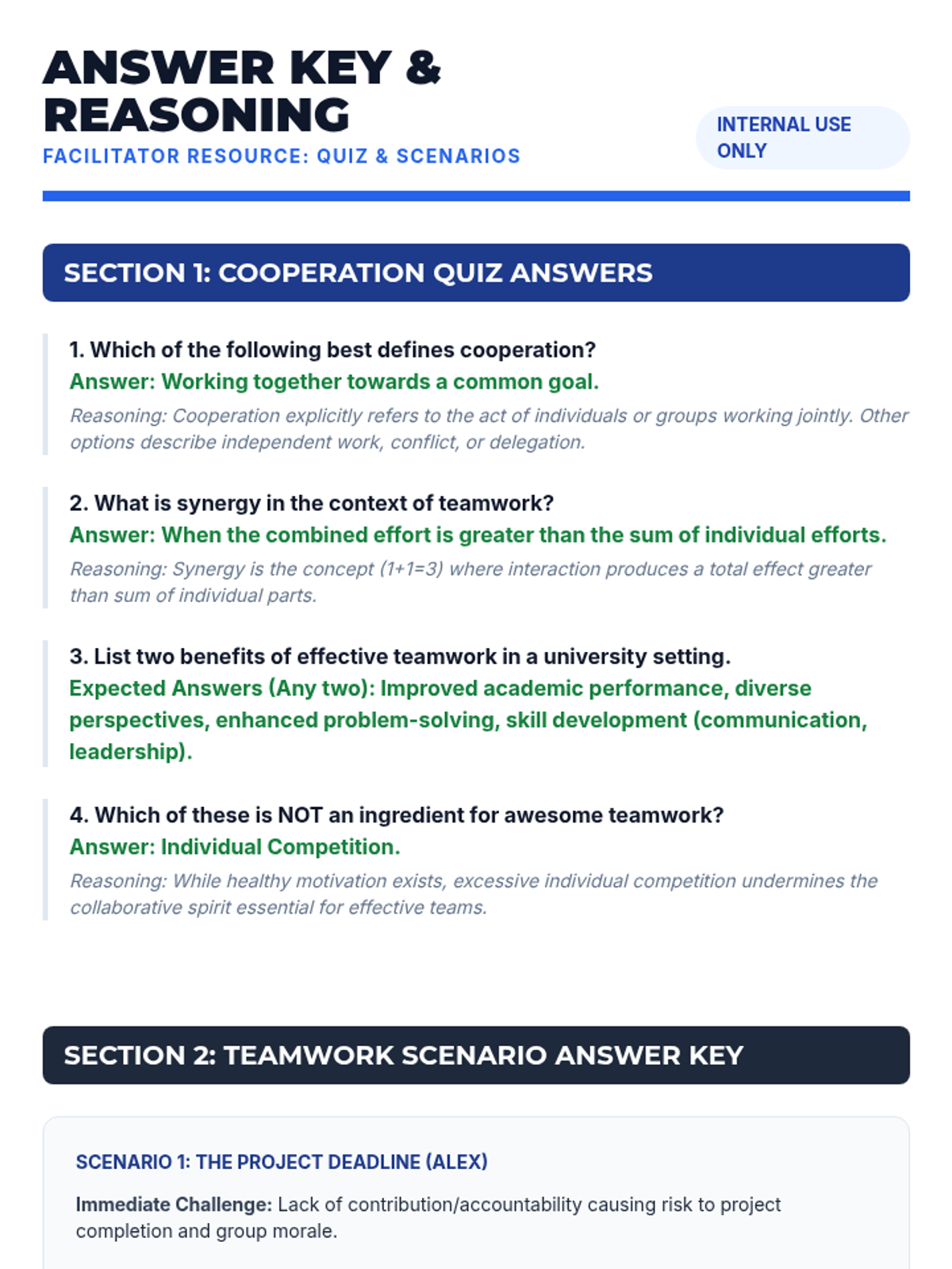 This lesson empowers university students with essential cooperation and teamwork skills through interactive discussions, hands-on activities, and reflective exercises. Over one hour, students explore definitions, the concept of synergy, and practical strategies for effective collaboration in academic and professional settings.